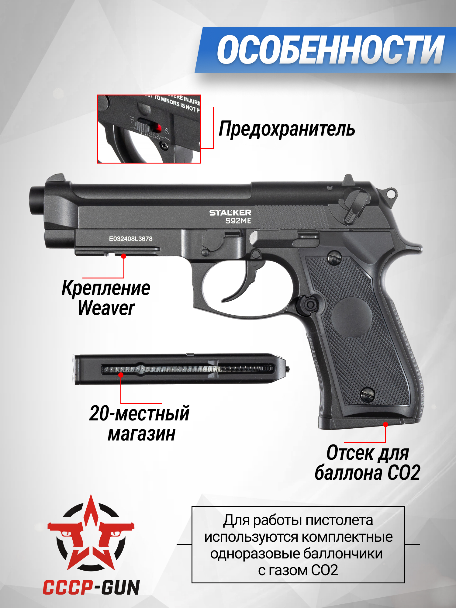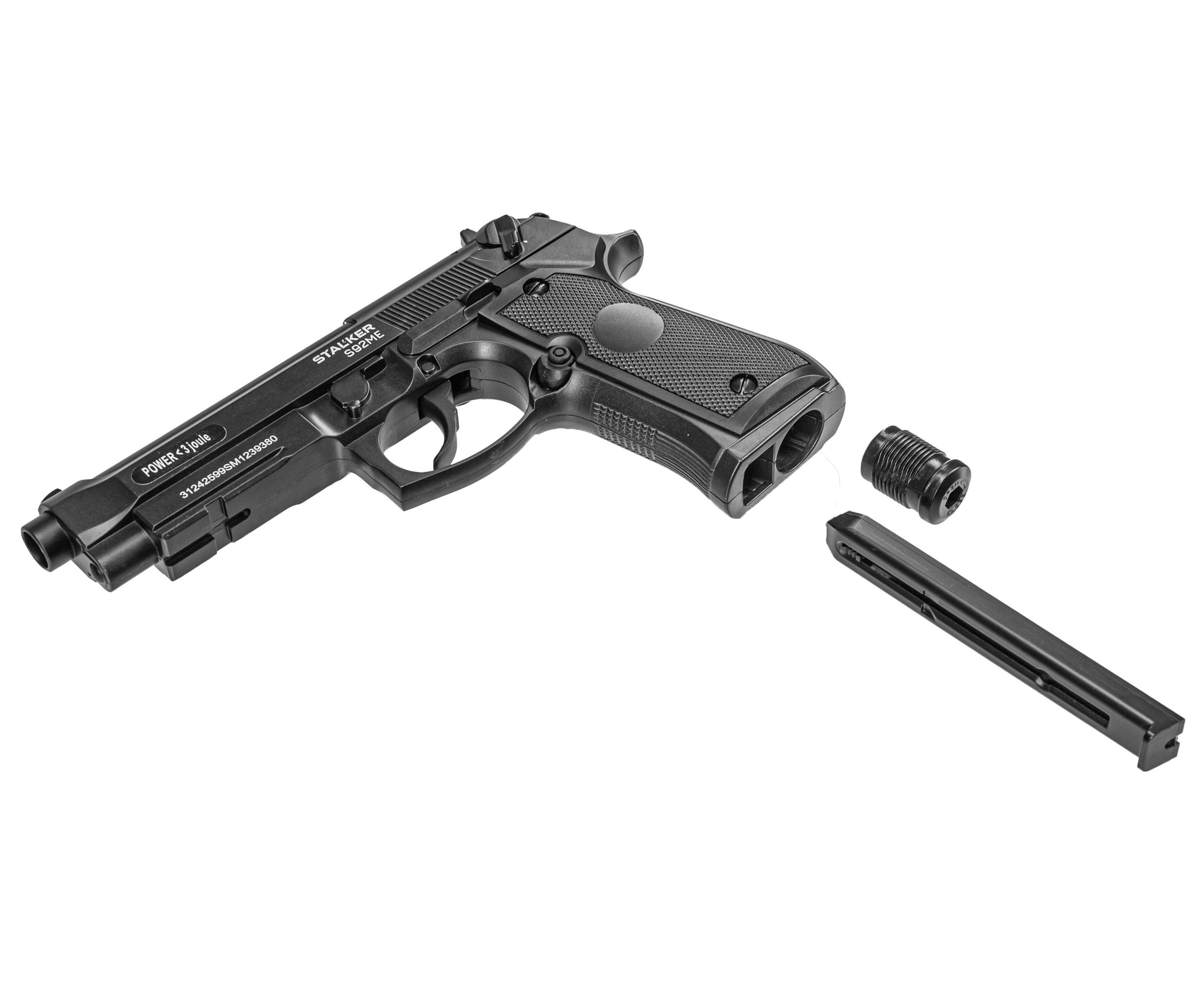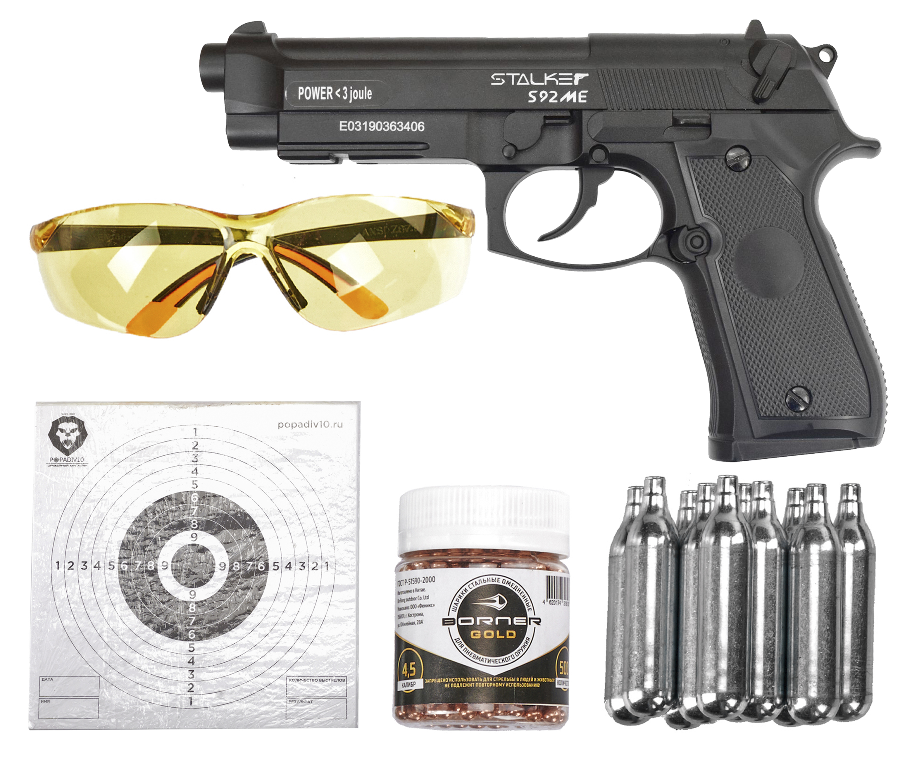 Обозреваемый S92ME Stalker пневматический пистолет, в котором для осуществления выстрела используется сила, образующаяся в процессе расширения газа углекислоты. Источником энергии в подобных моделях оружия выступают 12 граммовые CO2 баллончики, устанавливаемые перед началом стрельбы в рукоять через отверстие в ее основании. Комплект Хантер номер 2 включает в себя набор из десяти баллонов, чего с запасом хватит для проведения нескольких активных тренировок.