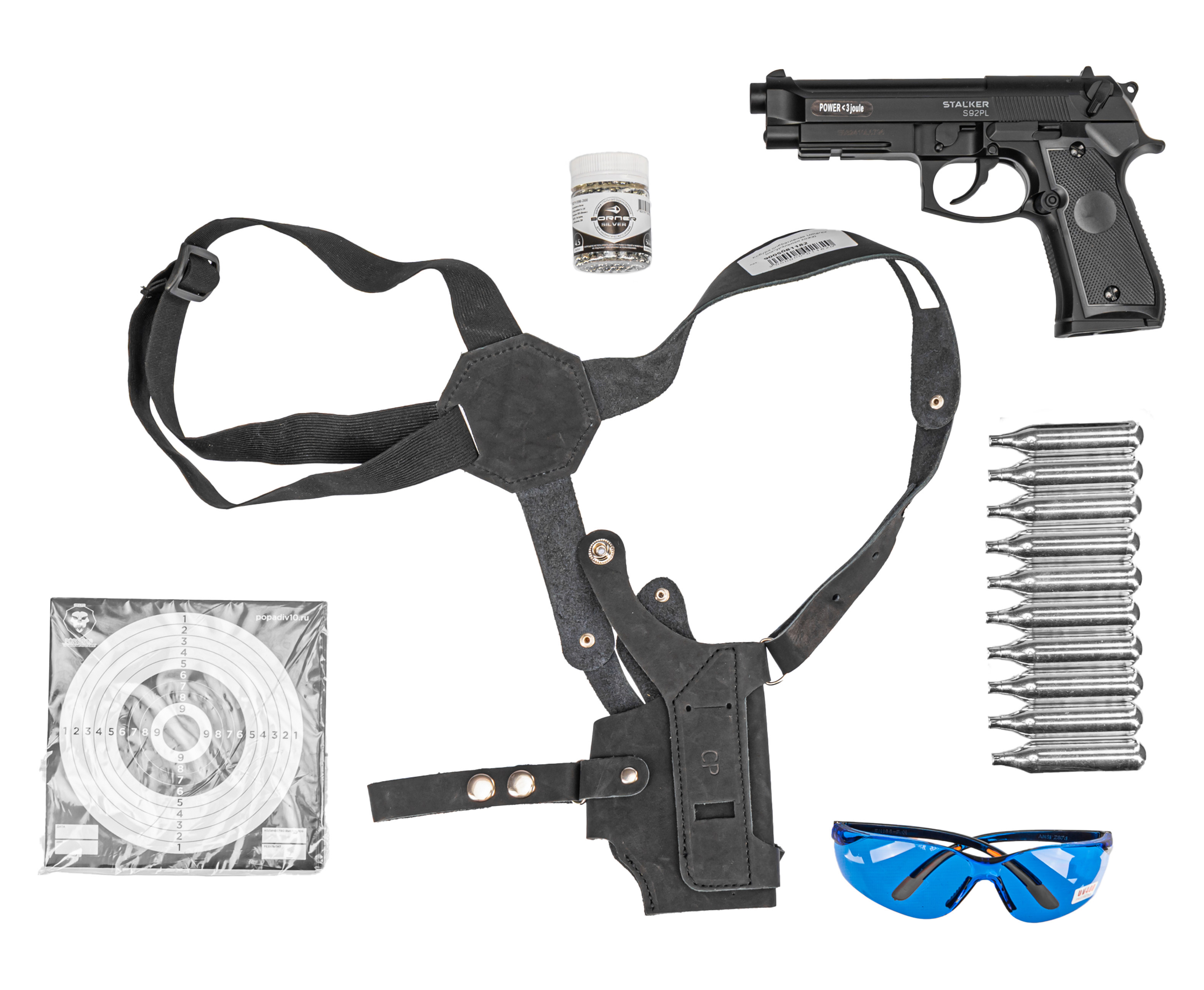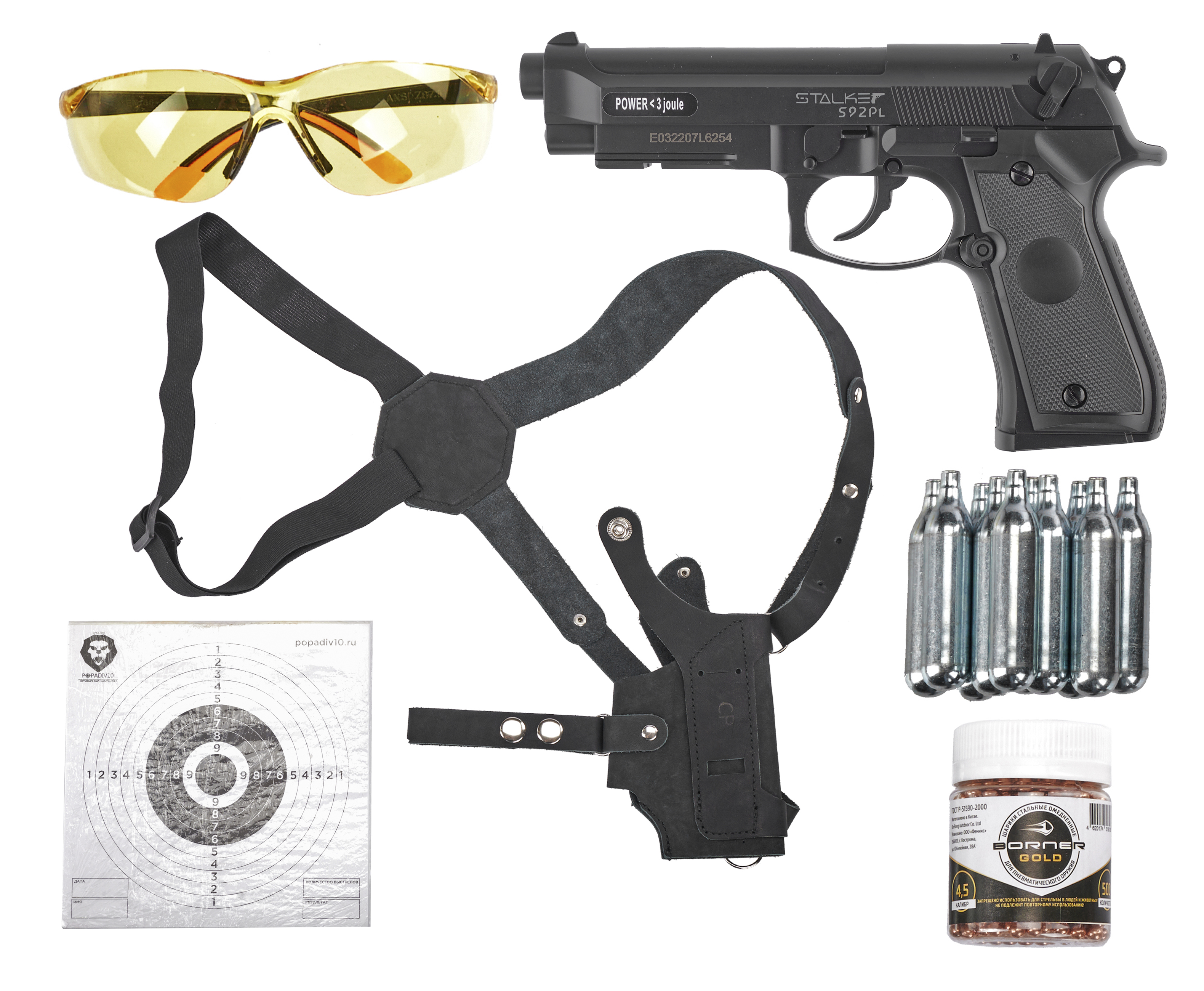 Кроме упомянутых элементов комплект Stalker S92PL Beretta 4 5 мм Hunter Set No3 включает в себя упаковку из пятидесяти картонных мишеней, очки для защиты органов зрения, а также оперативную кобуру для безопасного ношения пистолета по месту проведения стрельб и тренировки быстрого извлечения оружия с последующим поражением обозначенных целей.