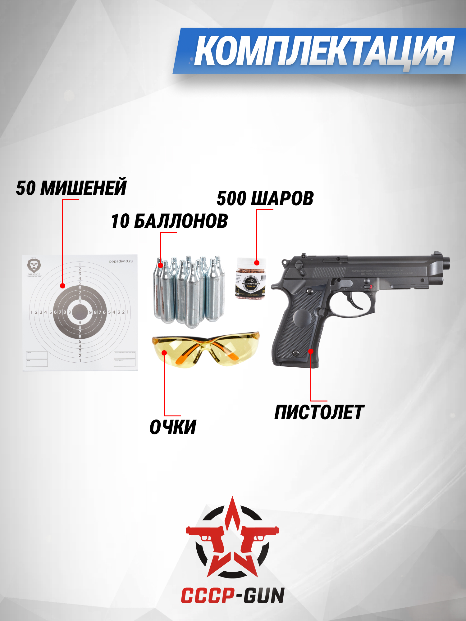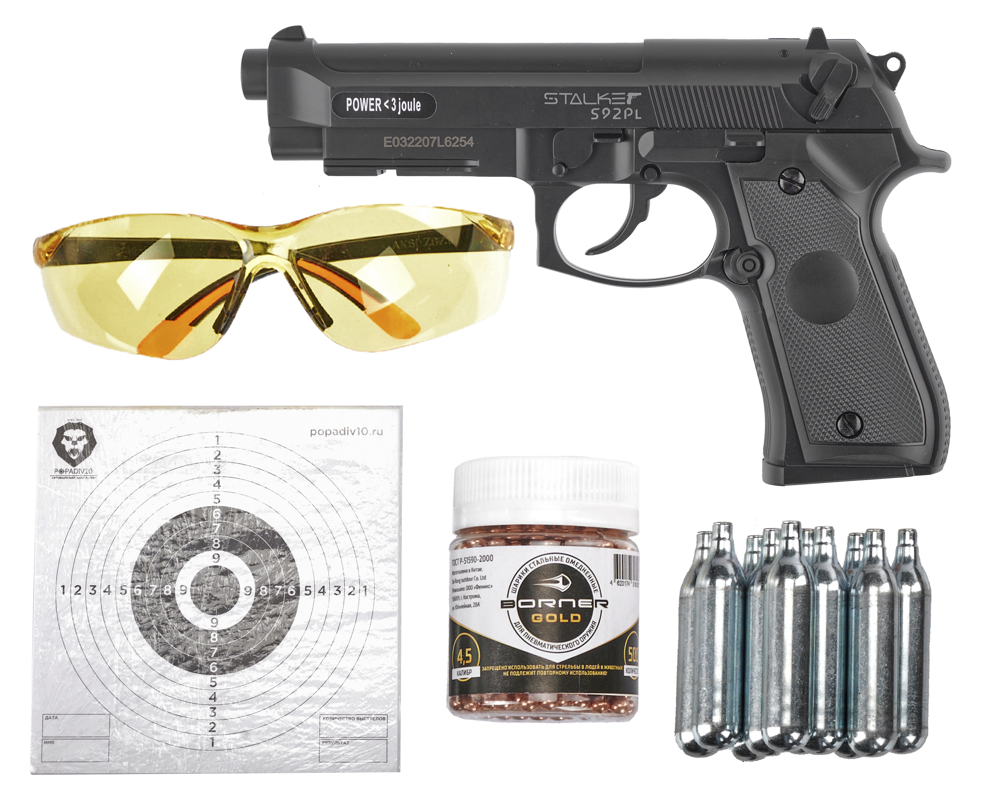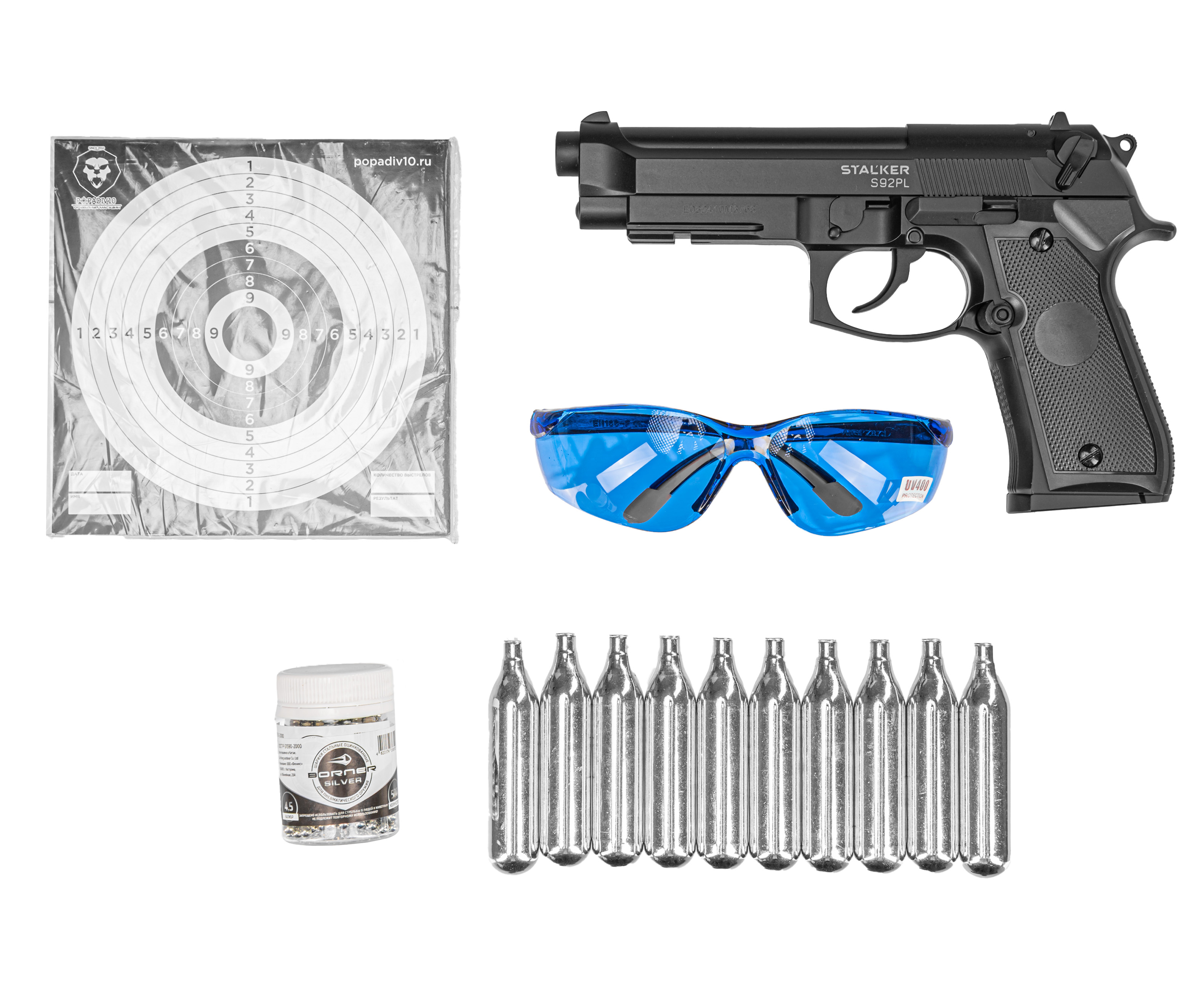 Требуется отметить, что представленный подарочный набор включает в себя все необходимые элементы для быстрого начала в освоении пневматики. Наличие 10 CO2 баллончиков, баночки с шариками, упаковки мишеней и защитных очков не только исключает необходимость самостоятельного подбора подходящей «сопутки», но и защищает пользователя от случайных покупок несоответствующих принадлежностей.