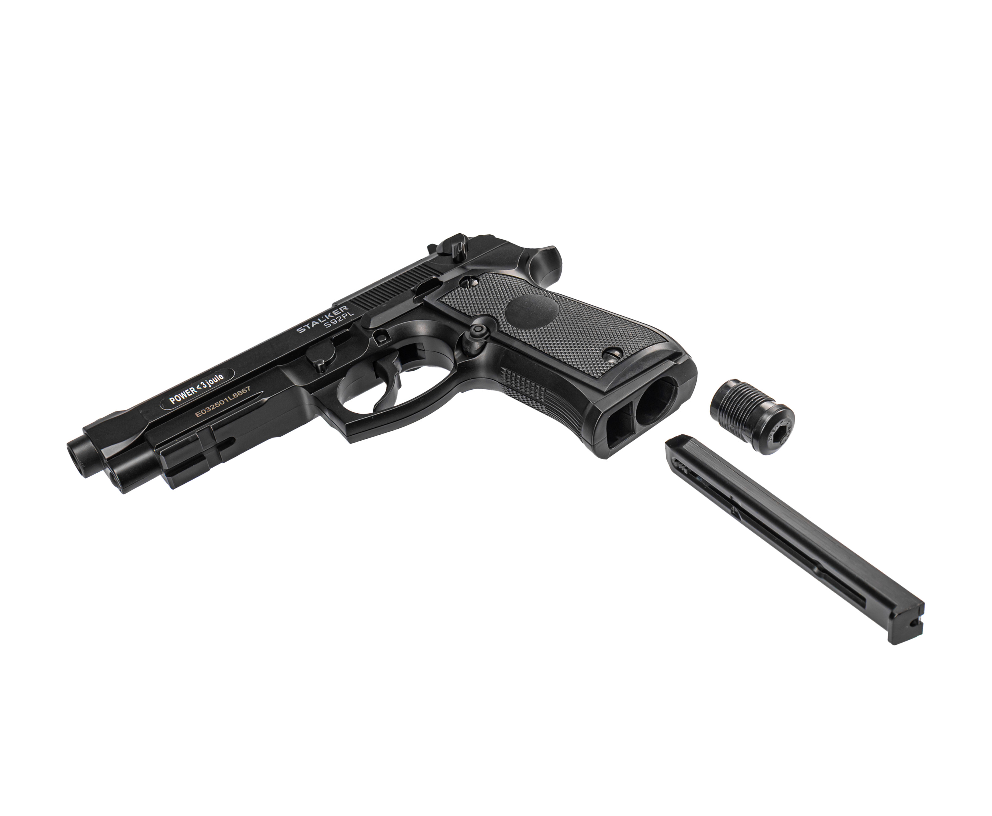 Для боепитания стандартными сферическими пулями калибра 4.5 миллиметра пневматический пистолет Stalker S92PL 2 комплектуется универсальным однорядным магазином, рассчитанным на двадцать мест.