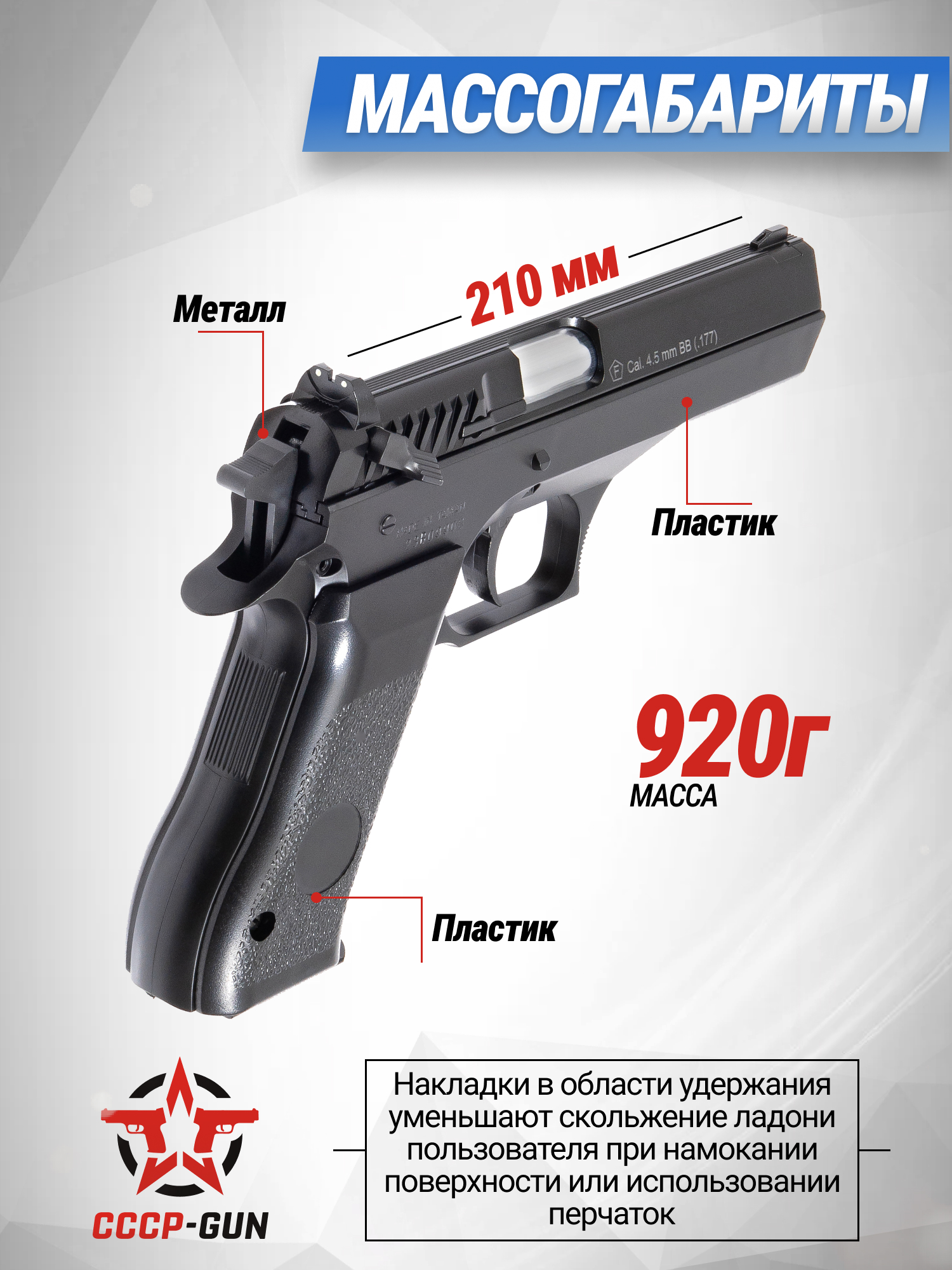 Стрельба из рассматриваемой модели ведется шариками из стали под калибр 4.5 миллиметра, заряжающиеся в магазин на 21 снаряд. Указанные пули относятся к распространенным боеприпасам для пневматики, поэтому пользователю не составит трудности пополнить их количество, более того в комплекте с пистолетом уже приложен пакет на 250 шаров. Извлечение магазина происходит после нажатия на кнопку сброса с левой стороны рукояти, а для ускорения перезарядки в наборе присутствует специальный фаст-лоадер.