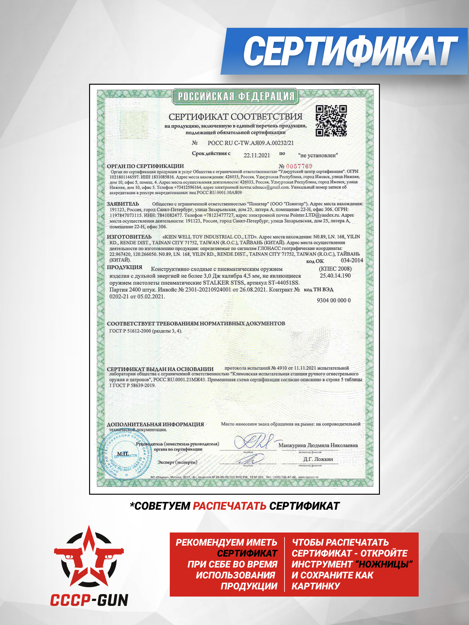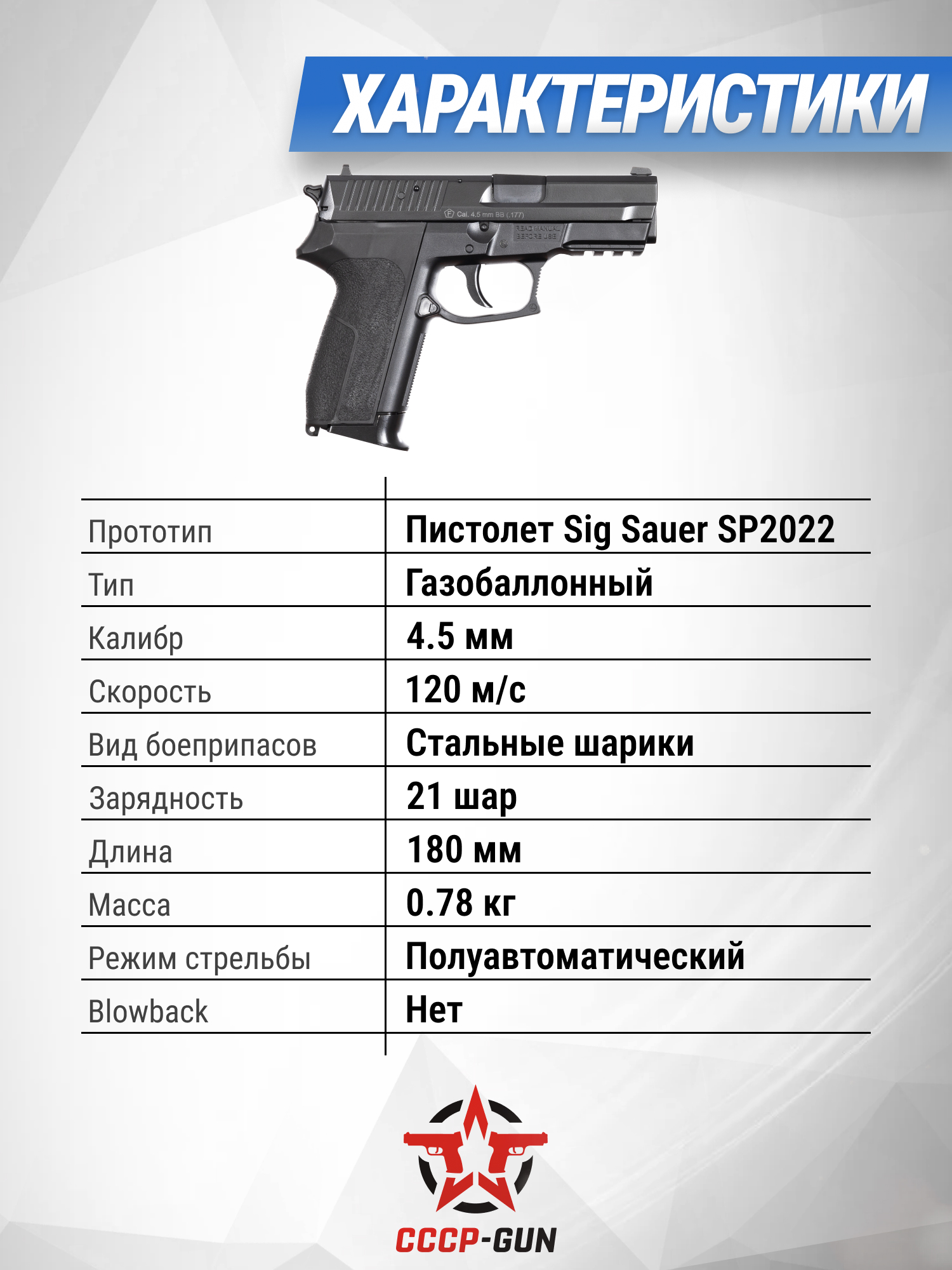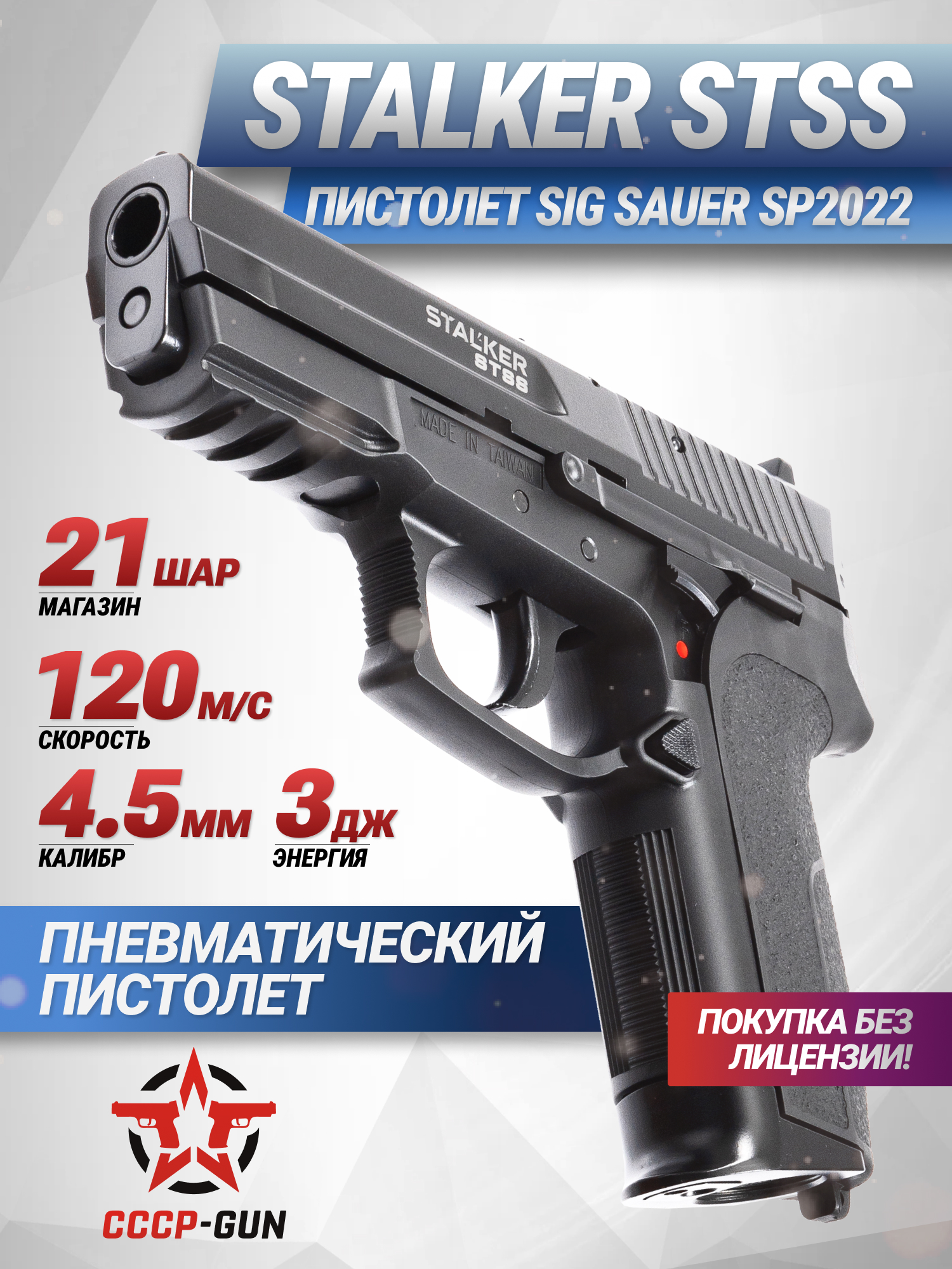 Stalker ST-44051SS Sig Sauer SP2022 продается в свободной форме, так как энергия при выстреле не переходит значения в три Джоуля, что подтверждается сертификатом и полностью соответствует российскому законодательству. Благодаря этому покупателям не нужно оформлять лицензию на оружие, что делает изделие доступным для новых пользователей. Скорость, с которой шариковый боеприпас вылетает из пневматики, составляет порядка 120 метров в секунду, чего будет достаточно для развлекательной стрельбы и плинкинга.