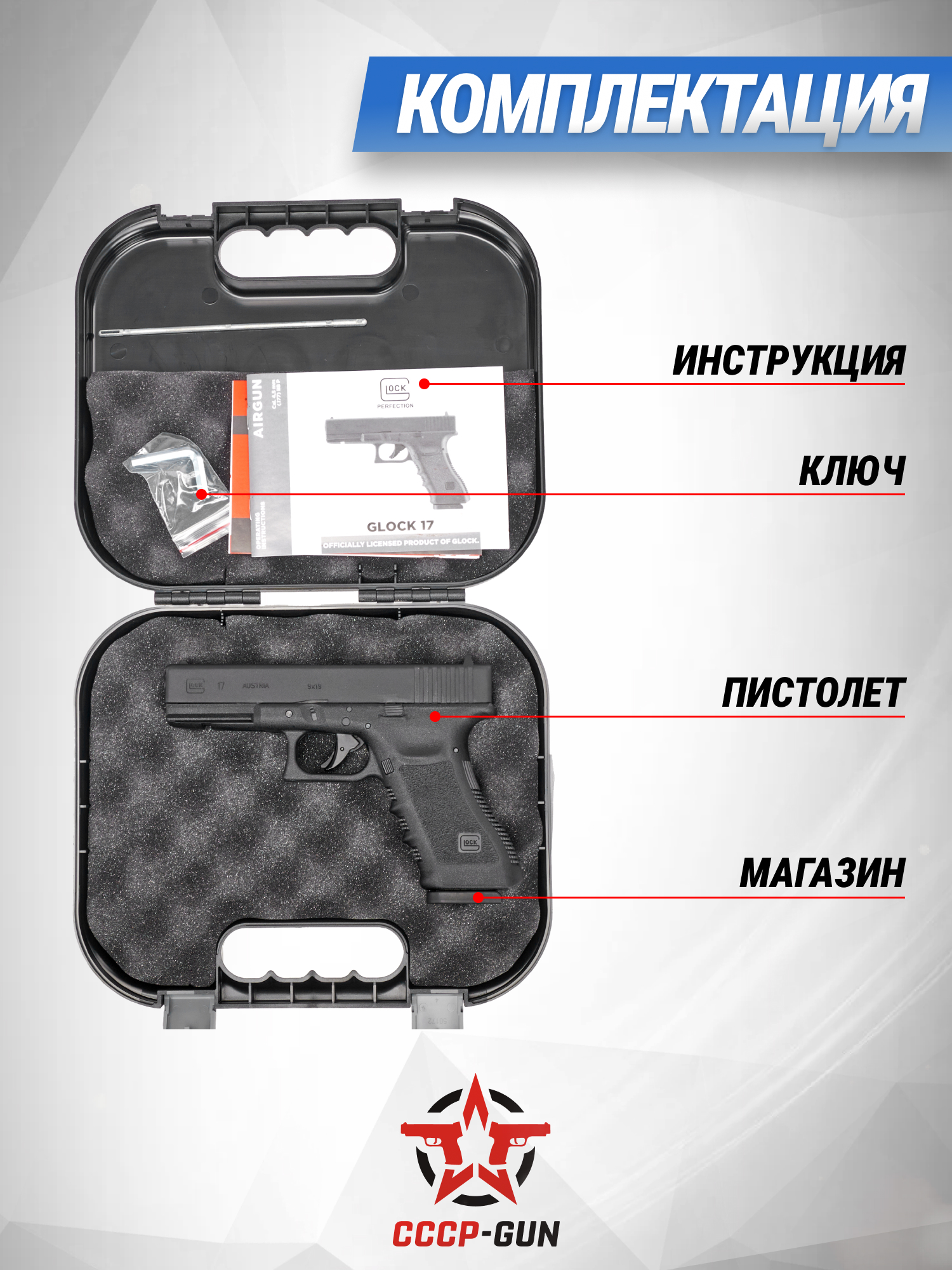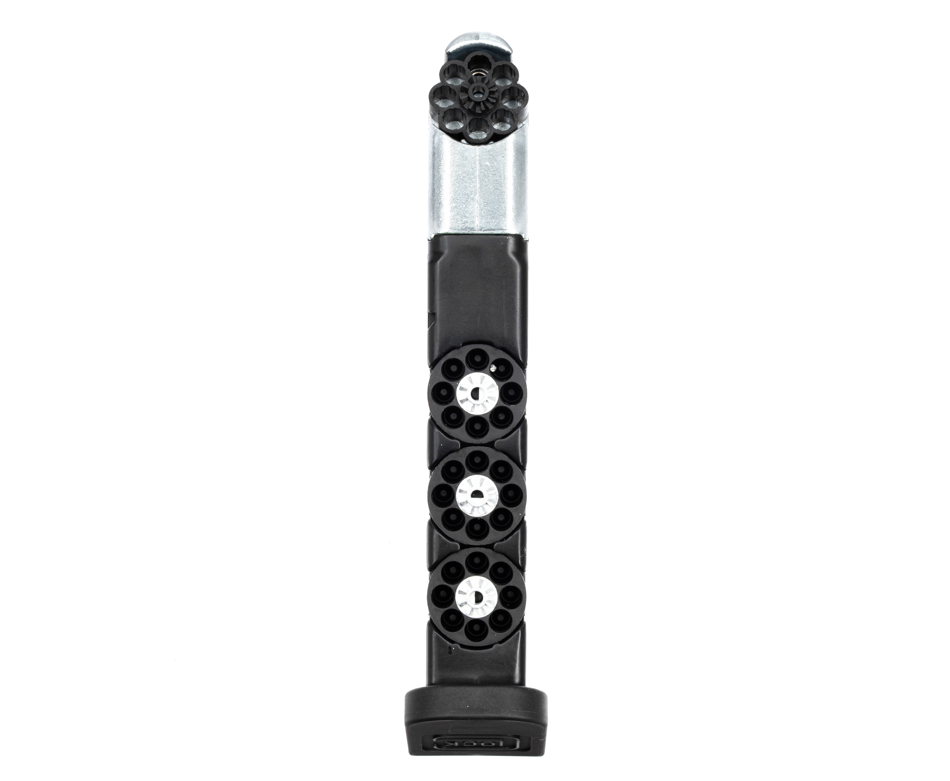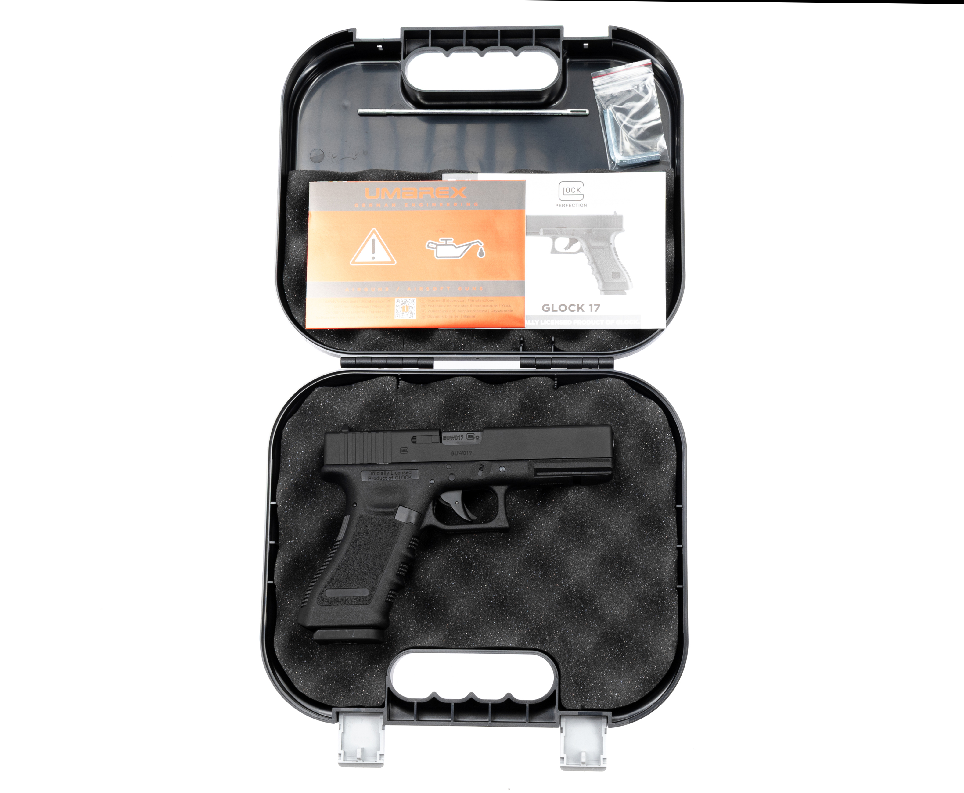 Для стрельбы Umarex Glock 17 использует легкие воланчиковые пули, которые набирают скорость, разгоняясь по нарезному 113-миллиметровому стволу калибра 4.5 миллиметра. Магазин оснащается боеприпасами через специальные 8-слотовые картриджи, а для перезарядки спроектирована классическая кнопка сброса. Таким образом пользователю доступно восемь выстрелов с опцией быстрой смены барабанчиков, поскольку в комплекте таких элементов добавлено сразу четыре единицы.