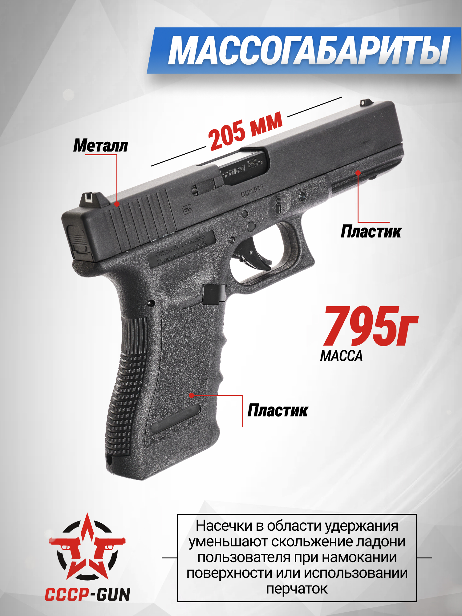 Представленное изделие создано в коллаборации с известной компанией Glock, благодаря чему фирма Umarex добилась высокого соответствия модели по внешнему виду и массе. Как и у боевого прототипа, рамка пистолета изготовлена из ударопрочного полимера, при этом затворная рама выполнена из металлического сплава, что добавляет аутентичности образу пневматики. По этой причине полный вес рассматриваемого экземпляра составляет 0.795 кг, а габариты равны 205x30x140 мм.