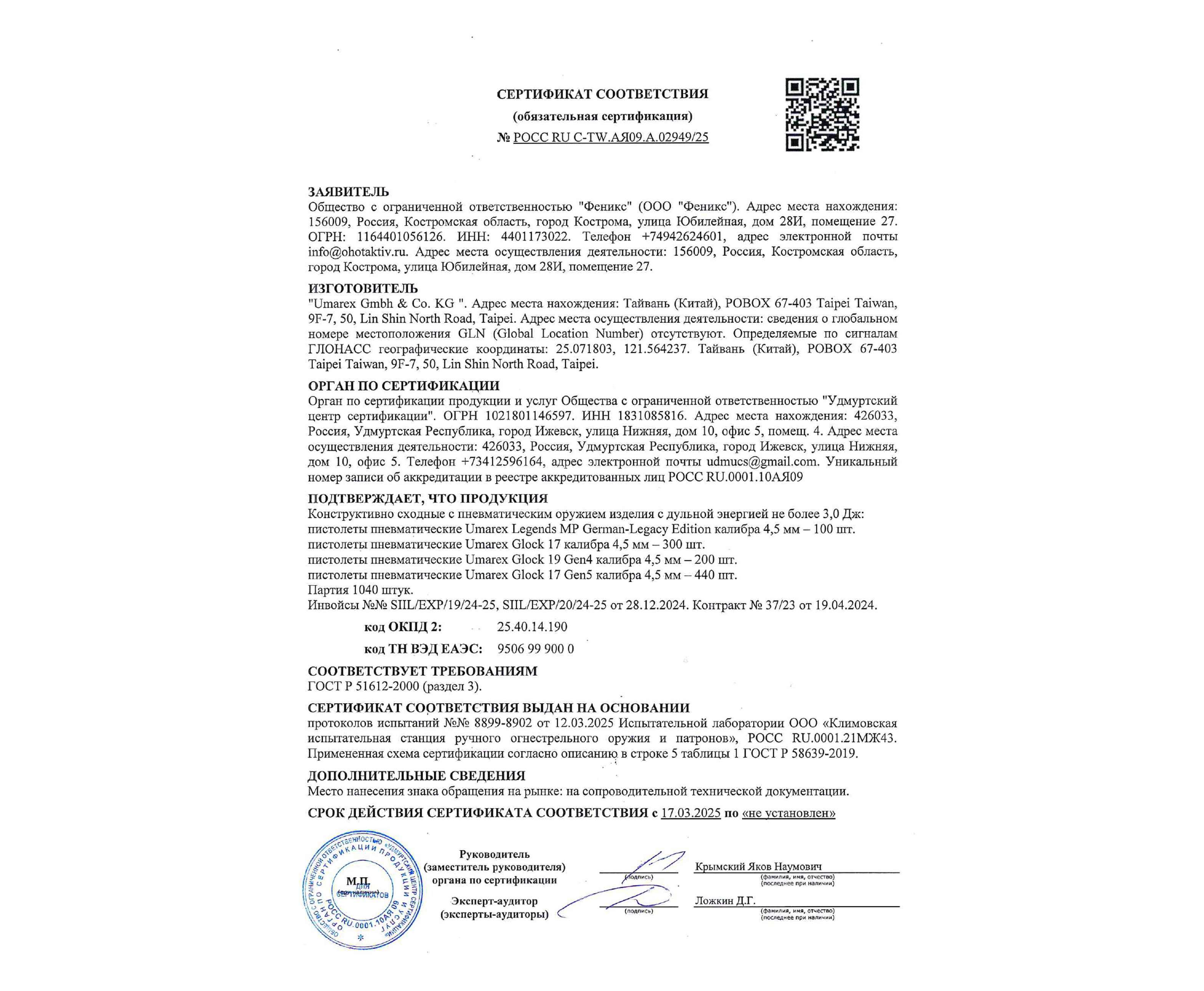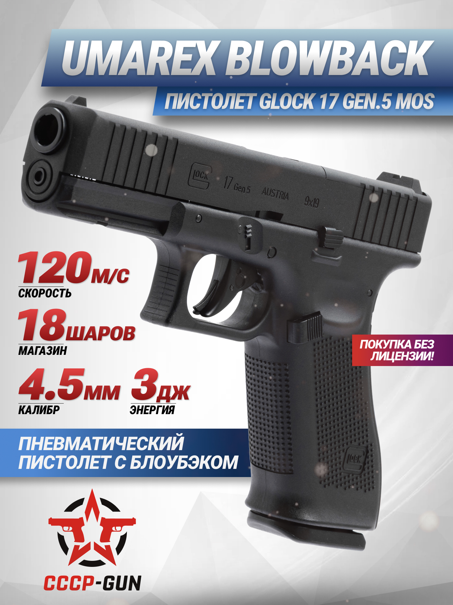 Скорость полета снарядов достигает 120 метров в секунду, поэтому модель подходит для тренировок обращения с оружием и развлекательной стрельбы. На территории России пистолет продается свободно без требования разрешения от Росгвардии, так как дульная энергия Umarex Glock 17 Gen 5 не превышает 3 Дж. Для повышения безопасности предусмотрен предохранитель автоматического плана на спусковом крючке и ручной под стволом.