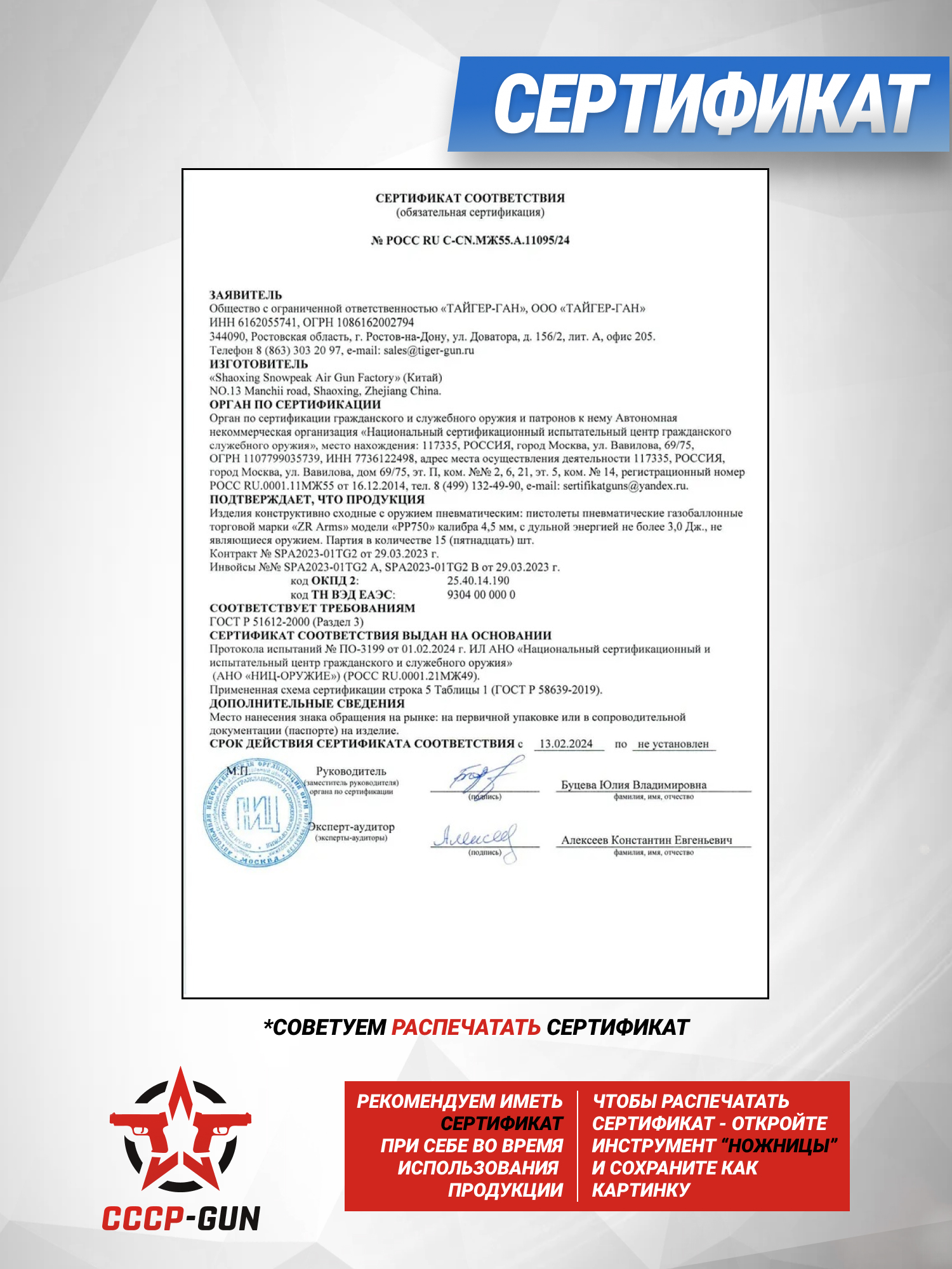 Пневматический пистолет ZR Arms PP750 5.5 мм (приклад, ПСП)