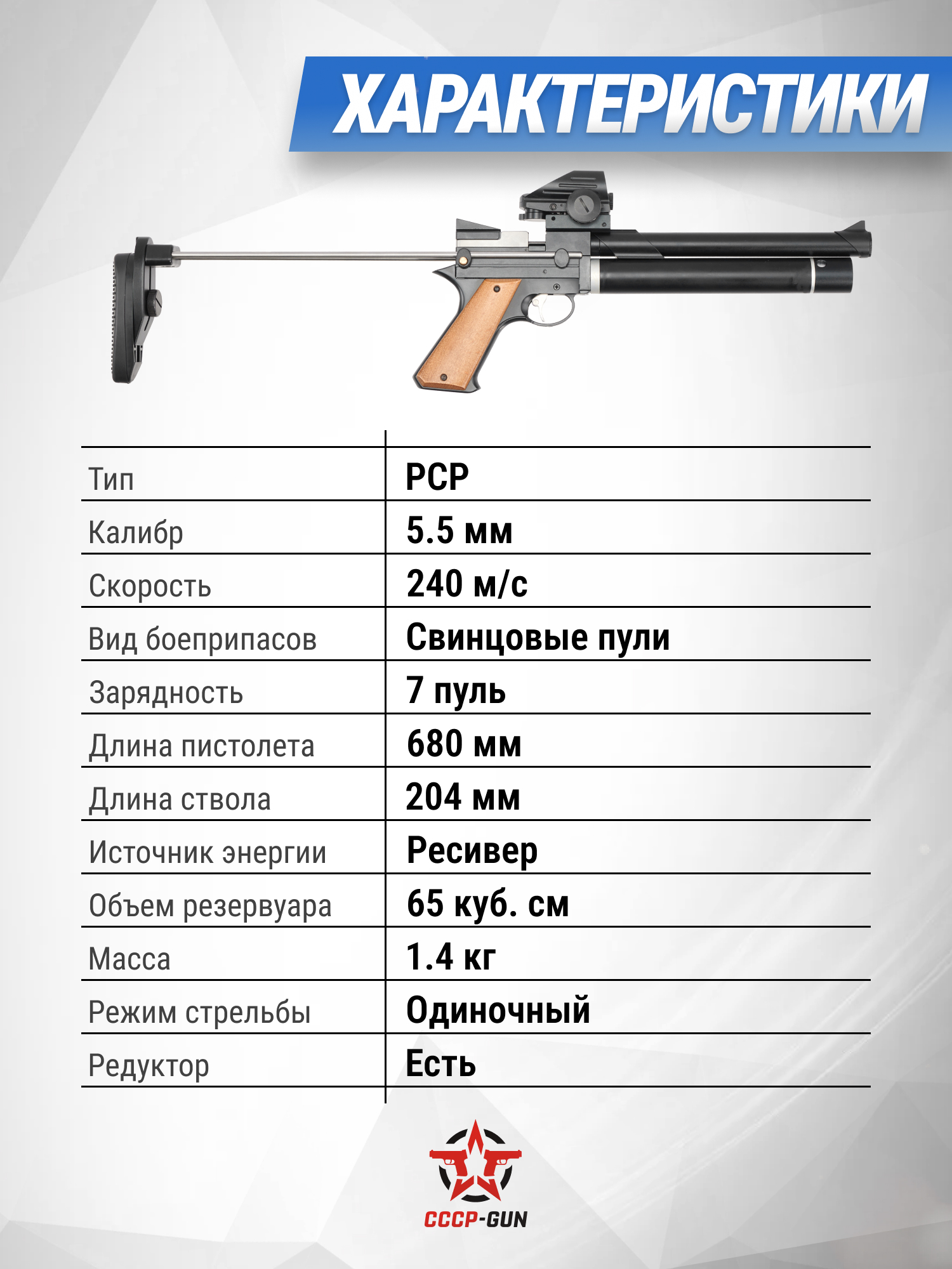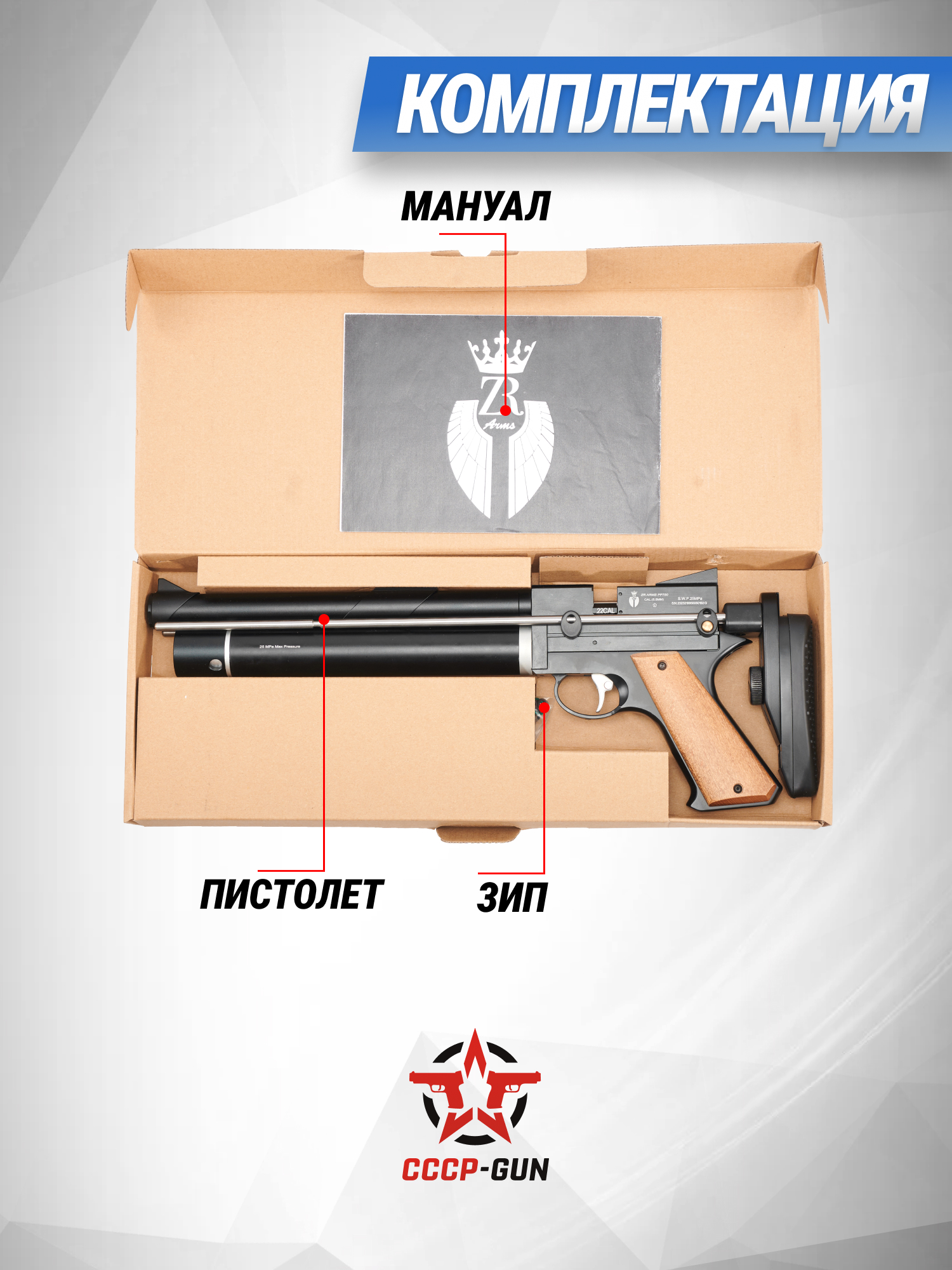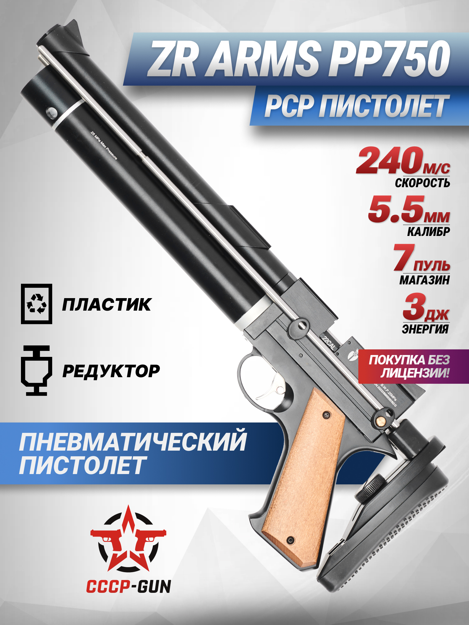 Пневматический пистолет ZR Arms PP750L 5.5 мм (приклад, PCP)