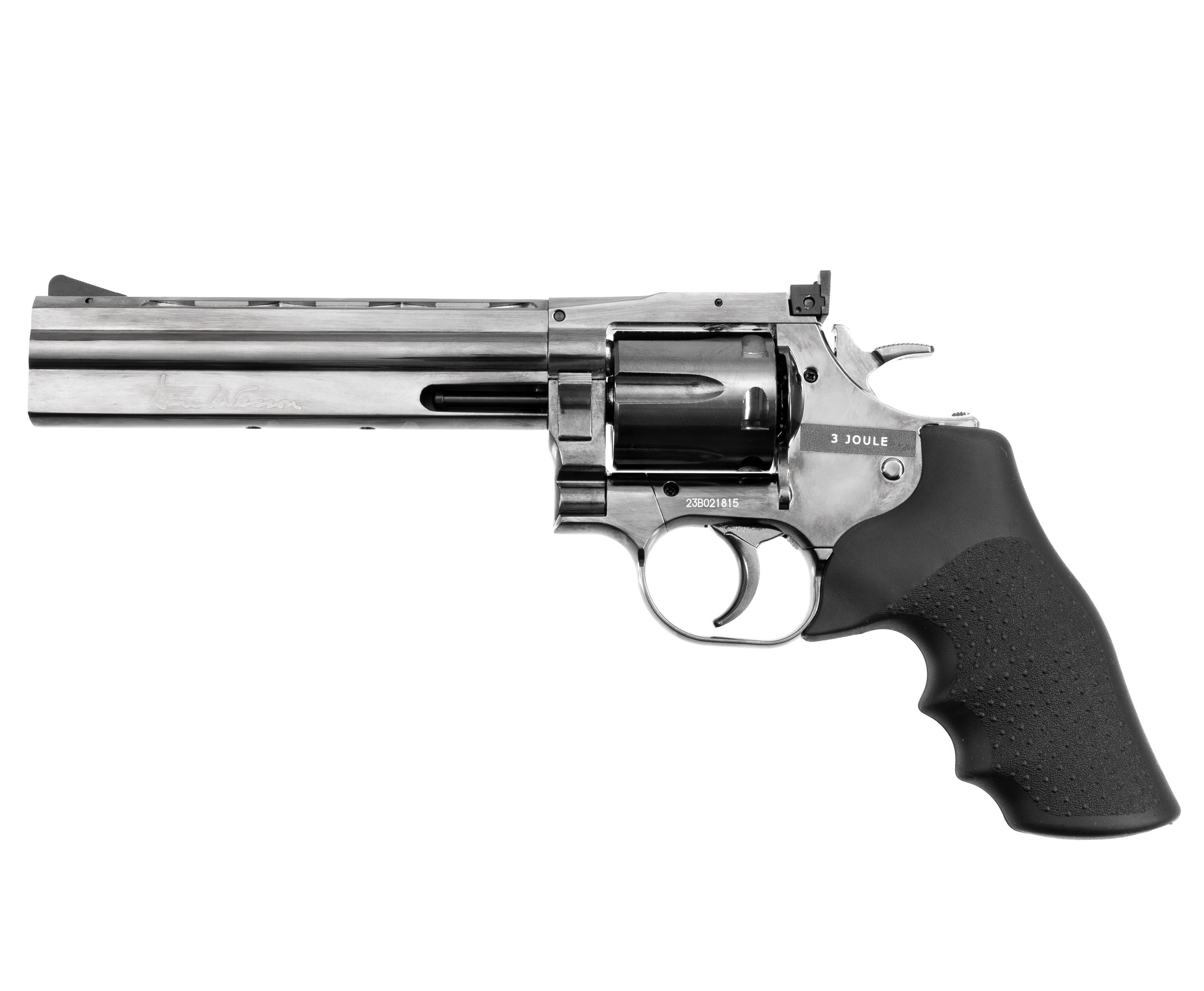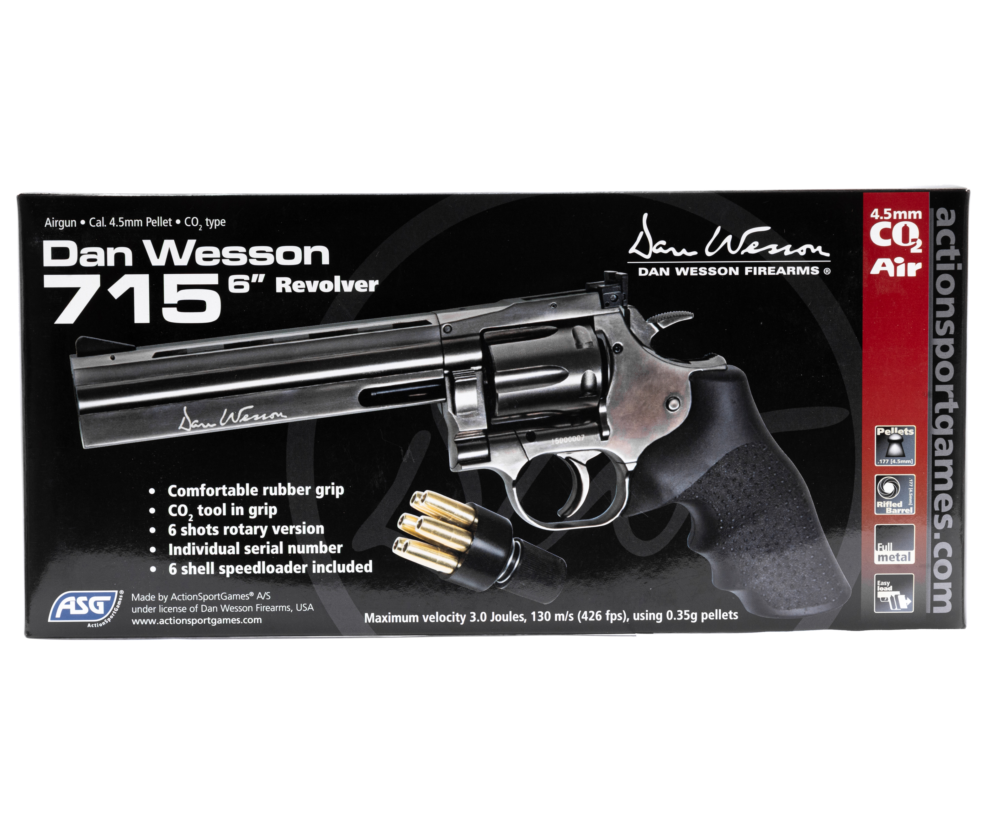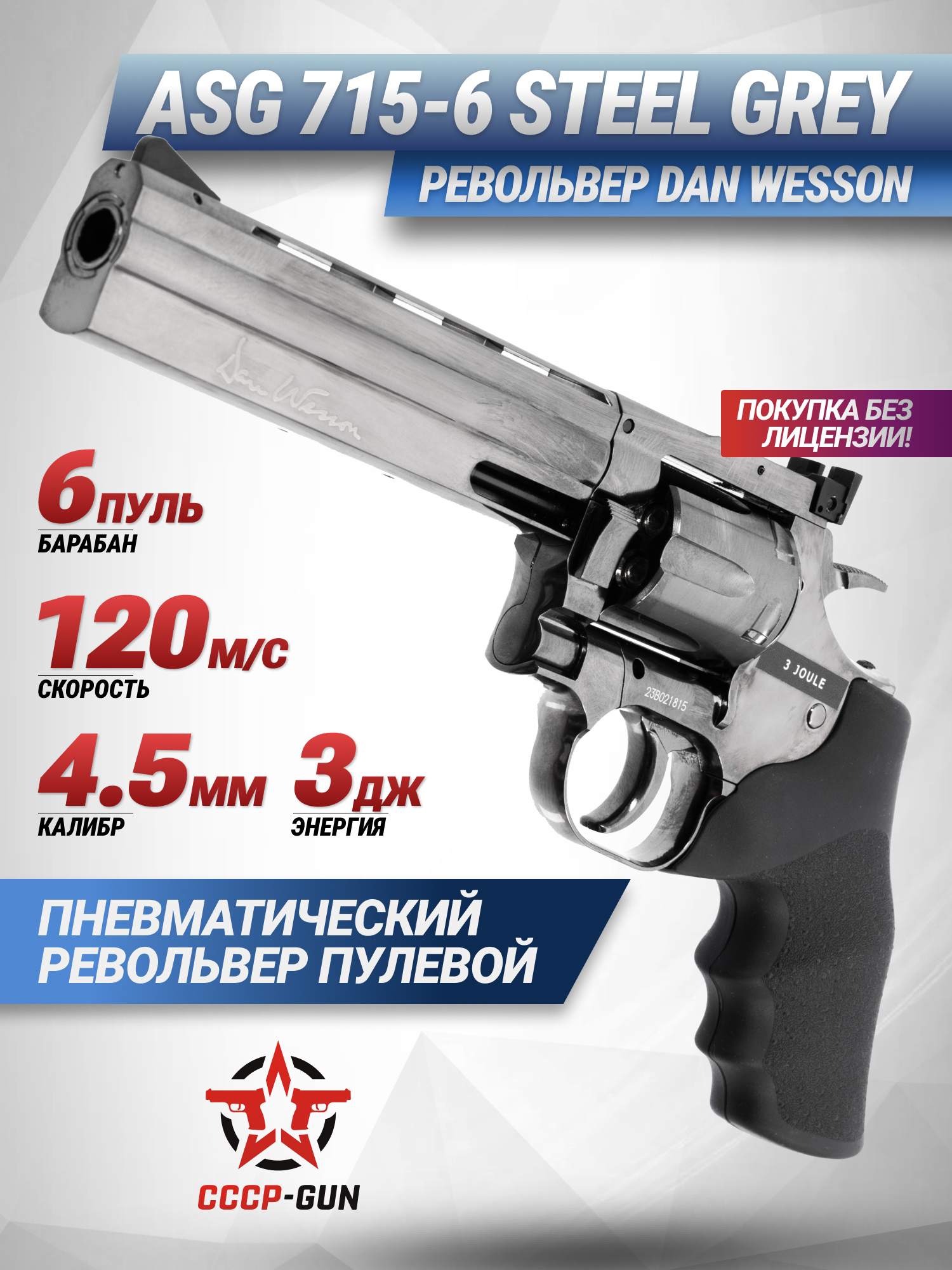 Модель Dan Wesson 715 6 Steel Grey от ASG производится с дульной энергией до 3 Джоулей, поэтому на территории России распространяется свободно, не требуя наличия оружейной лицензии у покупателя. Таким образом, приобретать револьвер могут не только опытные стрелки, но и начинающие пользователи или коллекционеры, собирающие интересные экземпляры пневматики с реалистичным визуалом. Чтобы использовать изделие было комфортнее, рукоять оснастили прорезиненным противоскользящим слоем.