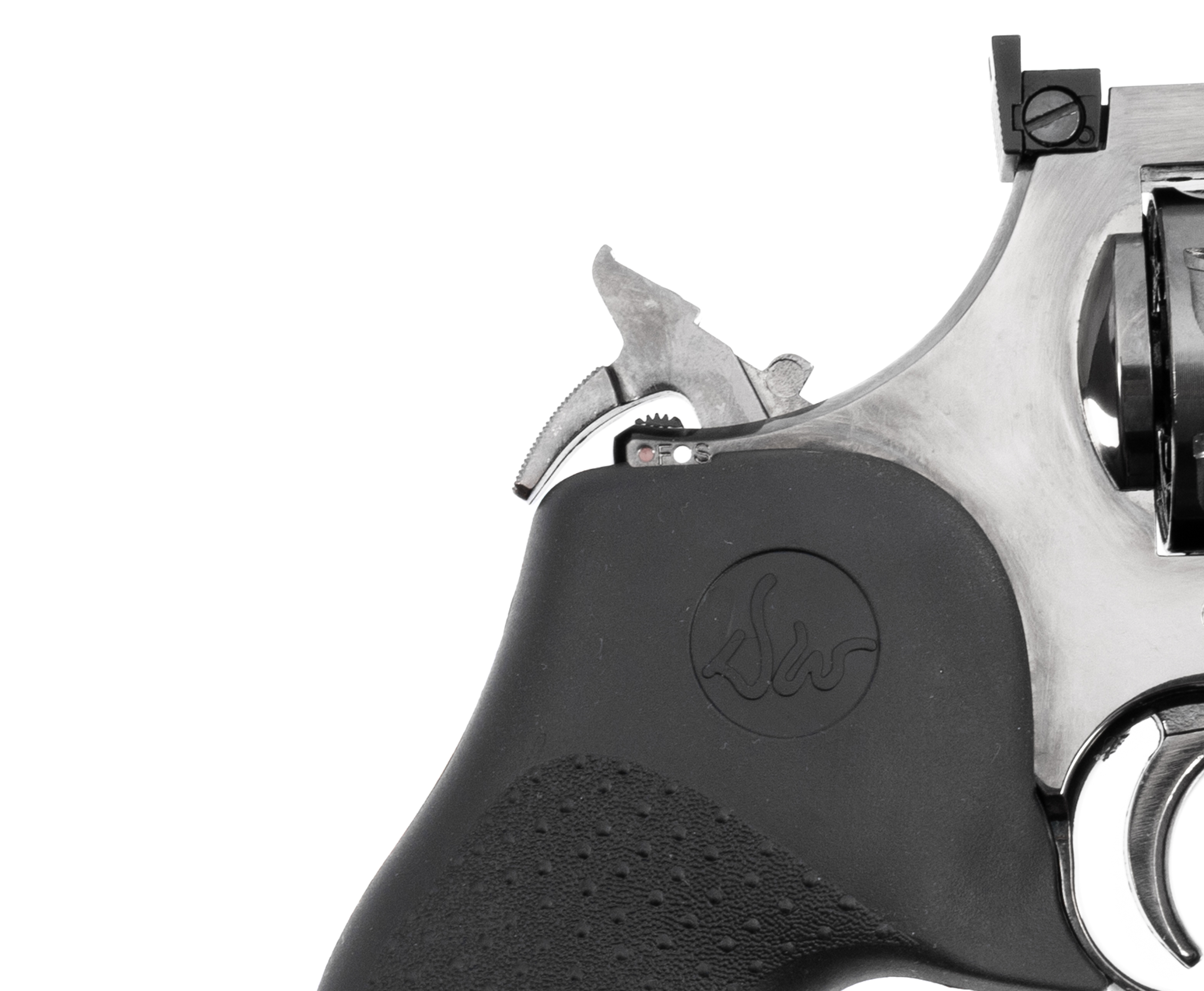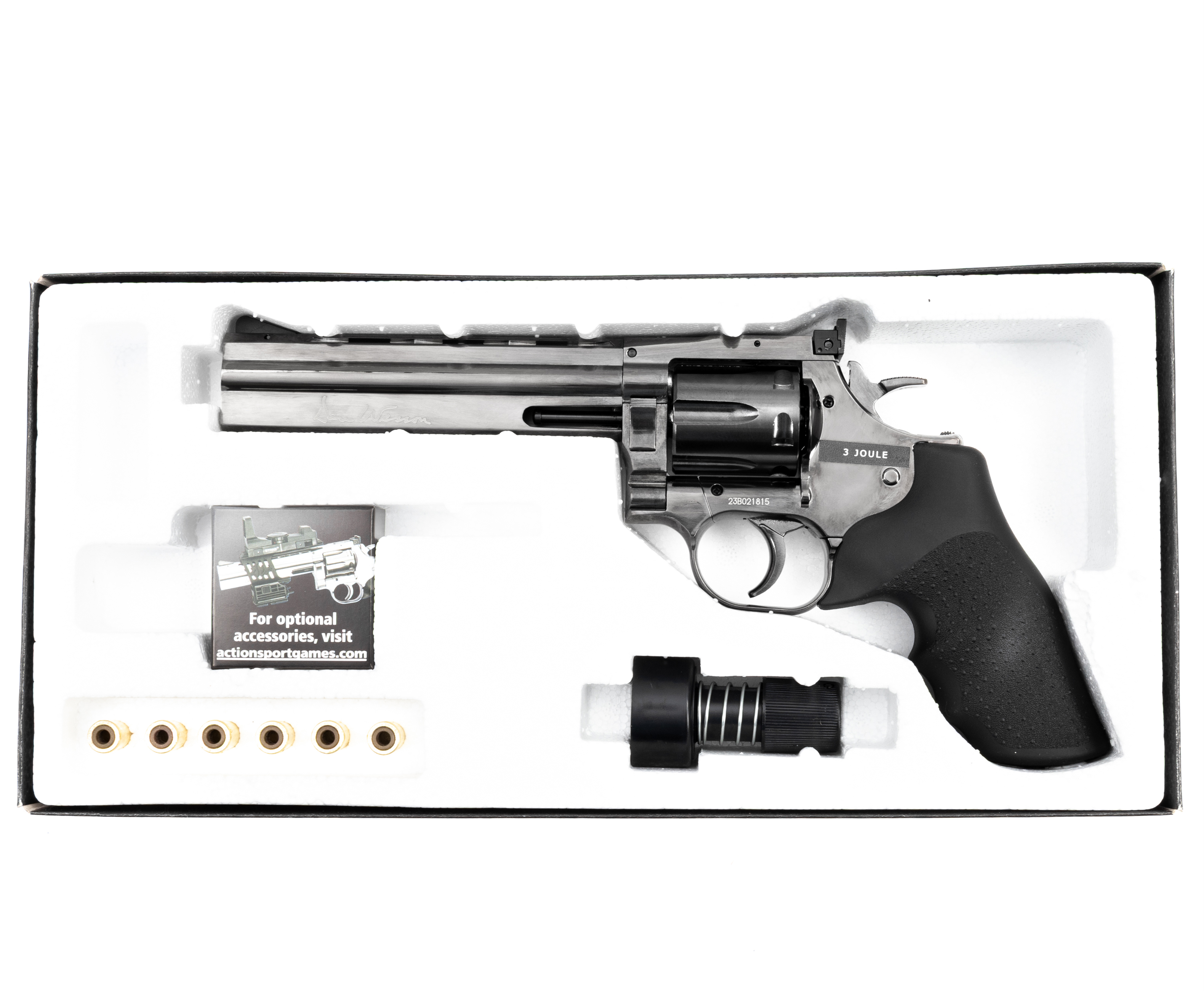 Для стрельбы требуются баллончики с CO2 на 12 грамм, создающие давление, необходимое для разгона снаряда, при этом сообщается, что скорость пули способна достигать 120 метров в секунду. Вставляется емкость в рукоять револьвера под съемную накладку, которая дополнена складным шестигранником для закручивания поджимного винта. Для безопасности при использовании изделия инженерами был предусмотрен предохранитель кнопочно-сдвижного вида, блокирующий курок.
