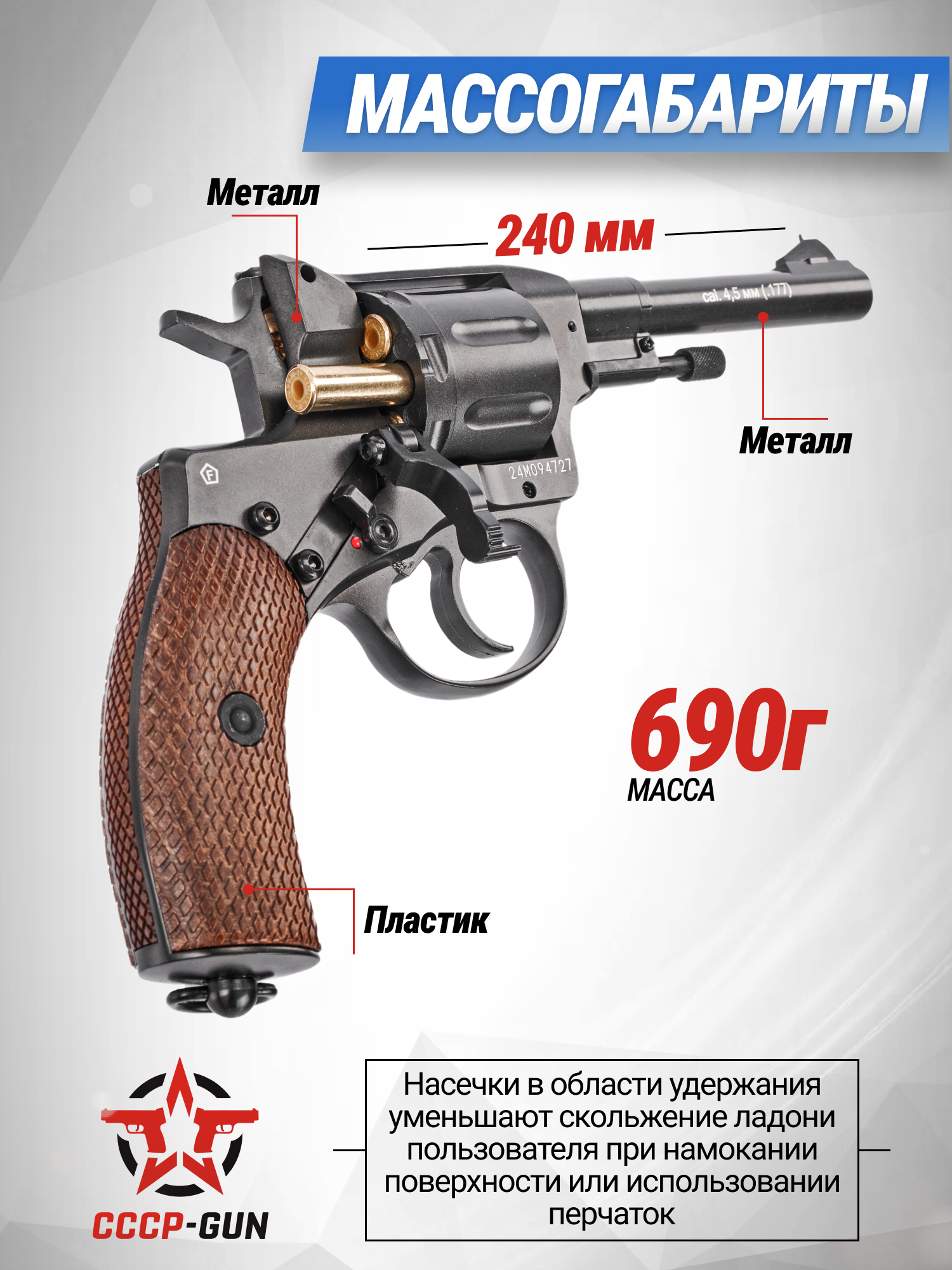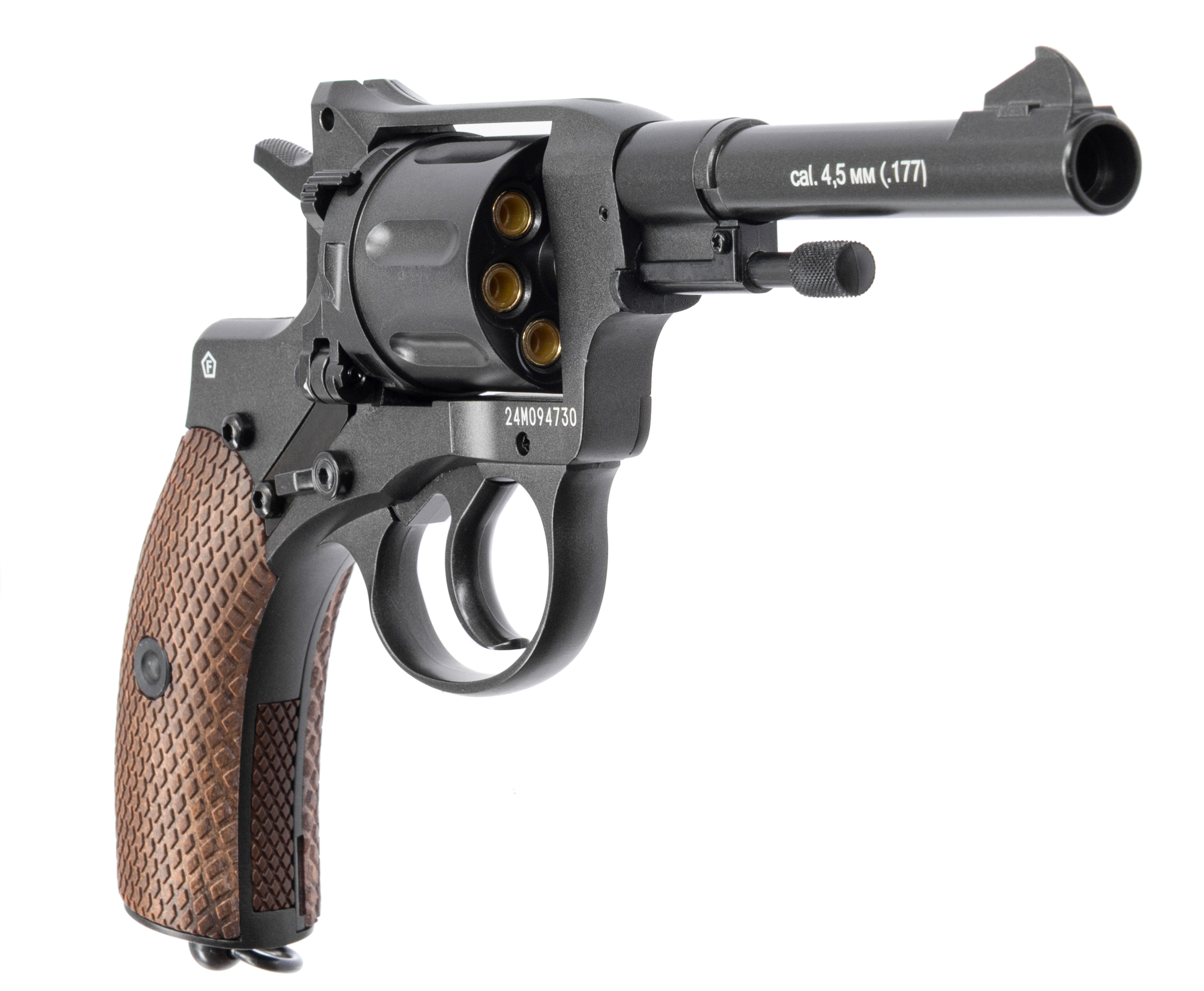 Прототипом для этой модели послужил легендарный револьвер системы Нагана образца 1895 года, состоявший на вооружении более полувека. Его узнаваемый внешний облик и отличительные особенности конструкции бережно сохранены в пневматическом варианте. Это наделяет изделие не только аутентичным внешним видом, но и атмосферой исторического оружия.