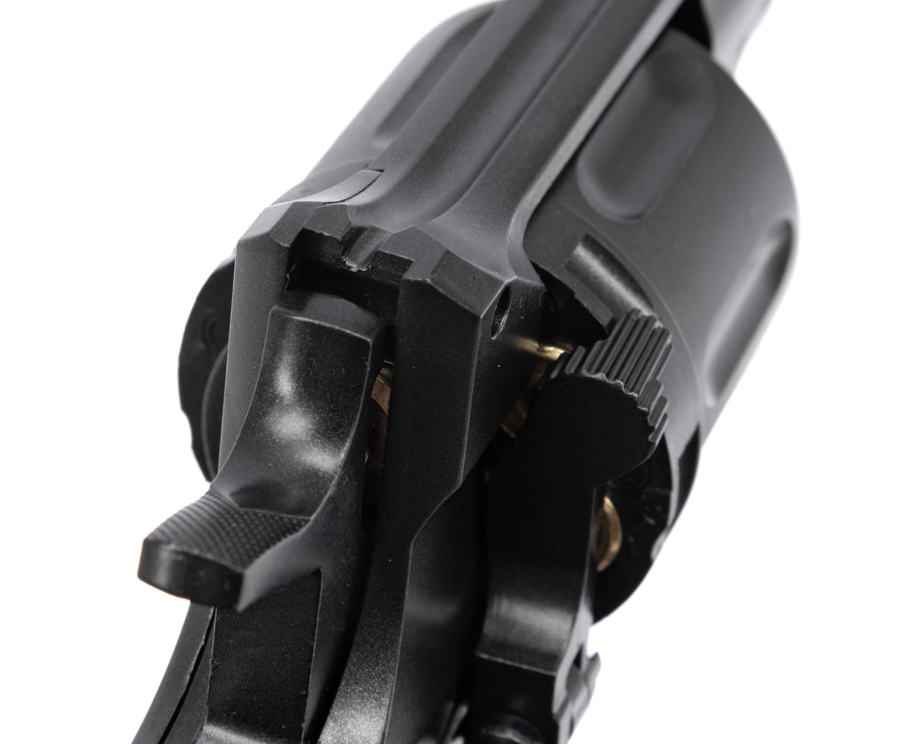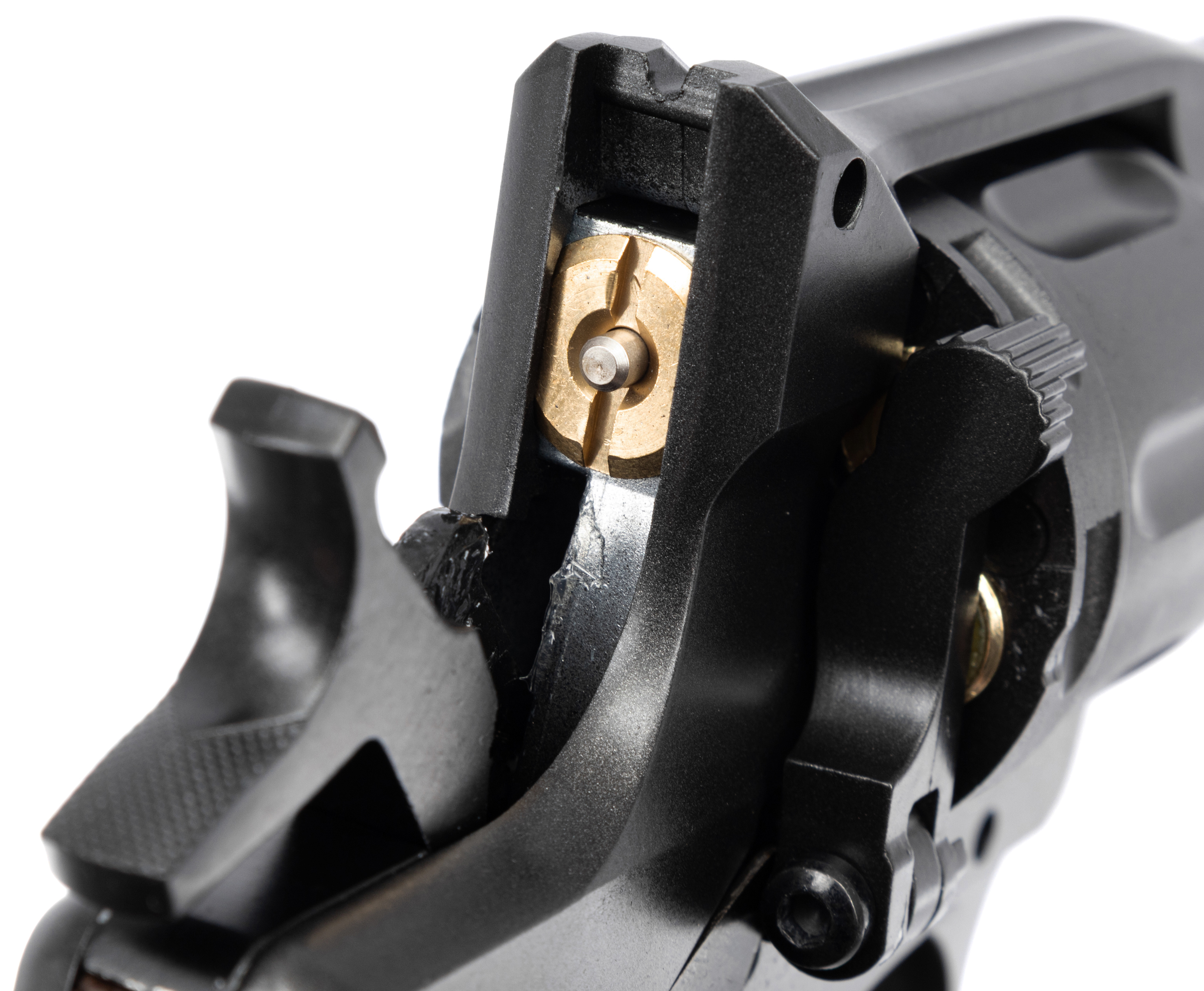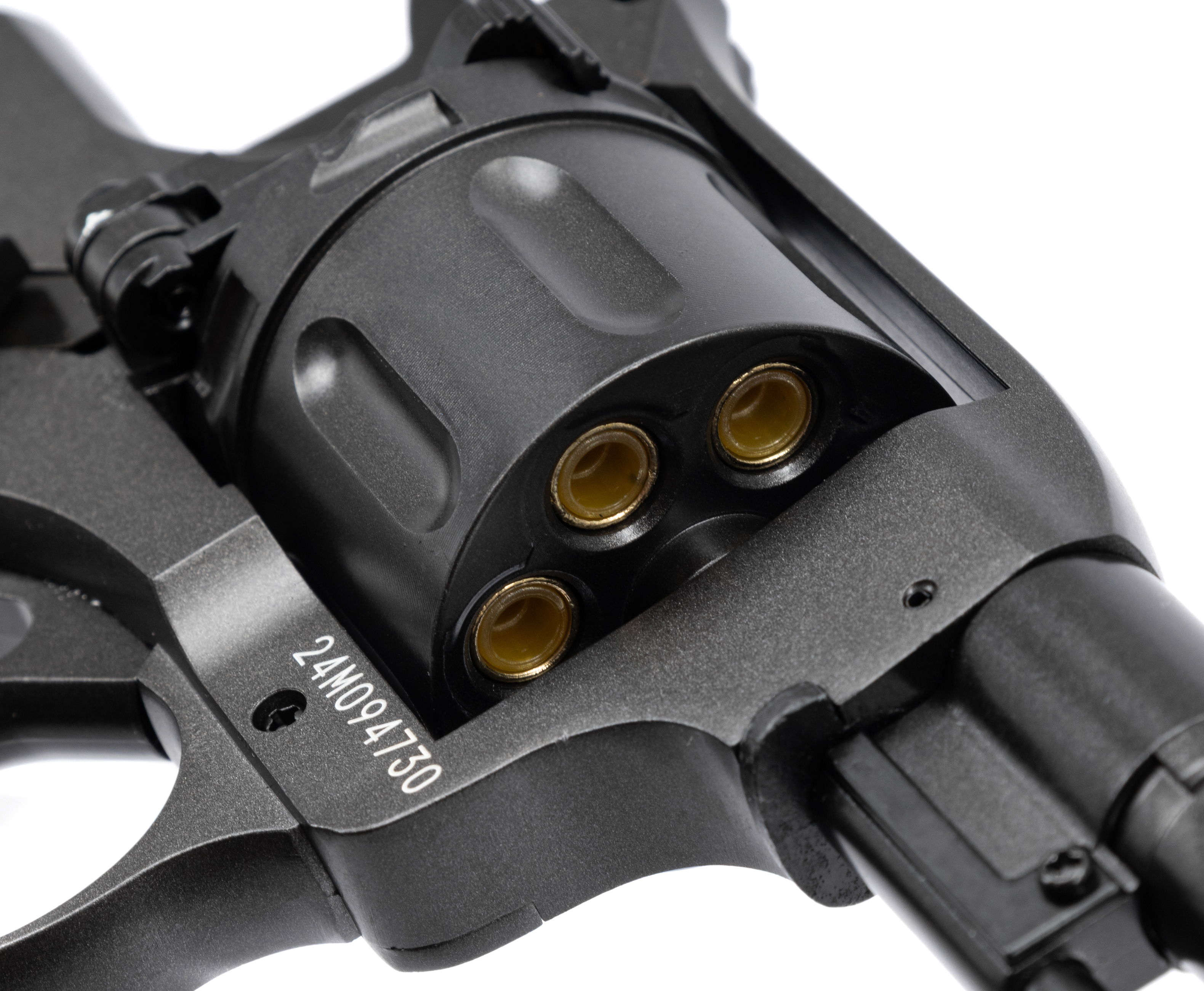 Для боепитания применяются фальшпатроны, что добавляет реалистичности процессу и облегчает перезарядку. Барабан рассчитан на 7 зарядов, каждый из которых заполняется гладкими шариками калибра 4.5 мм. Такое решение повышает практичность эксплуатации и приближает ощущения к обращению с полноразмерным револьвером.