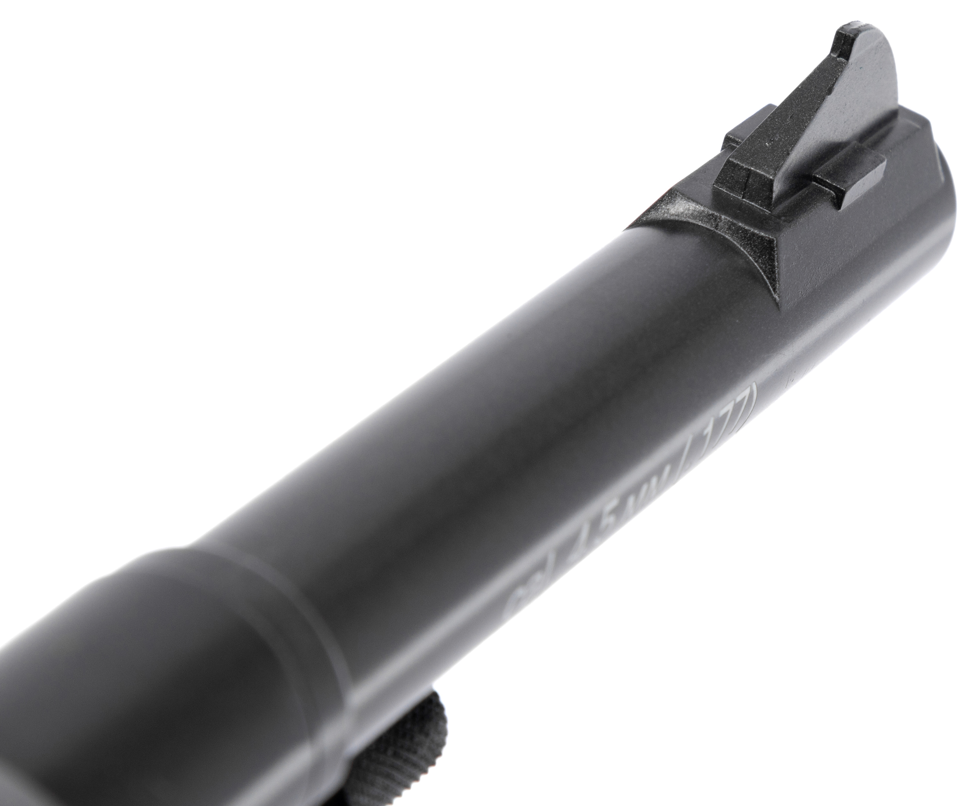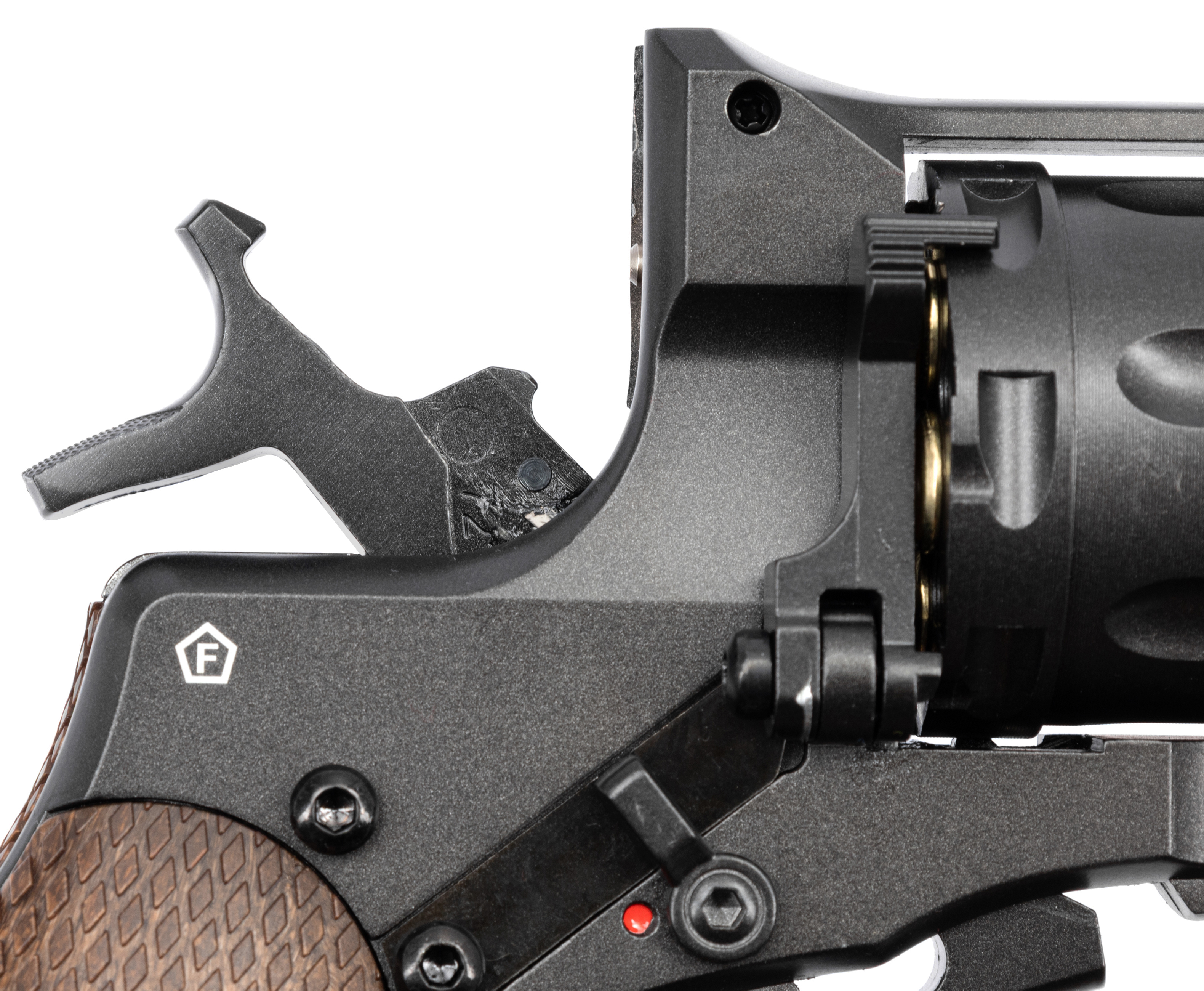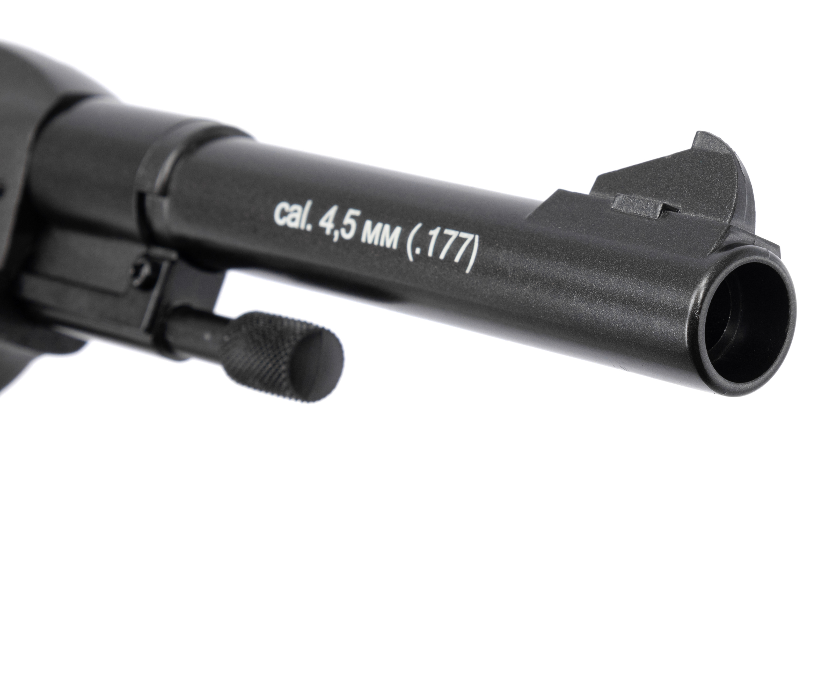 Для боепитания применяются фальшпатроны, что добавляет реалистичности процессу и облегчает перезарядку. Барабан рассчитан на 7 зарядов, каждый из которых заполняется гладкими шариками калибра 4.5 мм. Такое решение повышает практичность эксплуатации и приближает ощущения к обращению с полноразмерным револьвером.