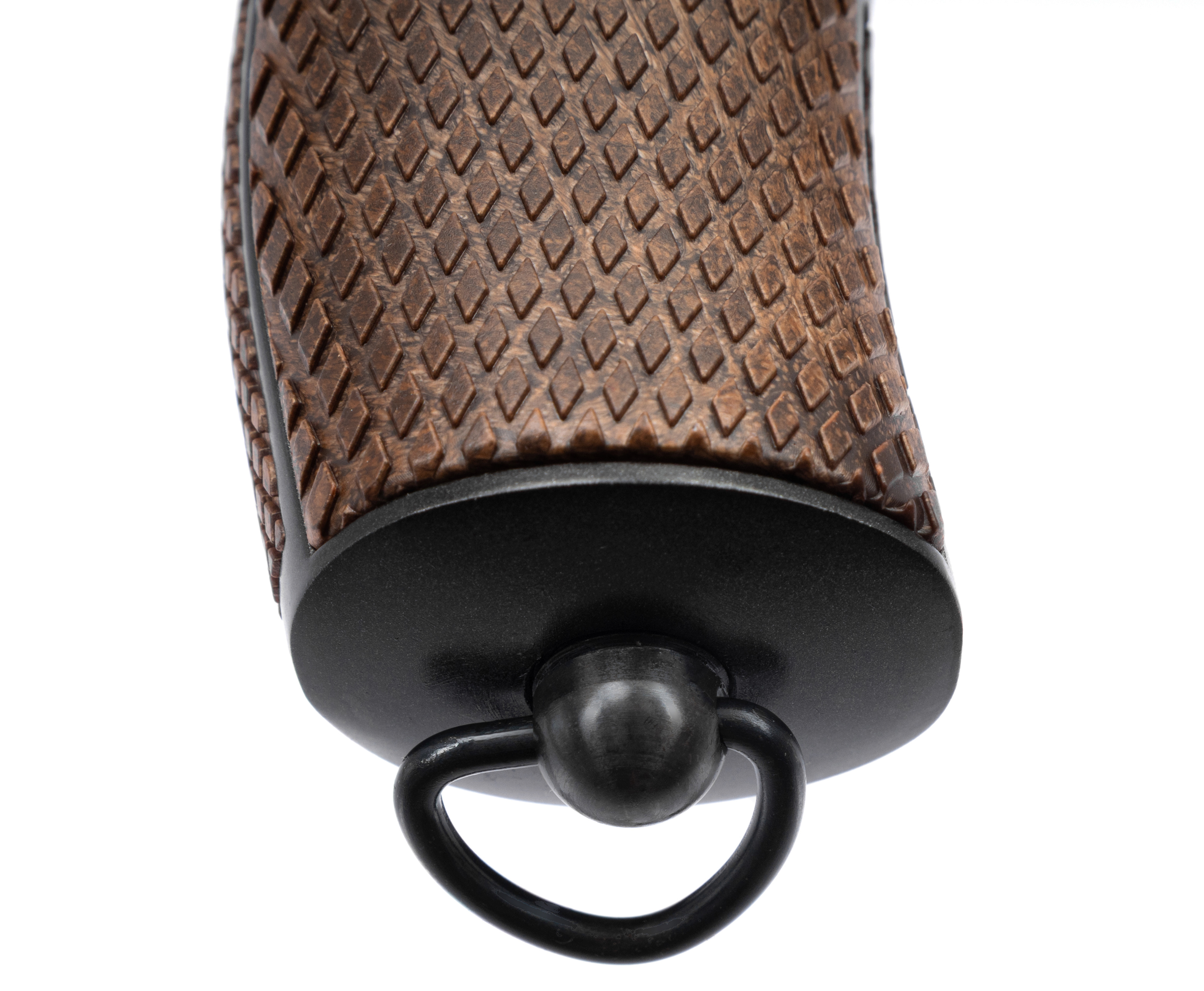 Револьвер оснащен кольцом для крепления страховочного шнура, что повышает удобство и безопасность при использовании. Это решение предотвращает случайную потерю оружия во время движения. Наличие такой функциональной детали ценится пользователями, которые предпочитают активную стрельбу с постоянным перемещением.