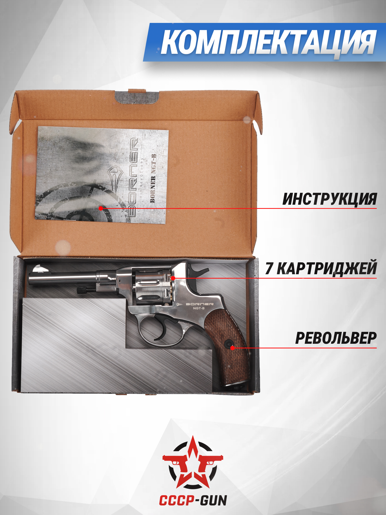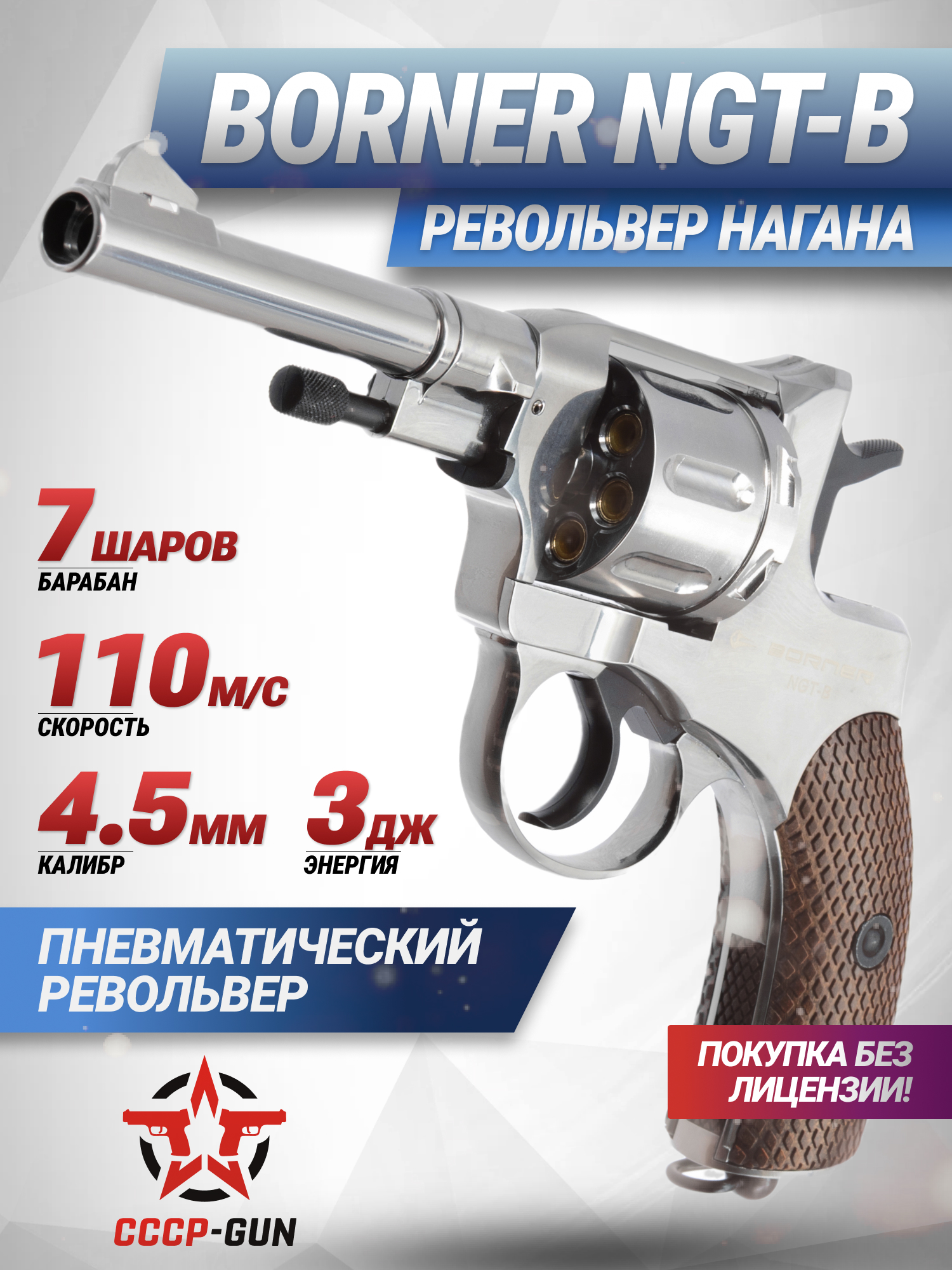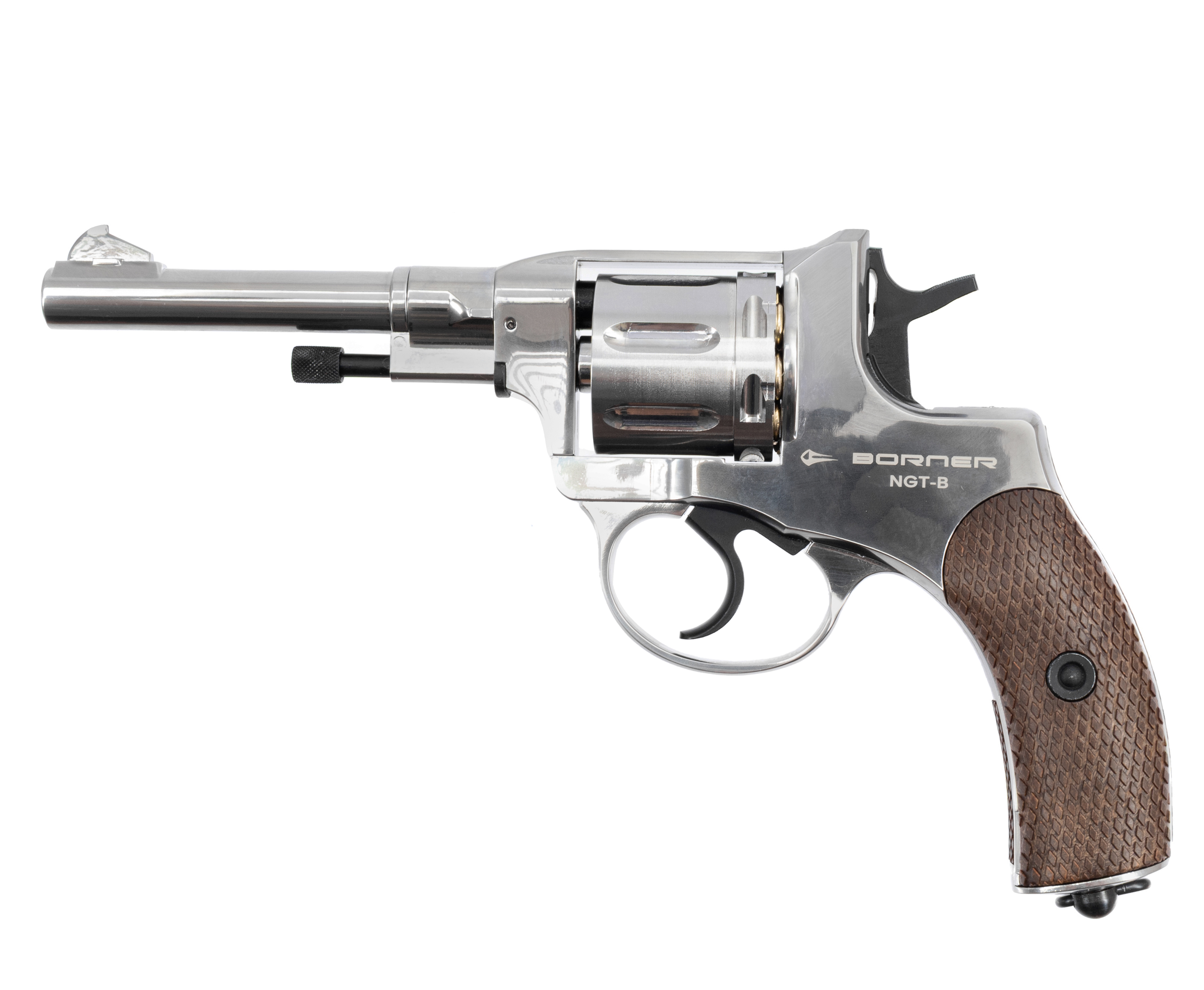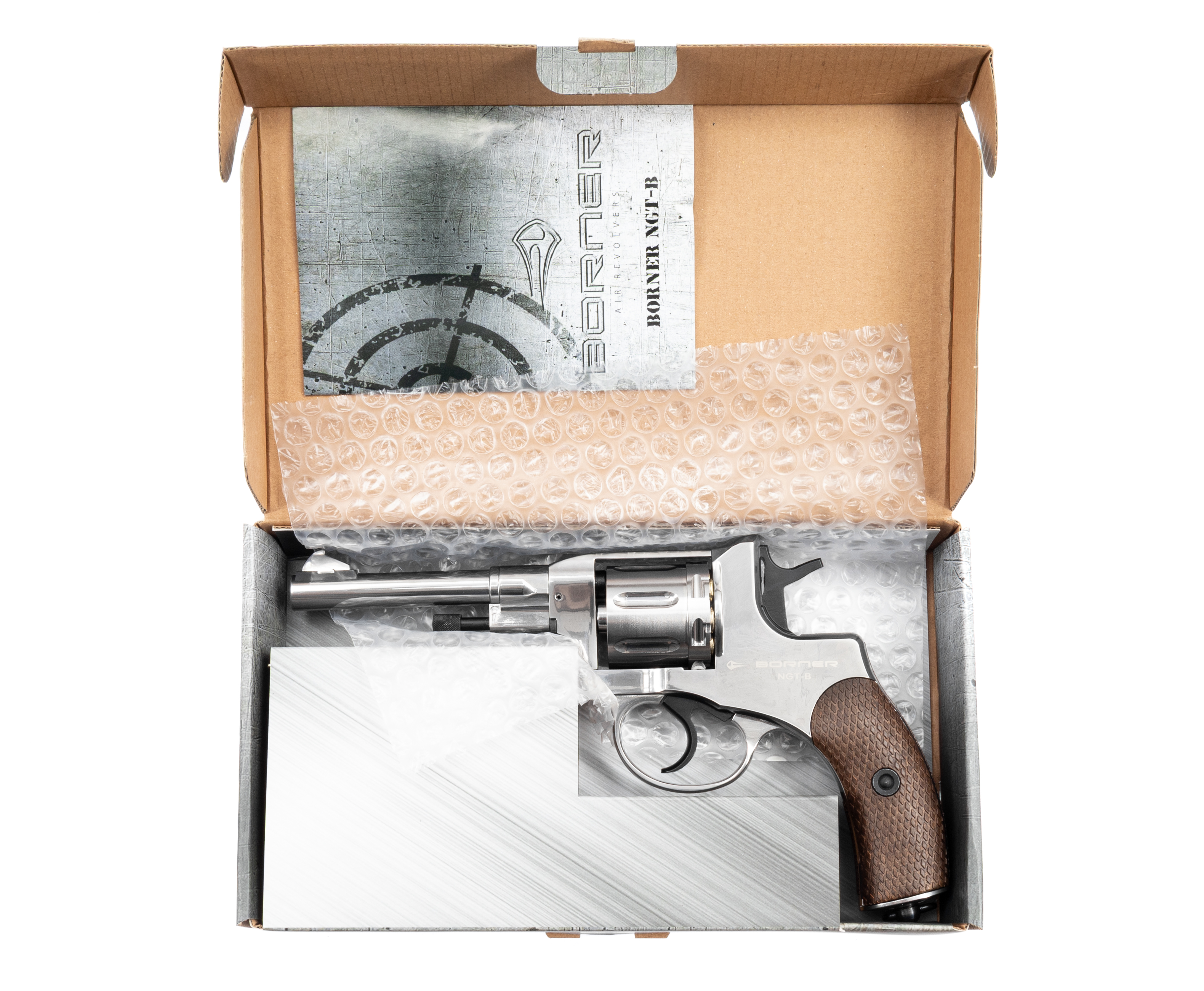 Пневматический револьвер Borner NGT-B 4.5 имеет корпус, изготовленный из металлического сплава, основные части которого выполнены в цвете типа Silver. Размеры изделия в длину составляют 230 миллиметров, а полный вес приблизительно равен 700 граммам. Пластиковые накладки коричневого цвета на рукоятке помогают удобнее удерживать модель и препятствуют выскальзыванию, за счет ребристой поверхности.