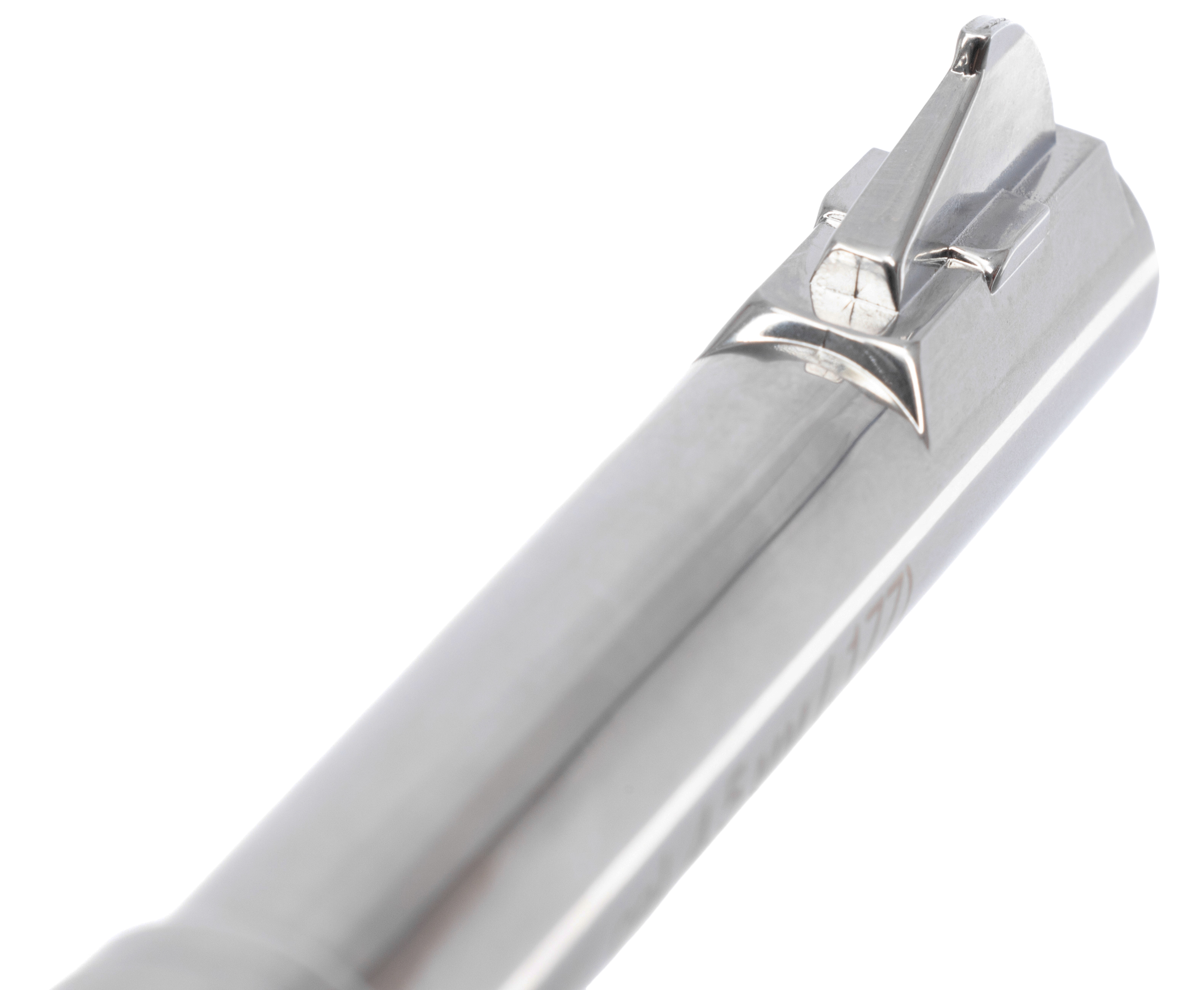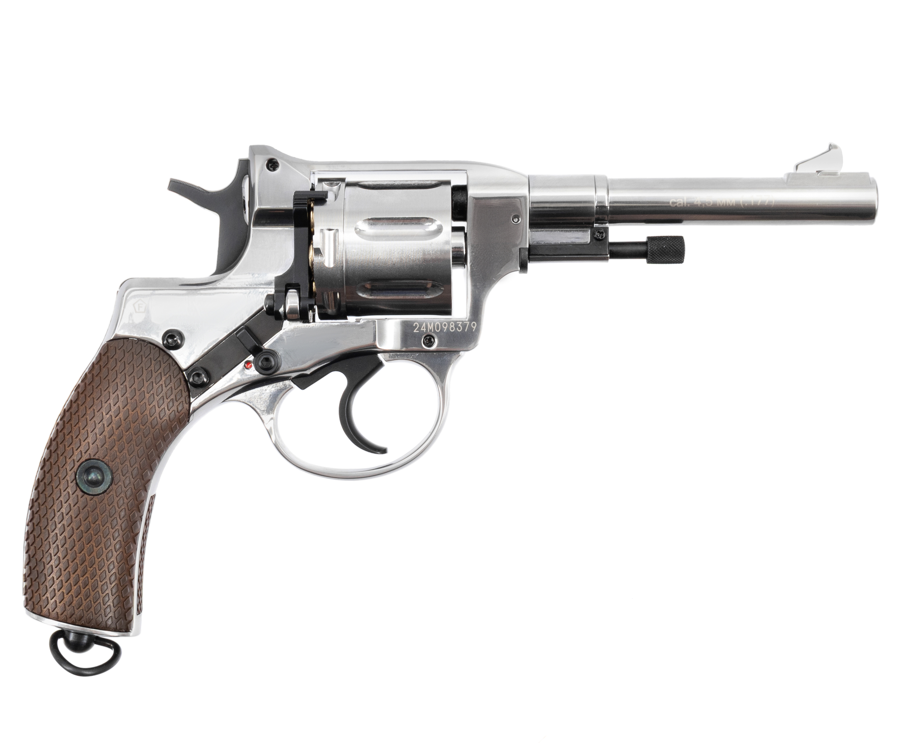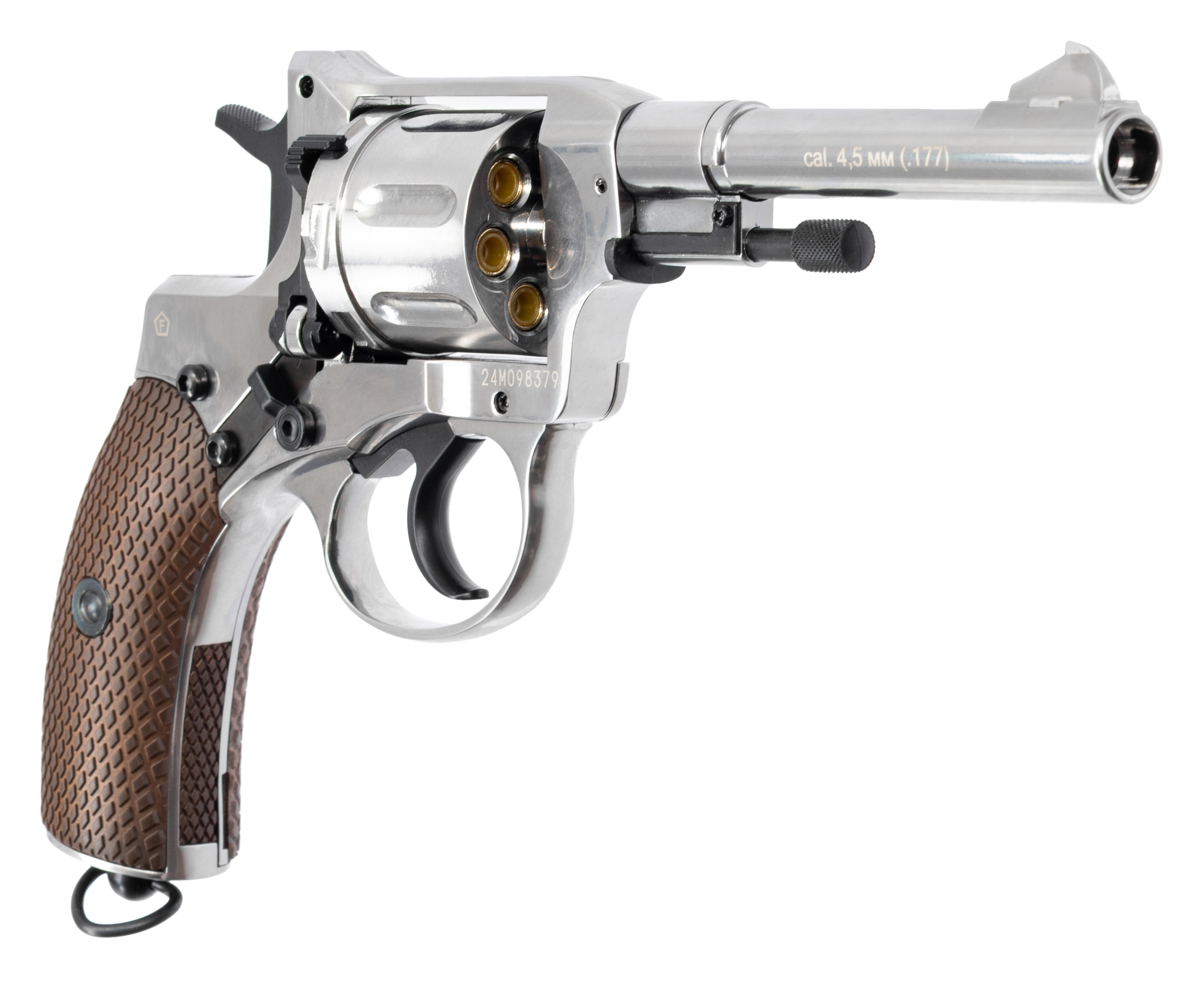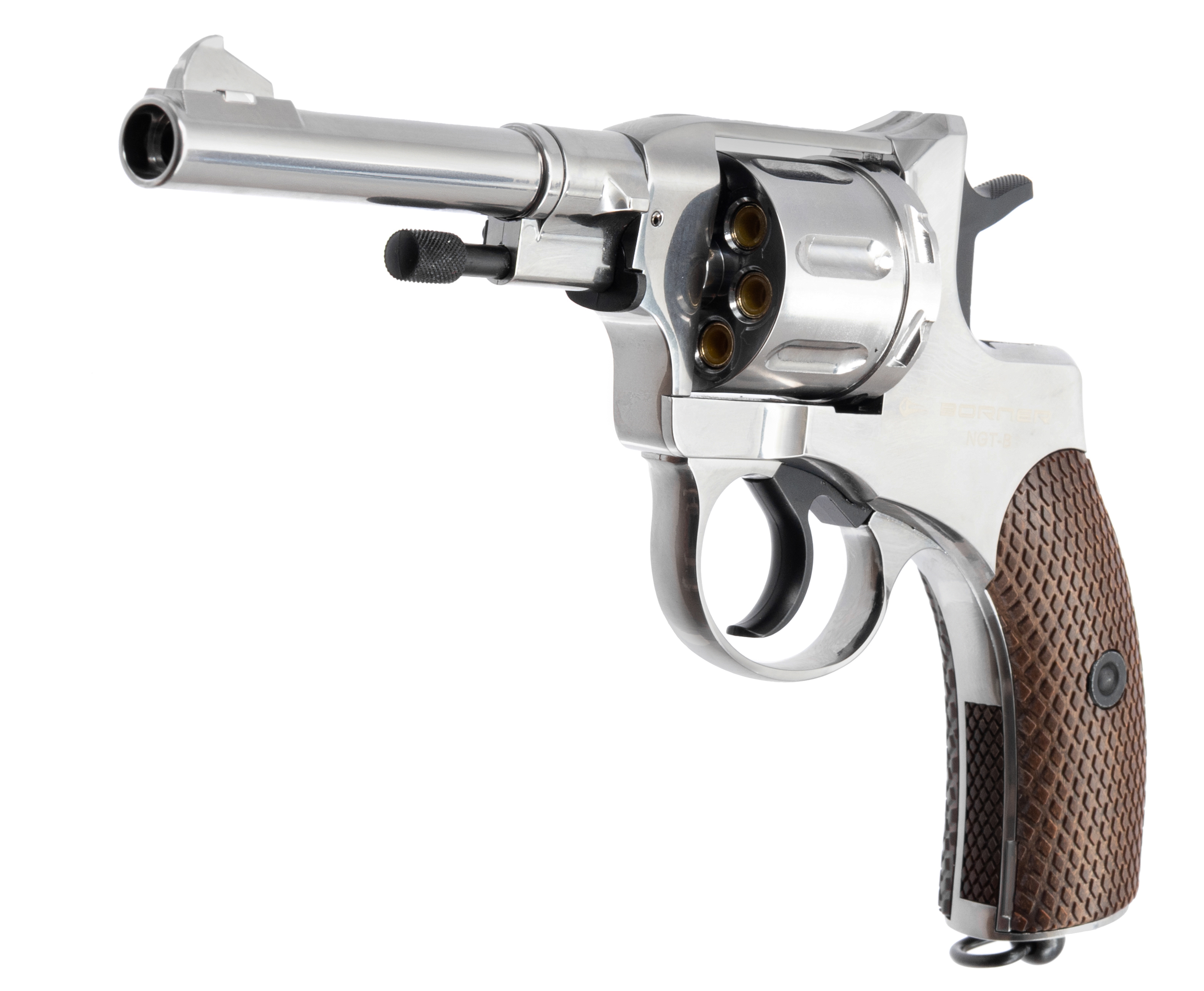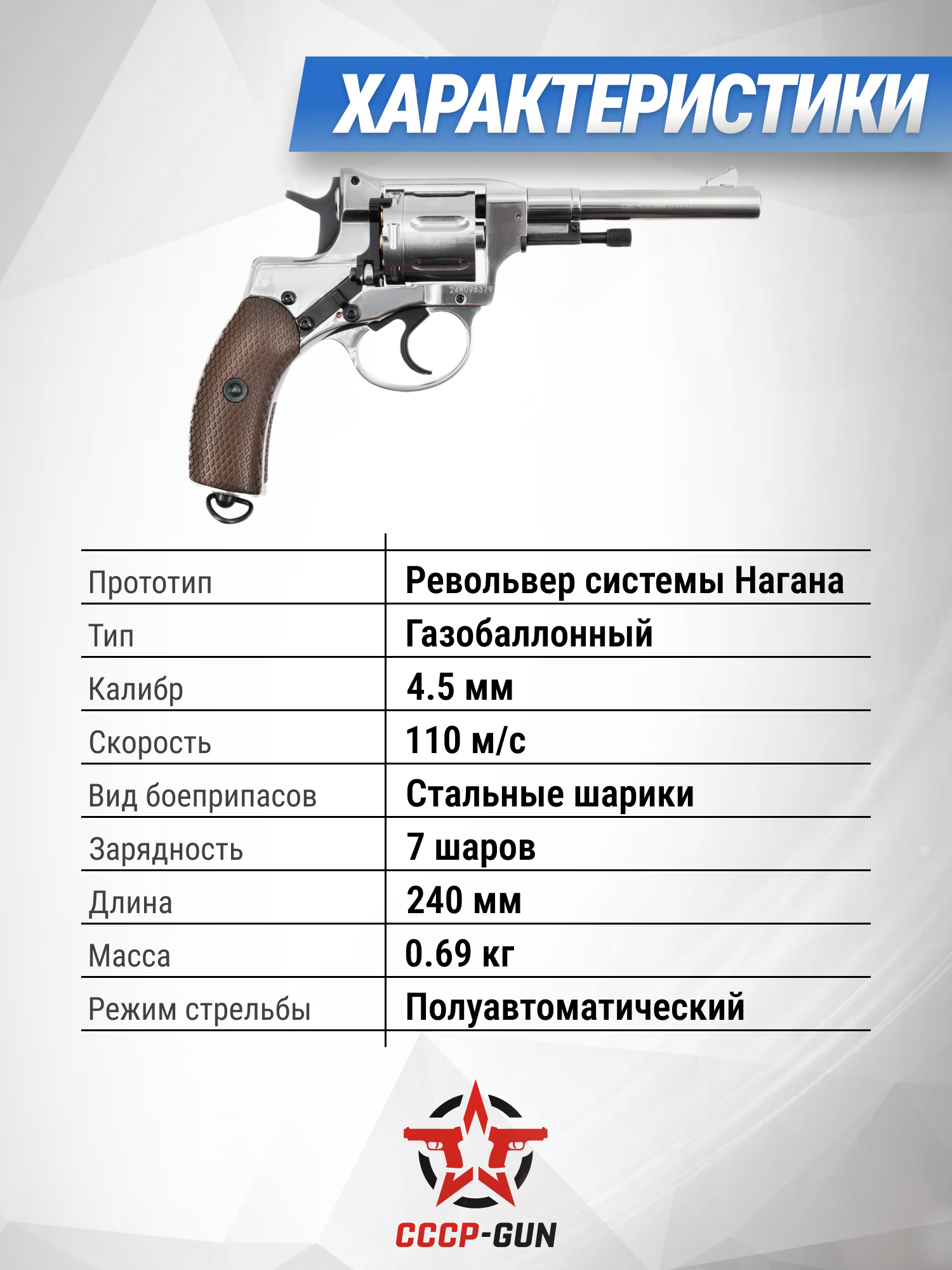 Пневматический револьвер Borner NGT-B 4.5 имеет корпус, изготовленный из металлического сплава, основные части которого выполнены в цвете типа Silver. Размеры изделия в длину составляют 230 миллиметров, а полный вес приблизительно равен 700 граммам. Пластиковые накладки коричневого цвета на рукоятке помогают удобнее удерживать модель и препятствуют выскальзыванию, за счет ребристой поверхности.