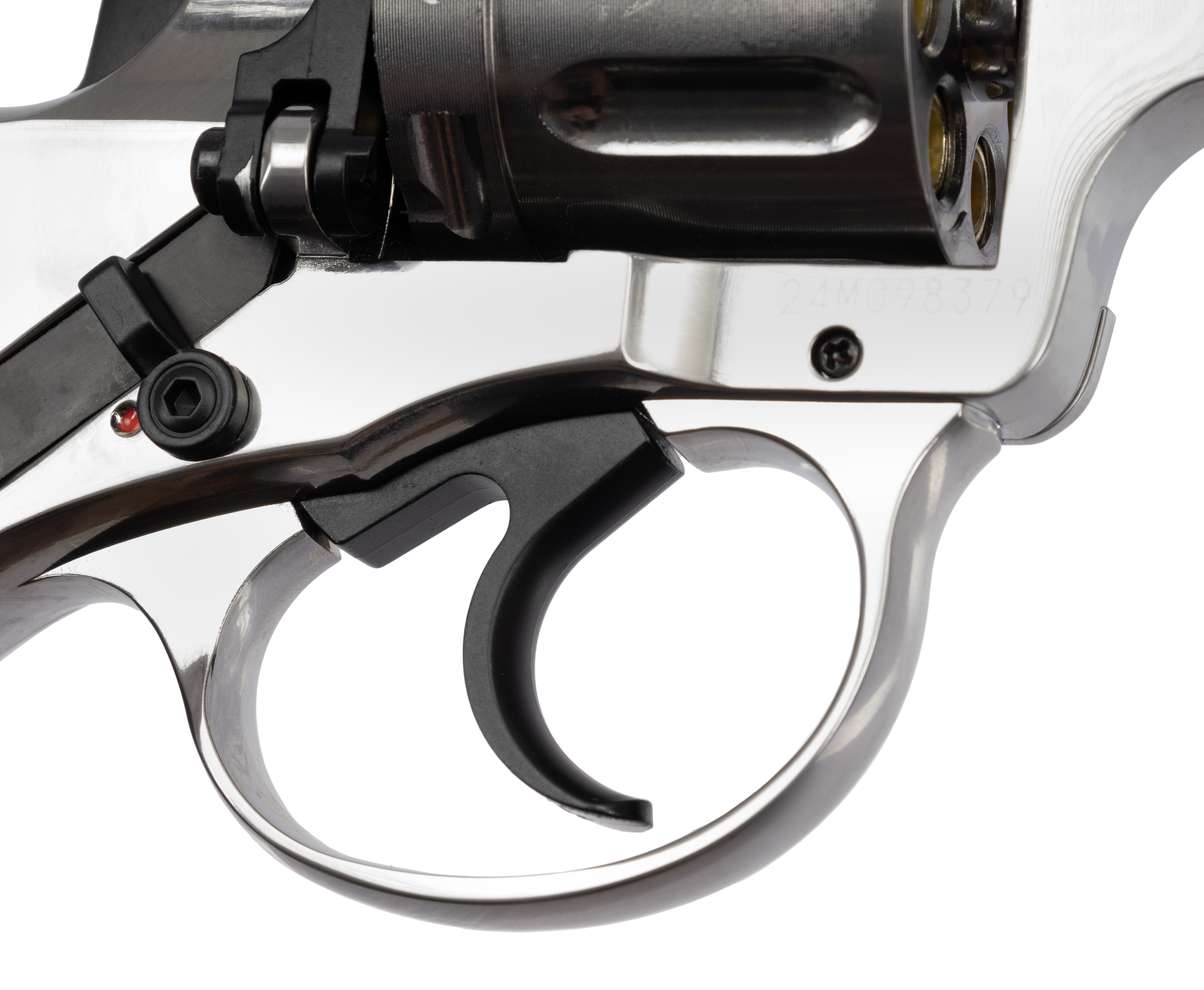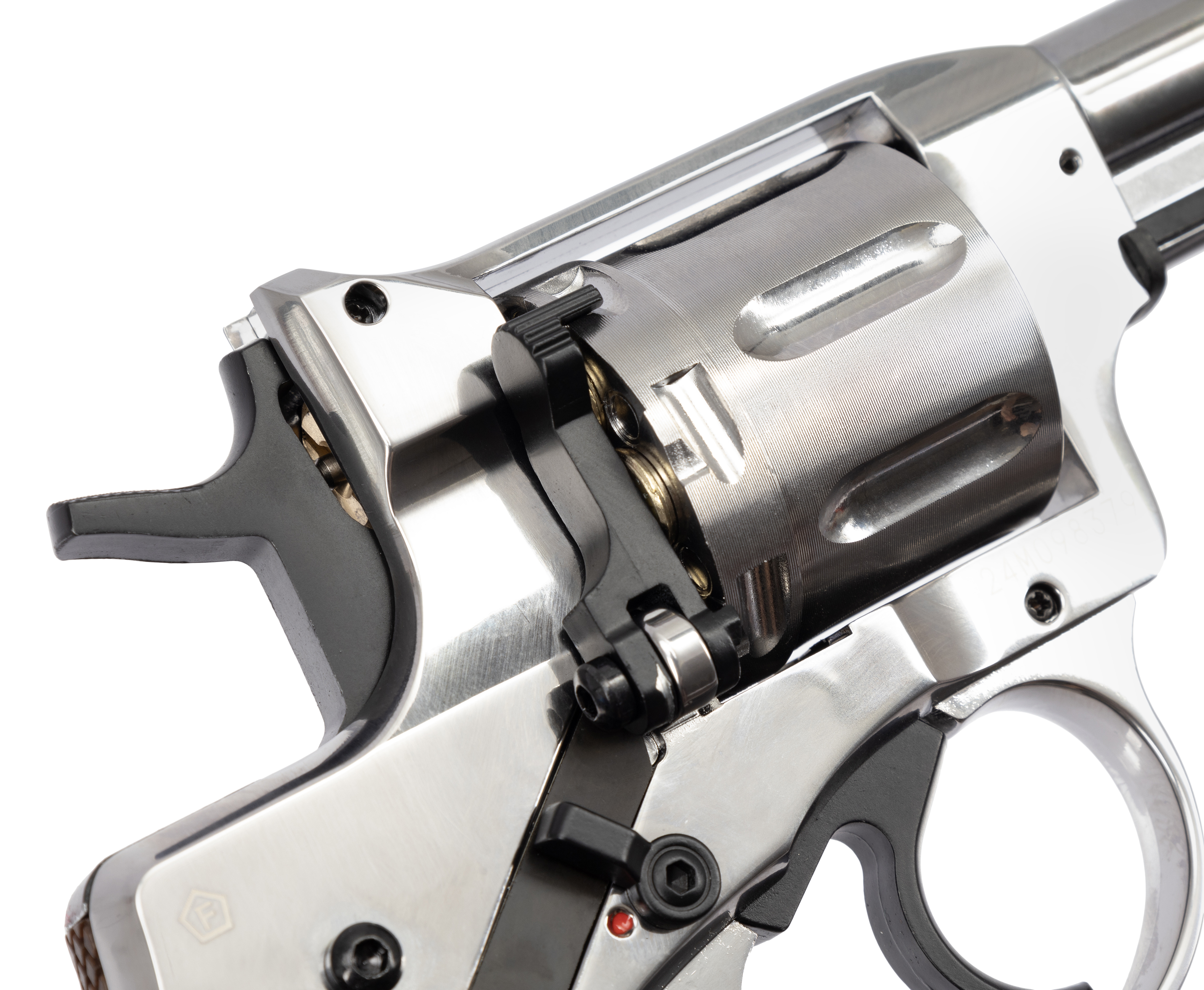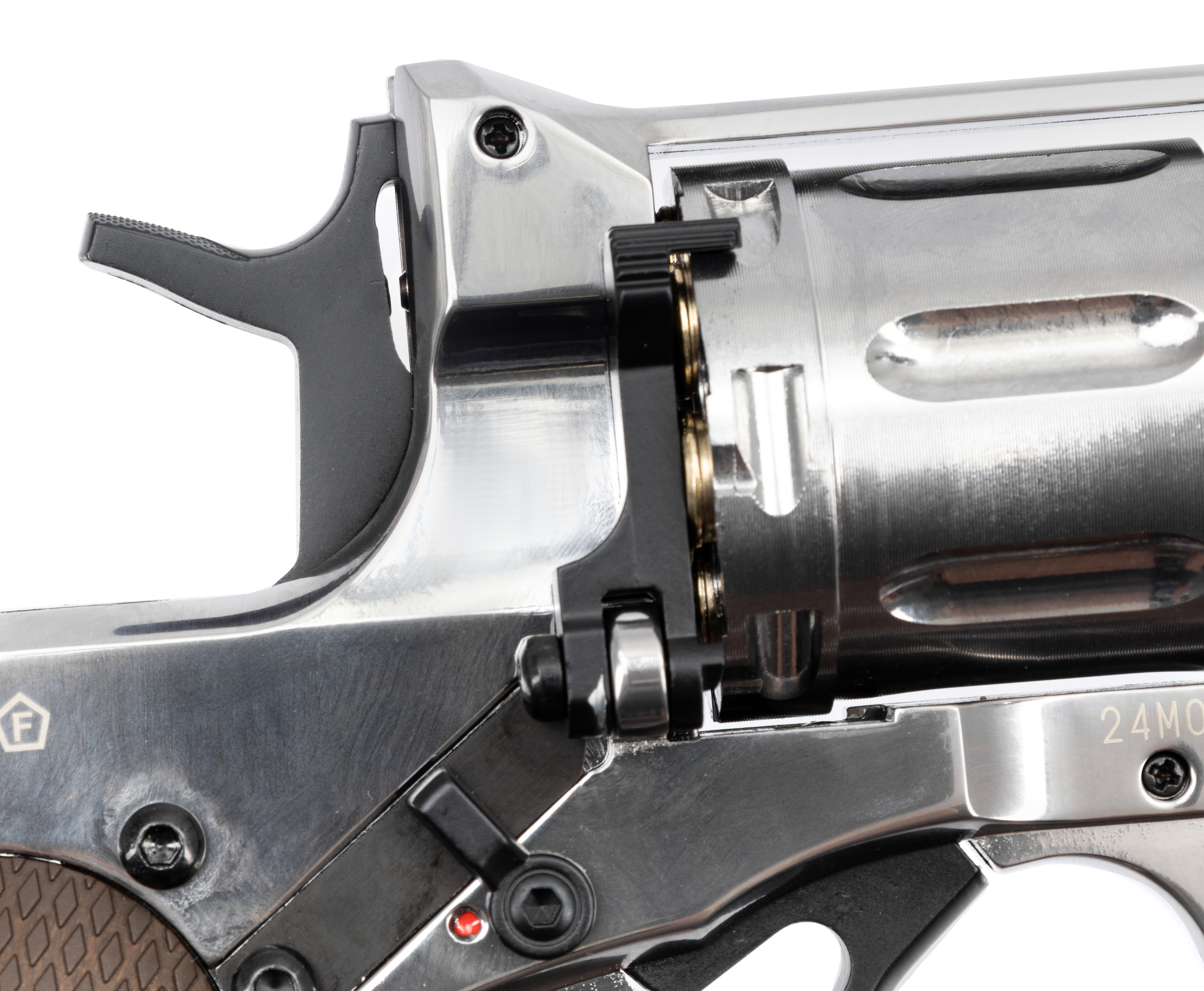 Функционирует револьвер в полуавтоматическом режиме, используя в качестве снарядов стальные шарики калибра 4.5 мм, которые уставляются в комплектные фальшпатроны, заряжающиеся внутрь 7-слотового барабана. Благодаря детально проработанному механизму стрелять можно как по предвзводу, так и путем самовзведения, что помогает визуализировать принцип действия боевого экземпляра. Прицельными приспособлениями в представленной модели выступают целик и мушка механического типа.
