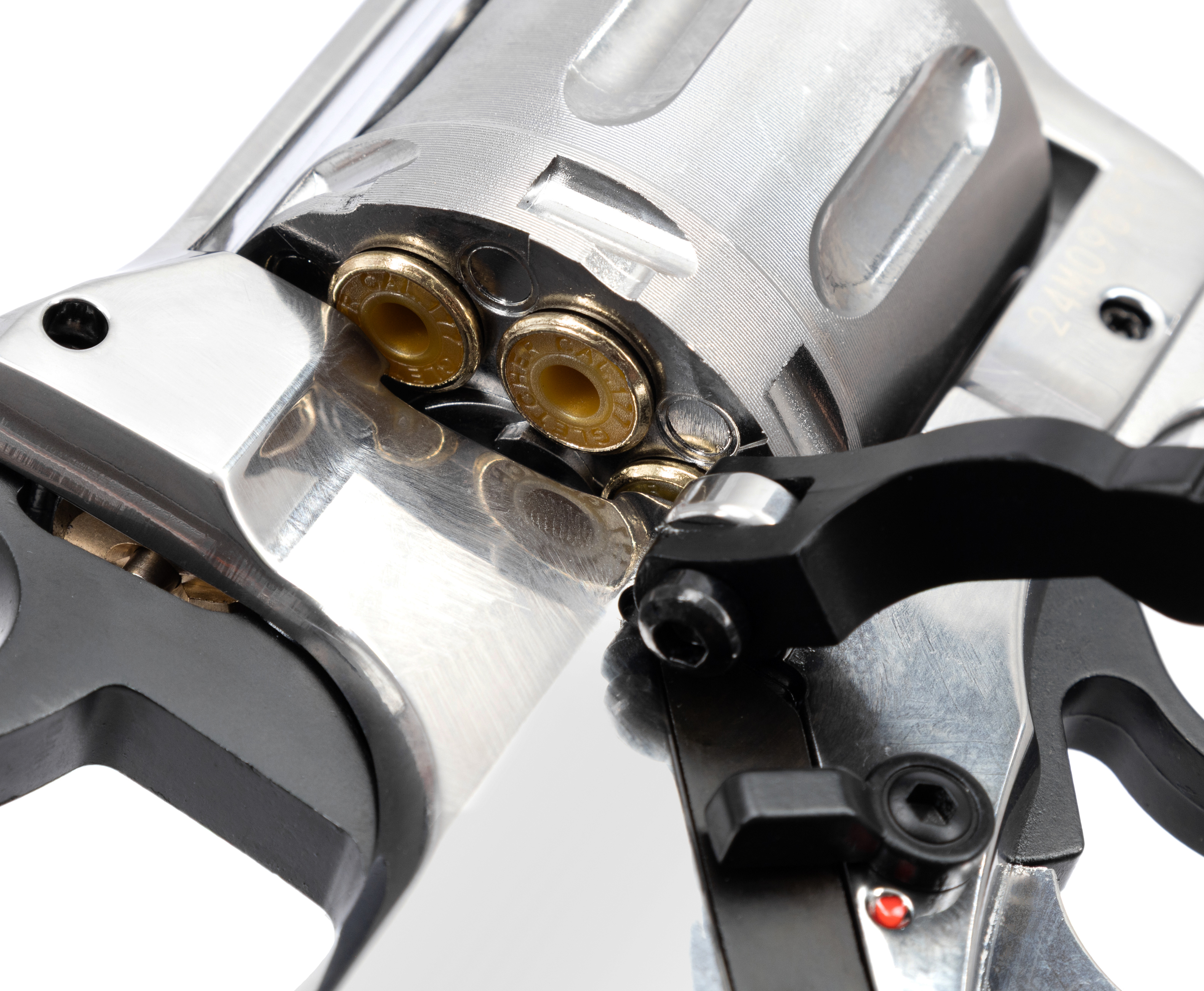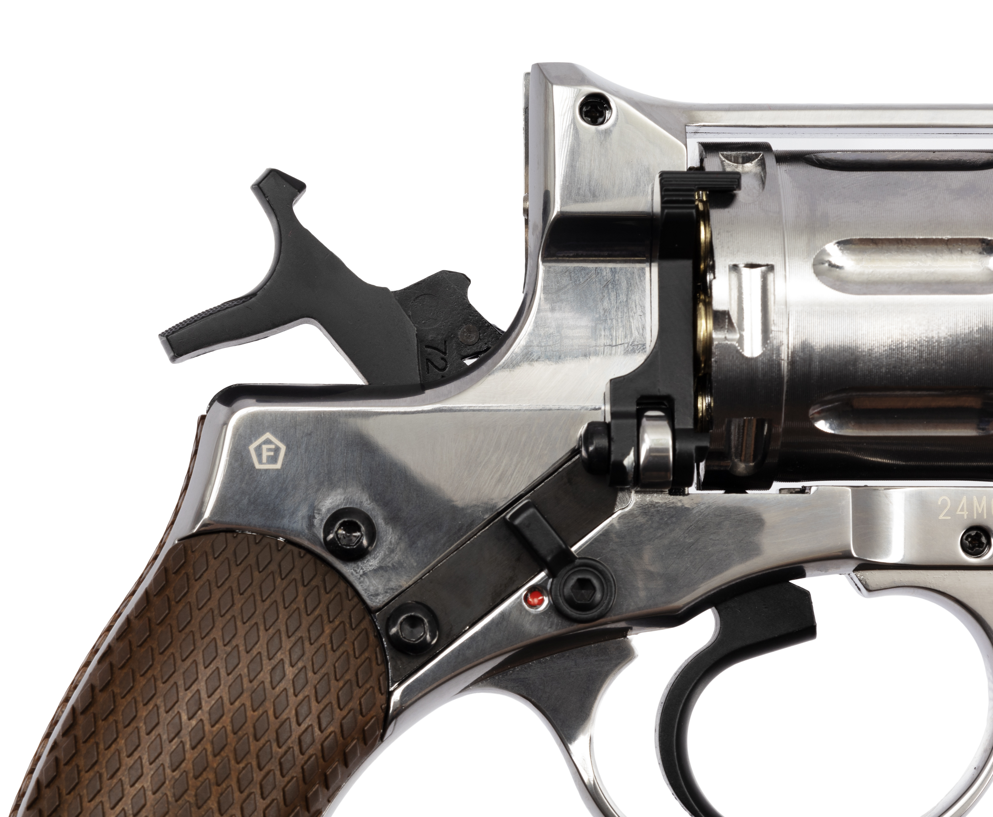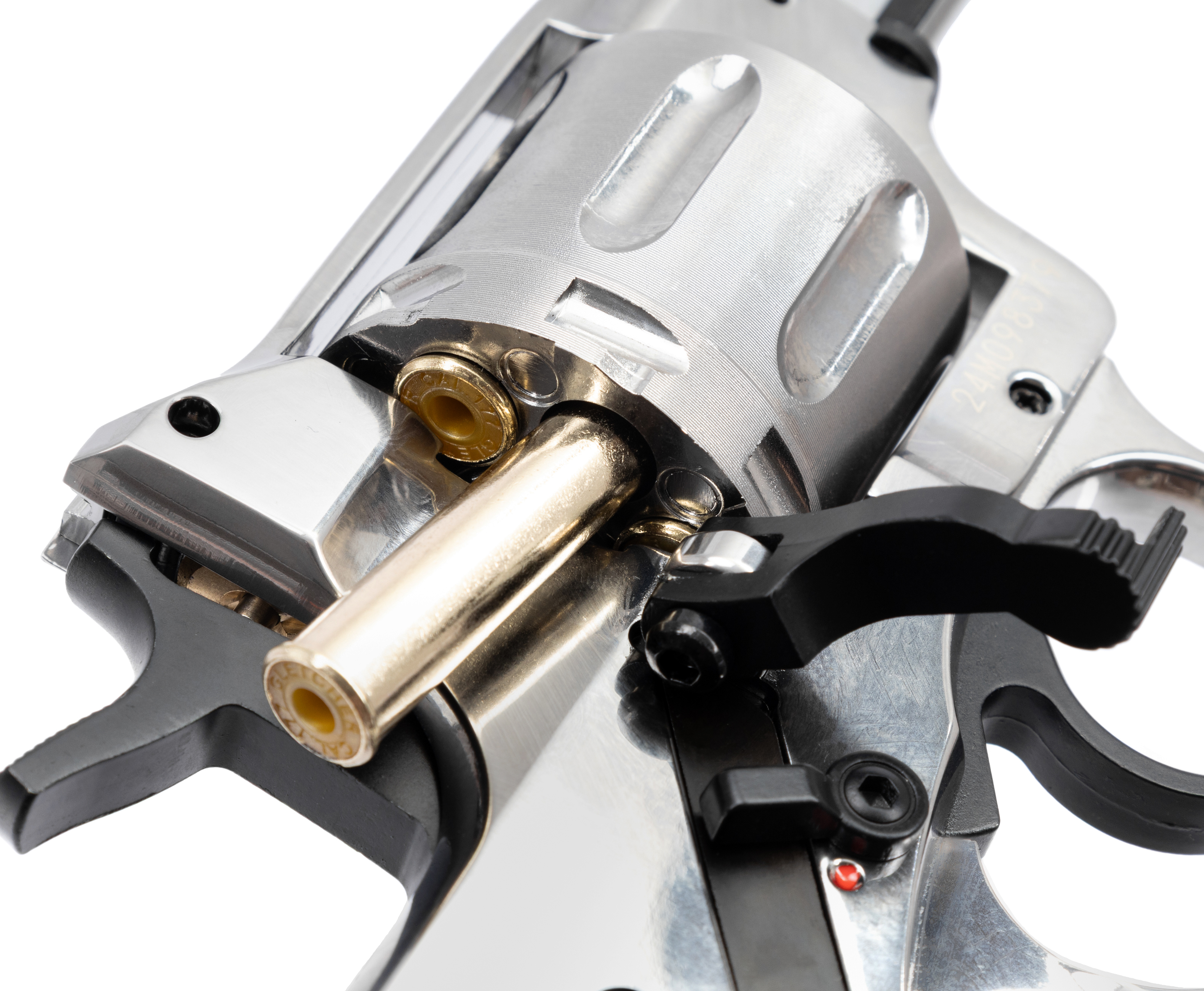 Функционирует револьвер в полуавтоматическом режиме, используя в качестве снарядов стальные шарики калибра 4.5 мм, которые уставляются в комплектные фальшпатроны, заряжающиеся внутрь 7-слотового барабана. Благодаря детально проработанному механизму стрелять можно как по предвзводу, так и путем самовзведения, что помогает визуализировать принцип действия боевого экземпляра. Прицельными приспособлениями в представленной модели выступают целик и мушка механического типа.