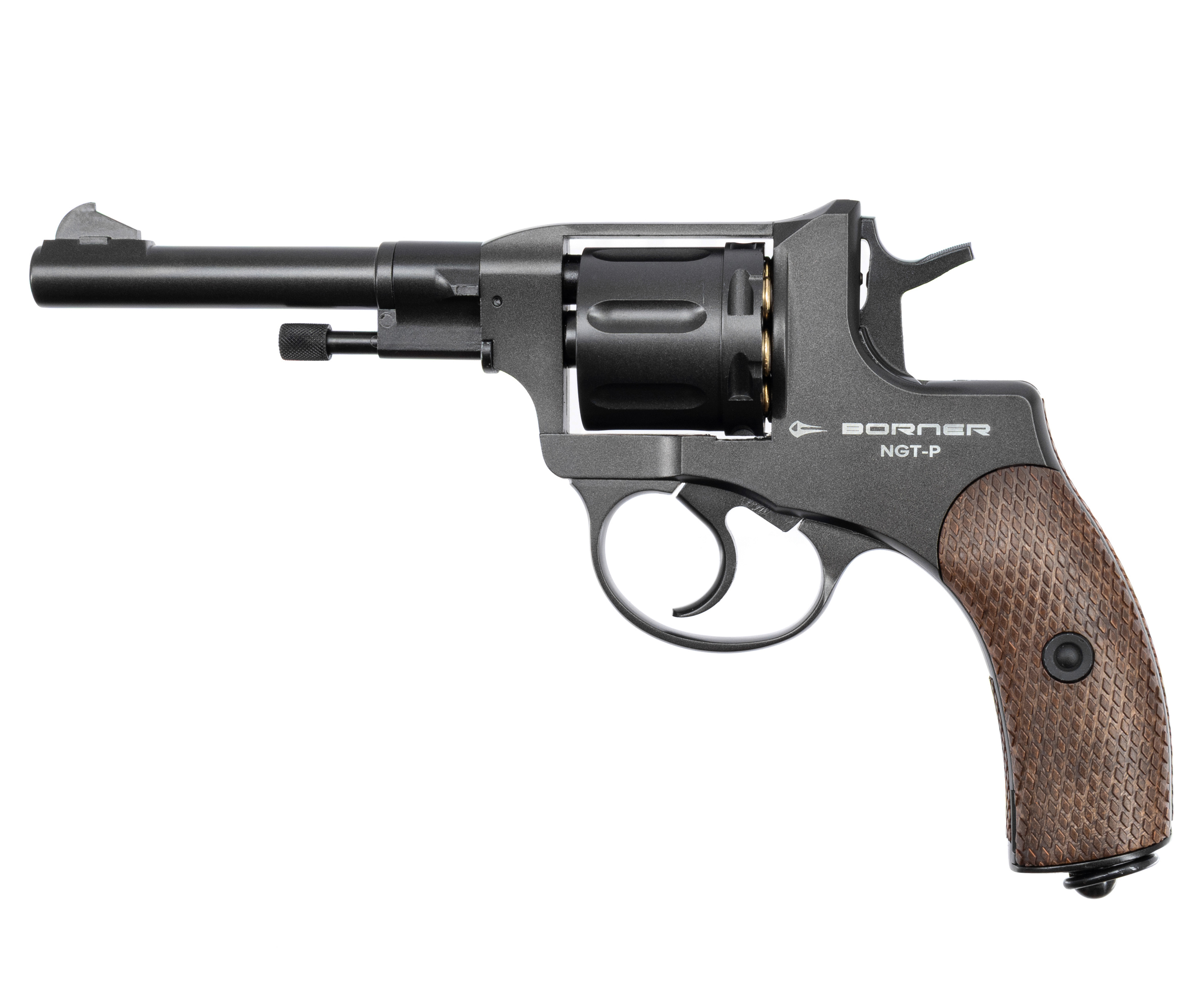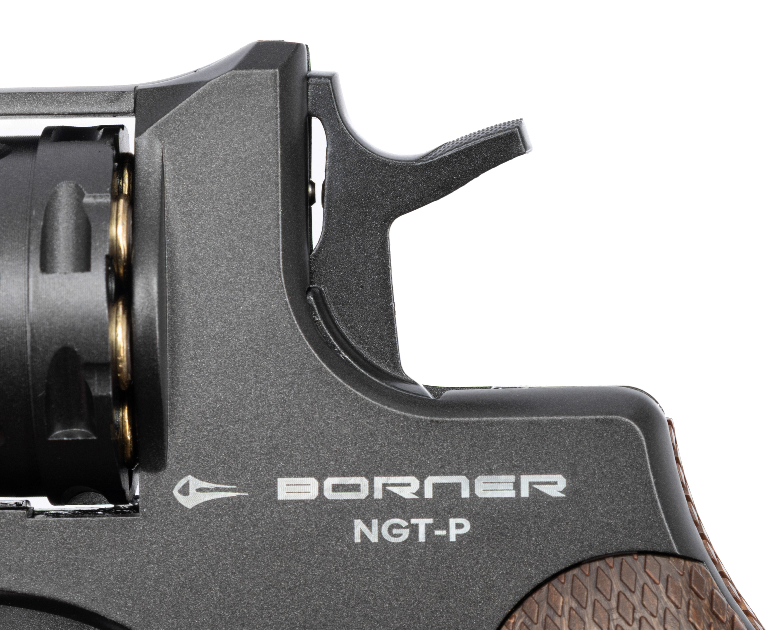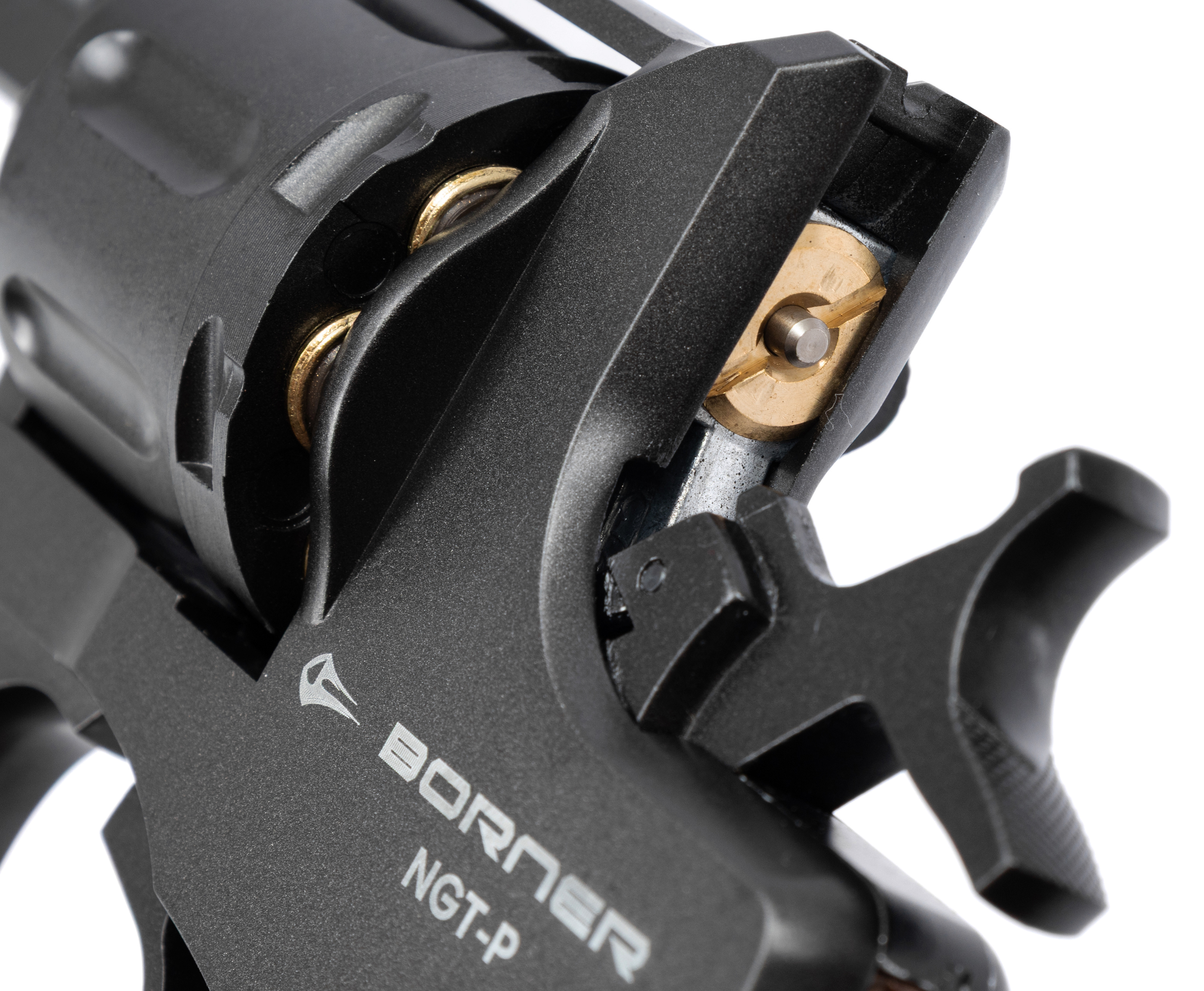 Borner NGT-P оборудован нарезным 114-миллиметровым стальным стволиком, который увеличивает точность траектории свинцовых пуль типа «воланчик» под калибр 4.5 мм. Заряжаются снаряды внутрь специальных фальшпатронов, устанавливаемых в 7-зарядный барабан. Такая особая конструкция помогает реализовать принцип подобный работе с огнестрельным револьвером, что дополнительно добавляет модели аутентичность боевому образцу.