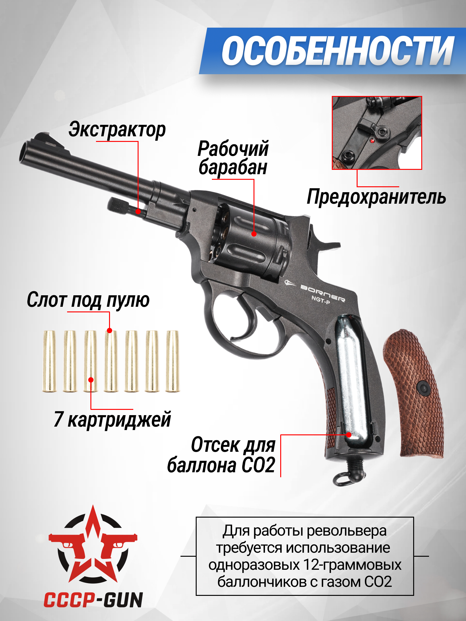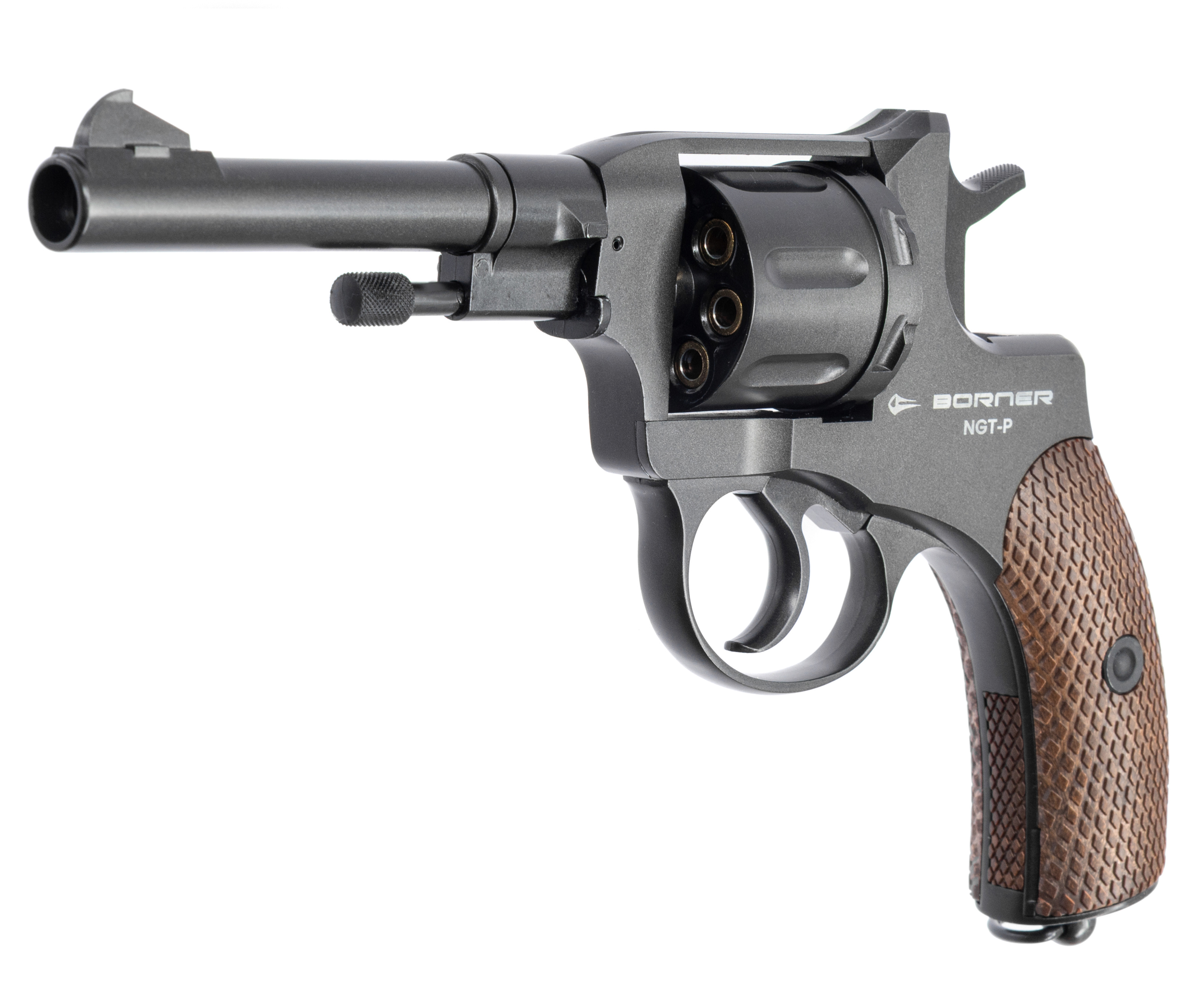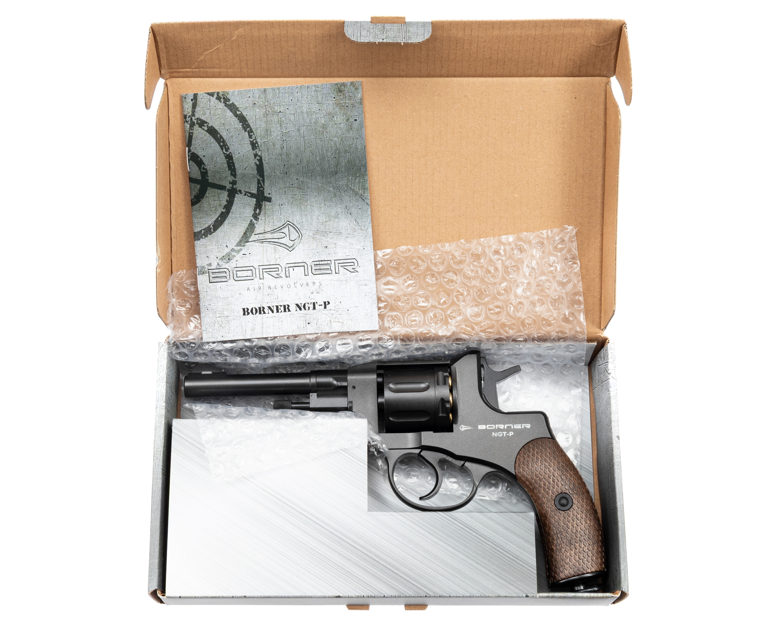 Borner NGT-P оборудован нарезным 114-миллиметровым стальным стволиком, который увеличивает точность траектории свинцовых пуль типа «воланчик» под калибр 4.5 мм. Заряжаются снаряды внутрь специальных фальшпатронов, устанавливаемых в 7-зарядный барабан. Такая особая конструкция помогает реализовать принцип подобный работе с огнестрельным револьвером, что дополнительно добавляет модели аутентичность боевому образцу.