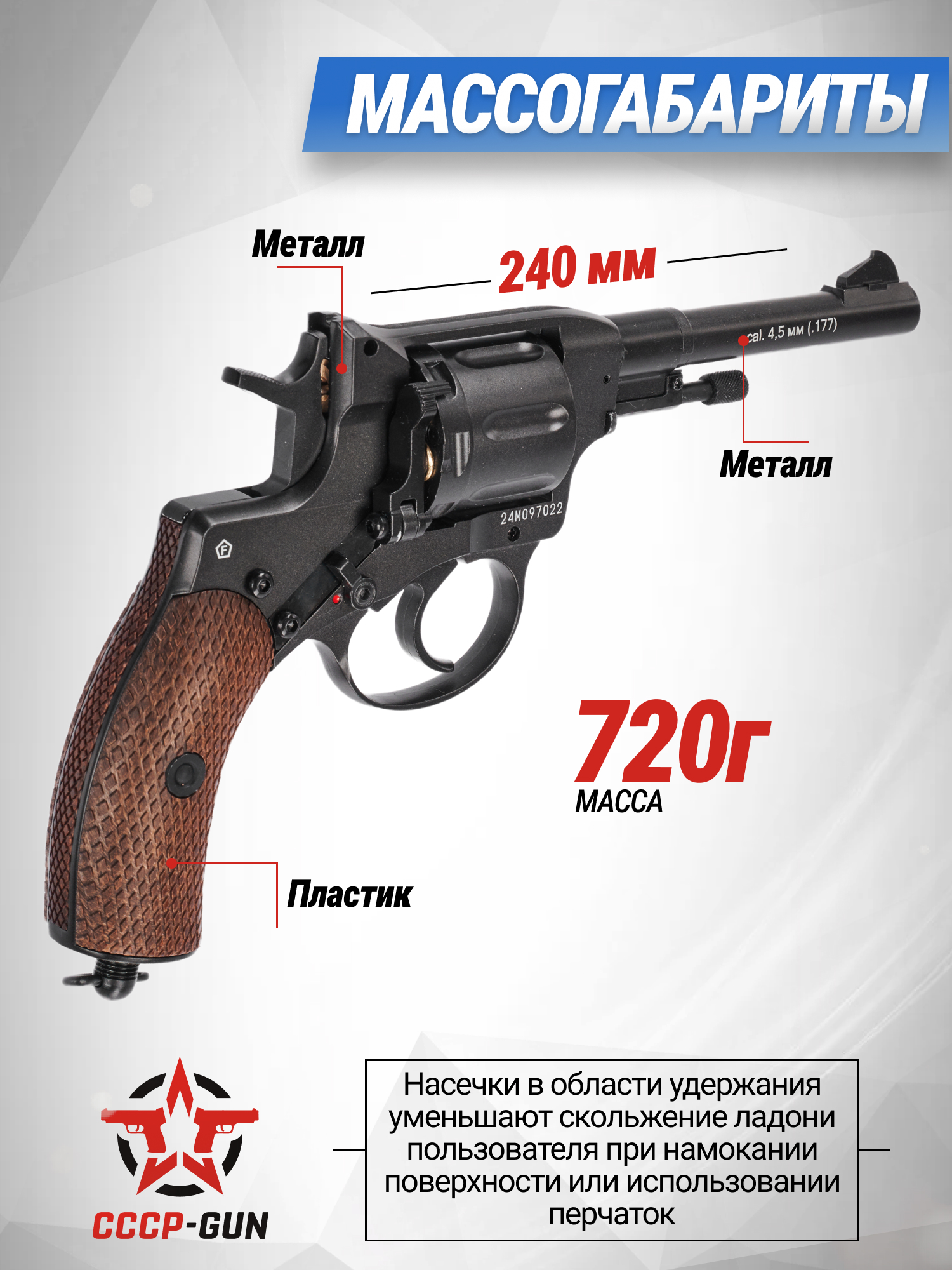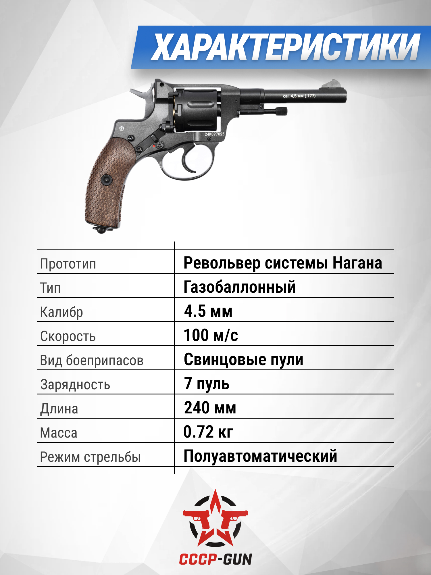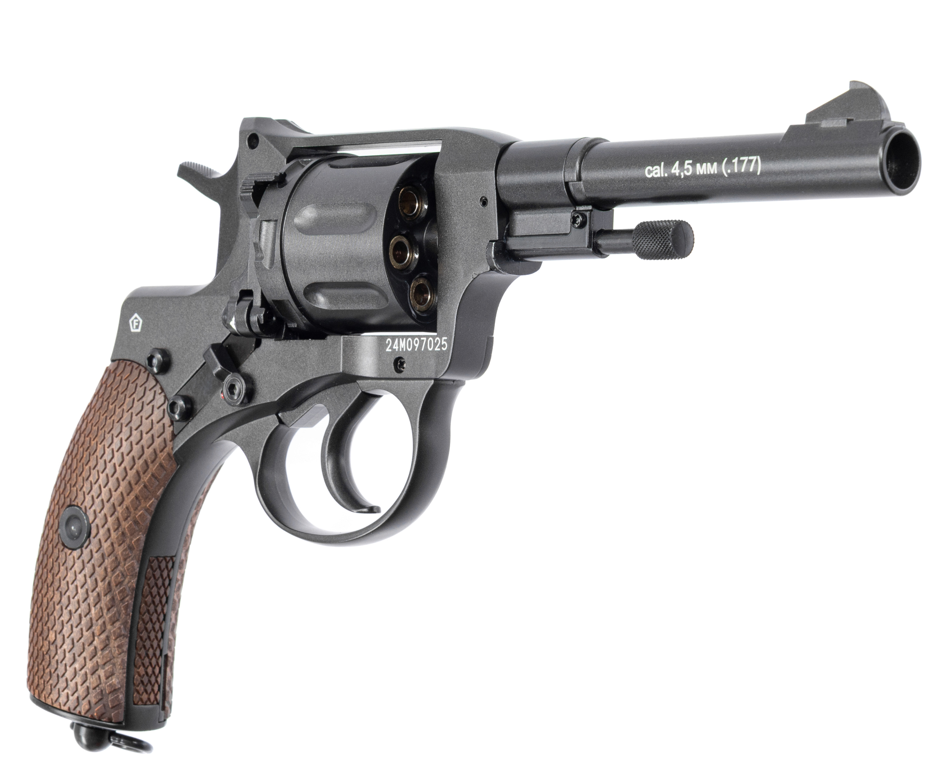 Обозреваемая газобаллонная версия функционирует за счет энергии, образуемой при вскипании углекислоты внутри компактной 12-граммовой емкости. Резервуар фиксируется в рукоятке под полимерной накладкой, а для поджима добавлен винт с кольцом для закручивания без дополнительных инструментов. Работает модель в полуавтоматическом режиме, как путем самовзвода, так и в варианте предварительного взведения курка, что помогает визуализировать принцип стрельбы из револьвера.