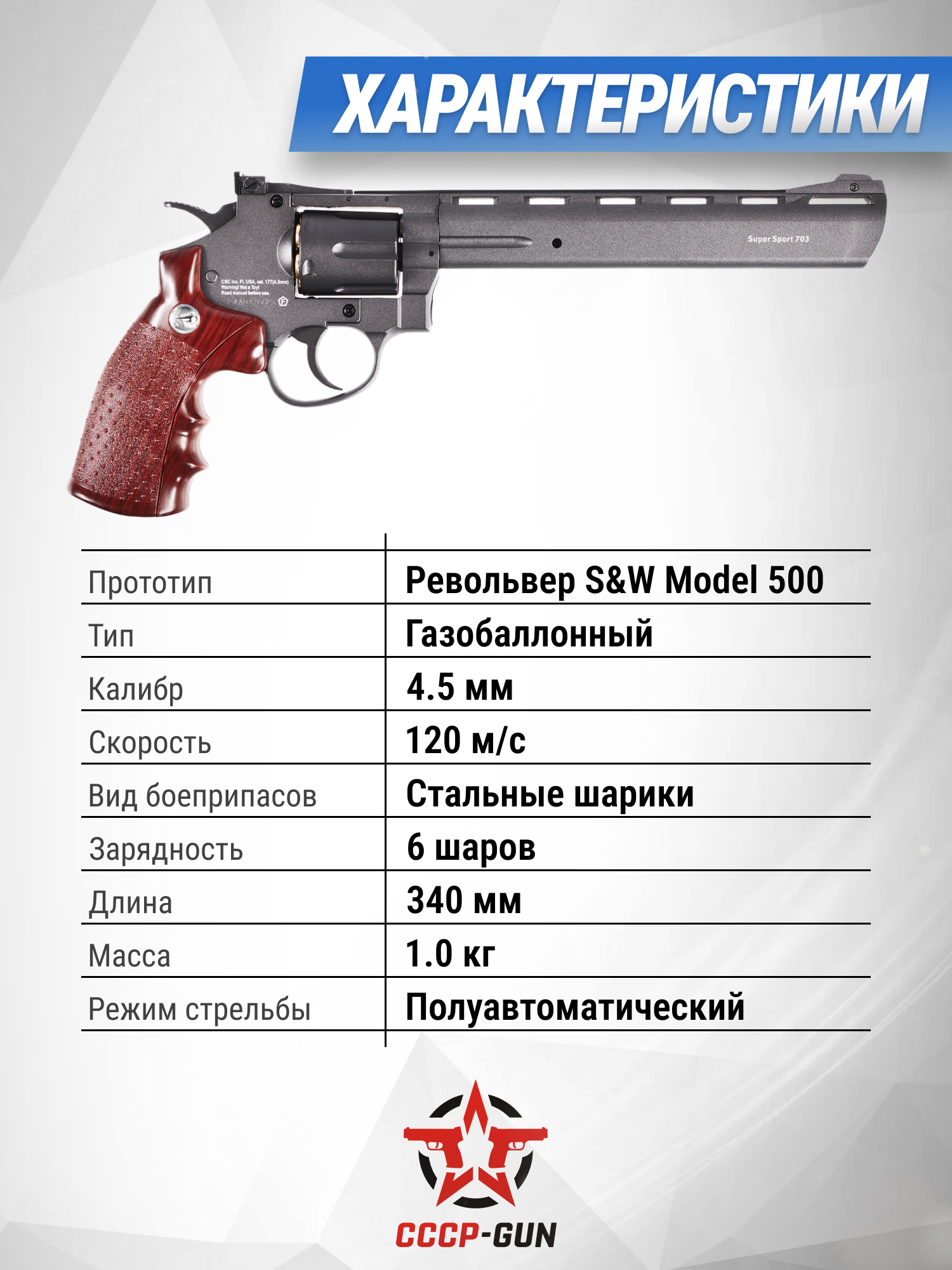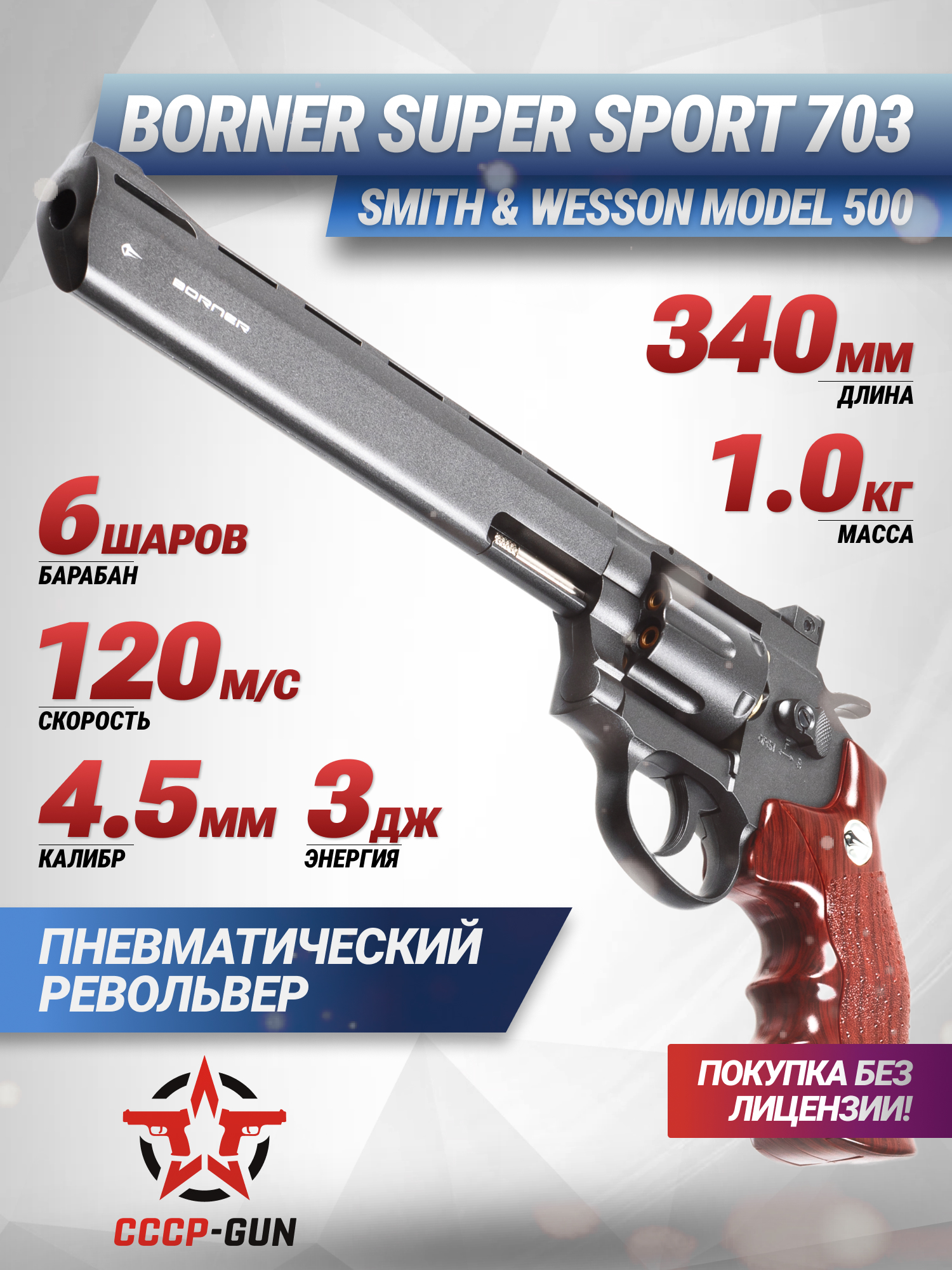 Борнер Супер Спорт 703 использует шарики 4.5 мм в качестве боеприпасов, которые могут разгоняться до 120 метров в секунду. Подобные показатели делают револьвер мощным, но при этом дульная энергия не превышает 3 Дж, поэтому изделие на территории России продается в свободном доступе. Благодаря таким характеристикам производитель дает возможность покупать рассматриваемую пневматику без получения разрешения на оружие, что считается плюсом для начинающих пользователей.