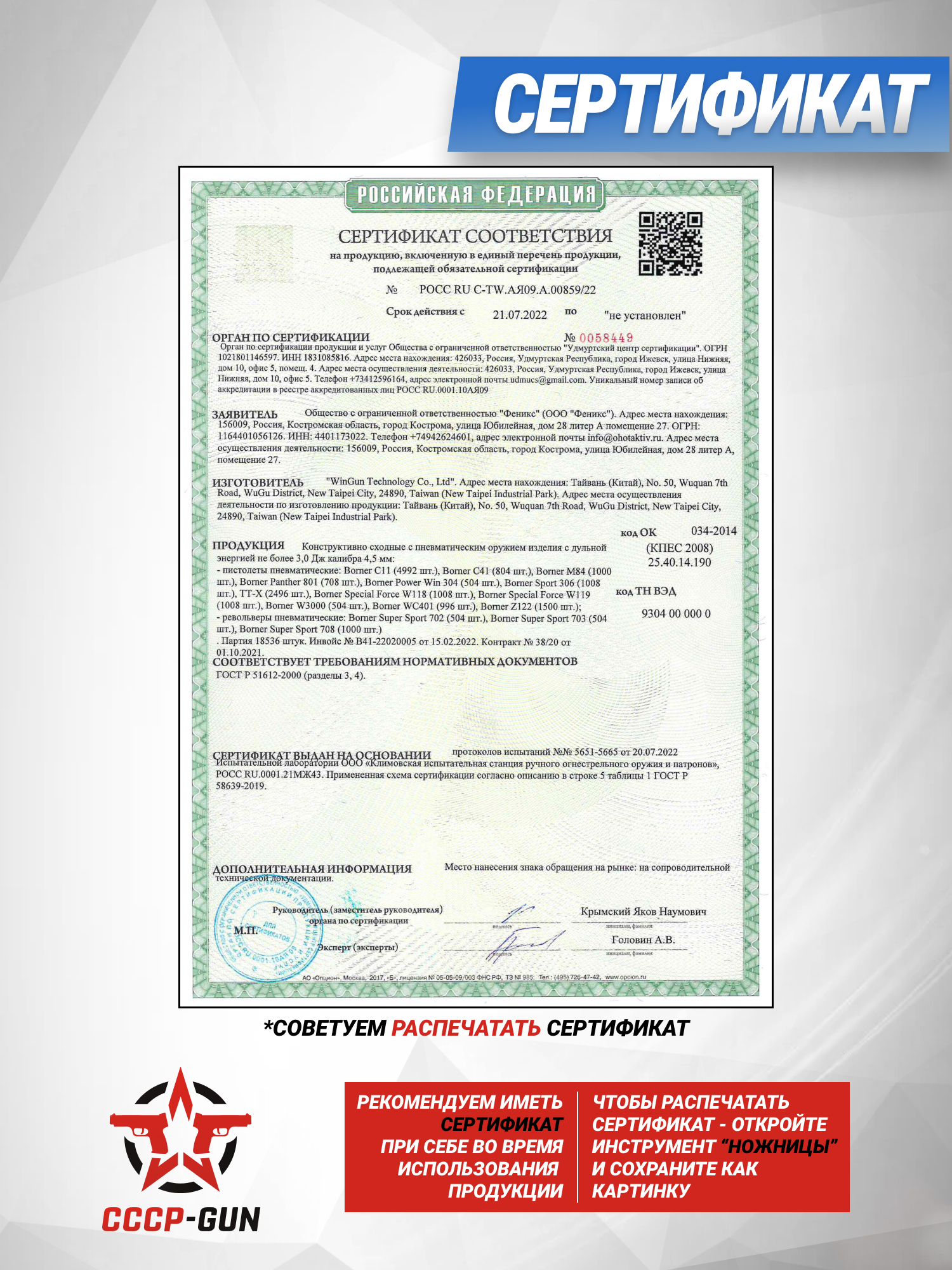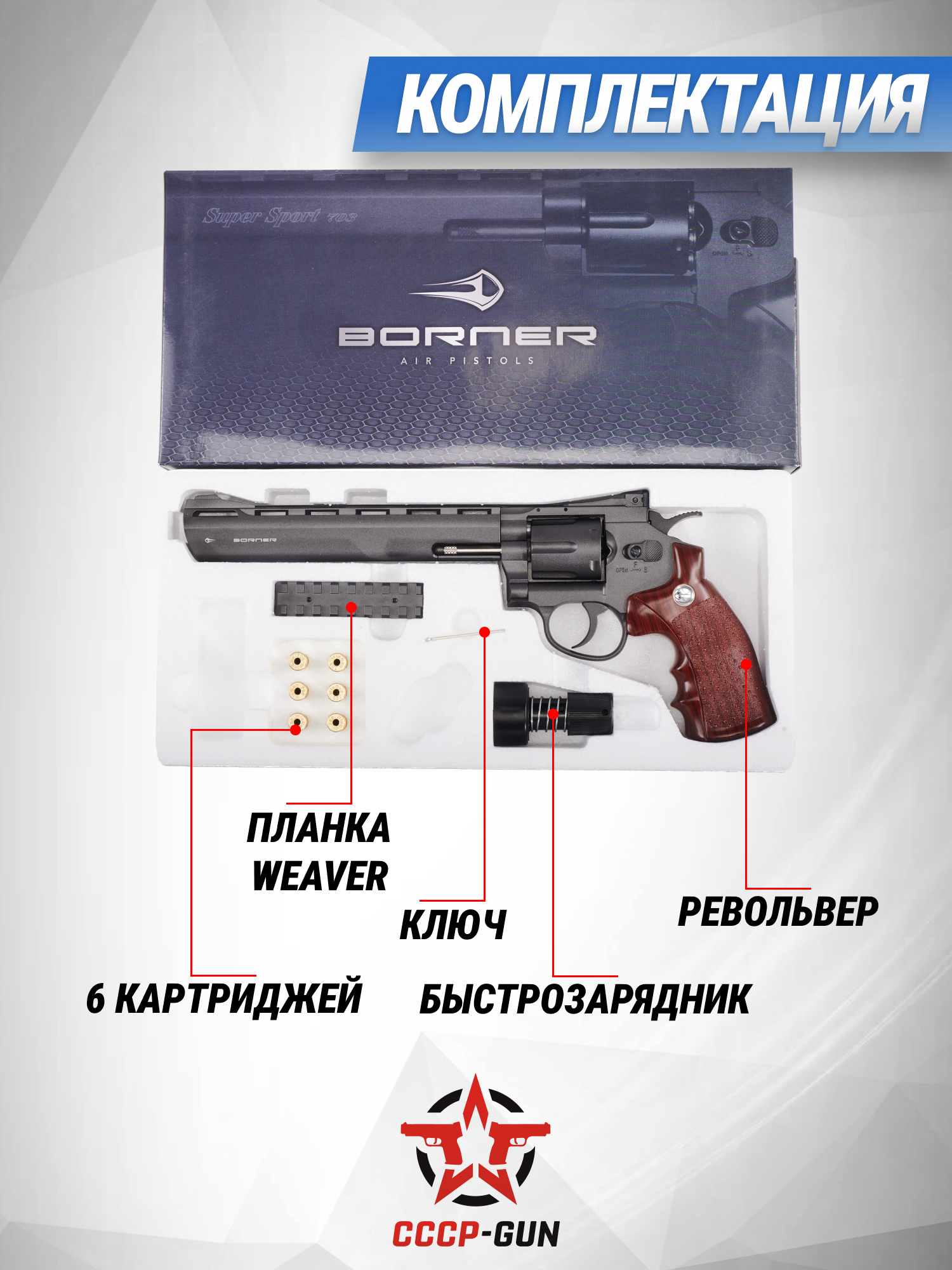 Пневматический револьвер Borner Super Sport 703 изготовлен из металла, исключение составляют пластиковые накладки рукояти. Требуется упомянуть, что подобная конструкция помогает скрыть паз, в который помещается 12-граммовый баллончик с углекислотой. Во время вскипания данная жидкость нагнетает давление за счет выделения газа, выступающего в качестве энергии для выстрела.