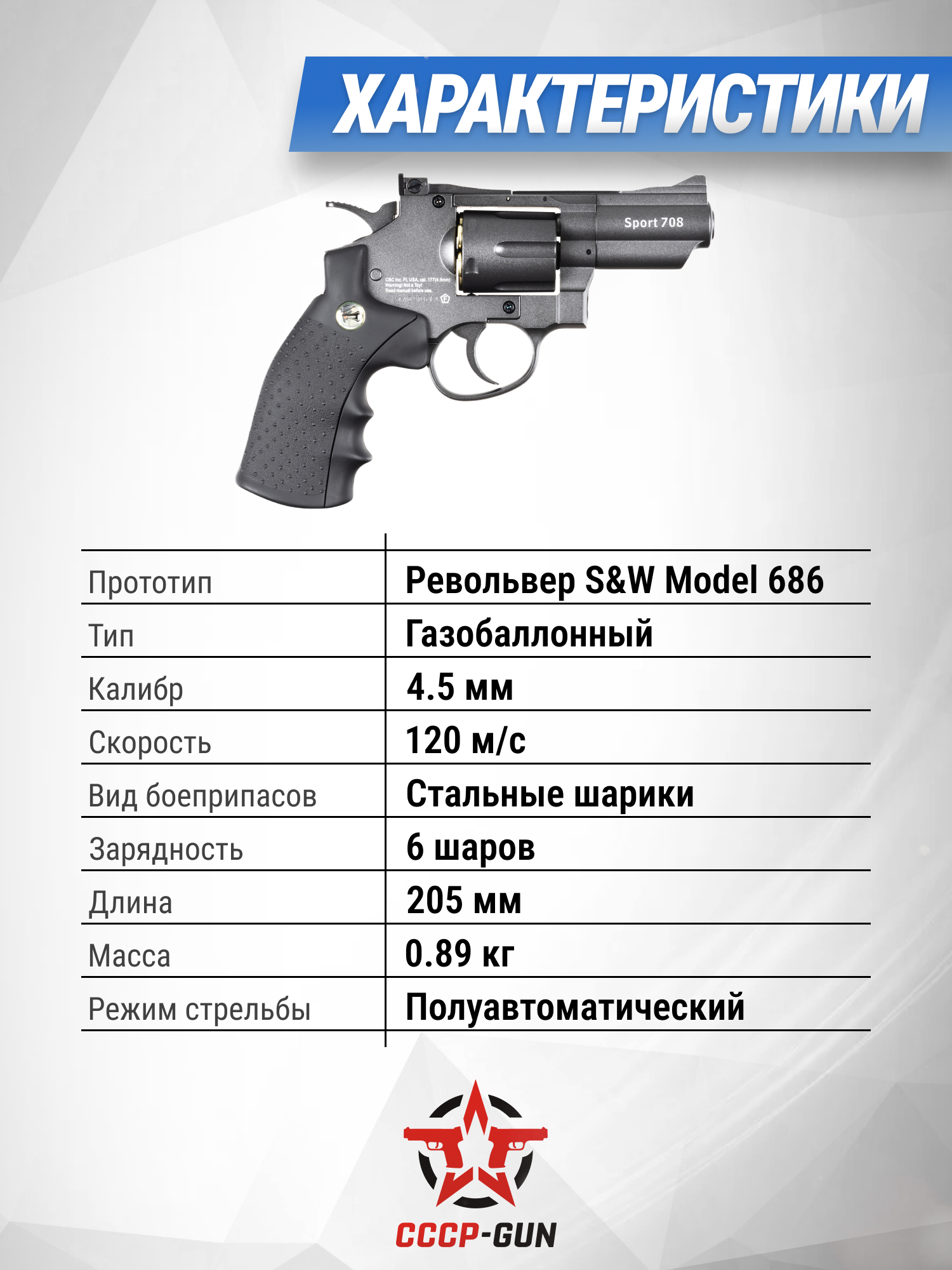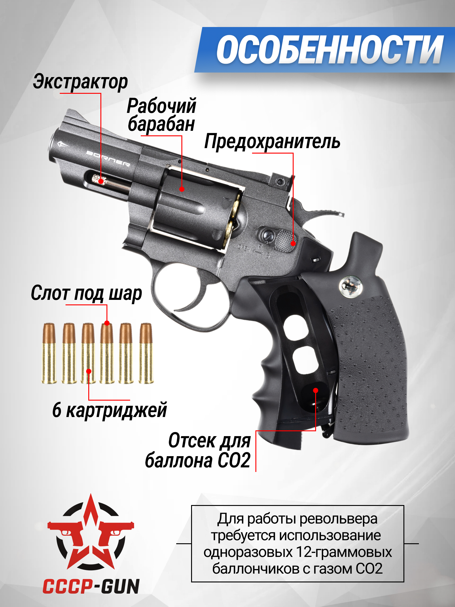 Револьвер пневматический Borner Super Sport 708 стреляет благодаря газовым 12-граммовым баллончикам с углекислотой. Внутри компактного резервуара жидкий состав вскипает и создает необходимое для выталкивания пули давление, которое высвобождается при нажатии на спусковой крючок. Производитель отмечает, что одного баллончика будет хватать приблизительно на восемьдесят выстрелов.