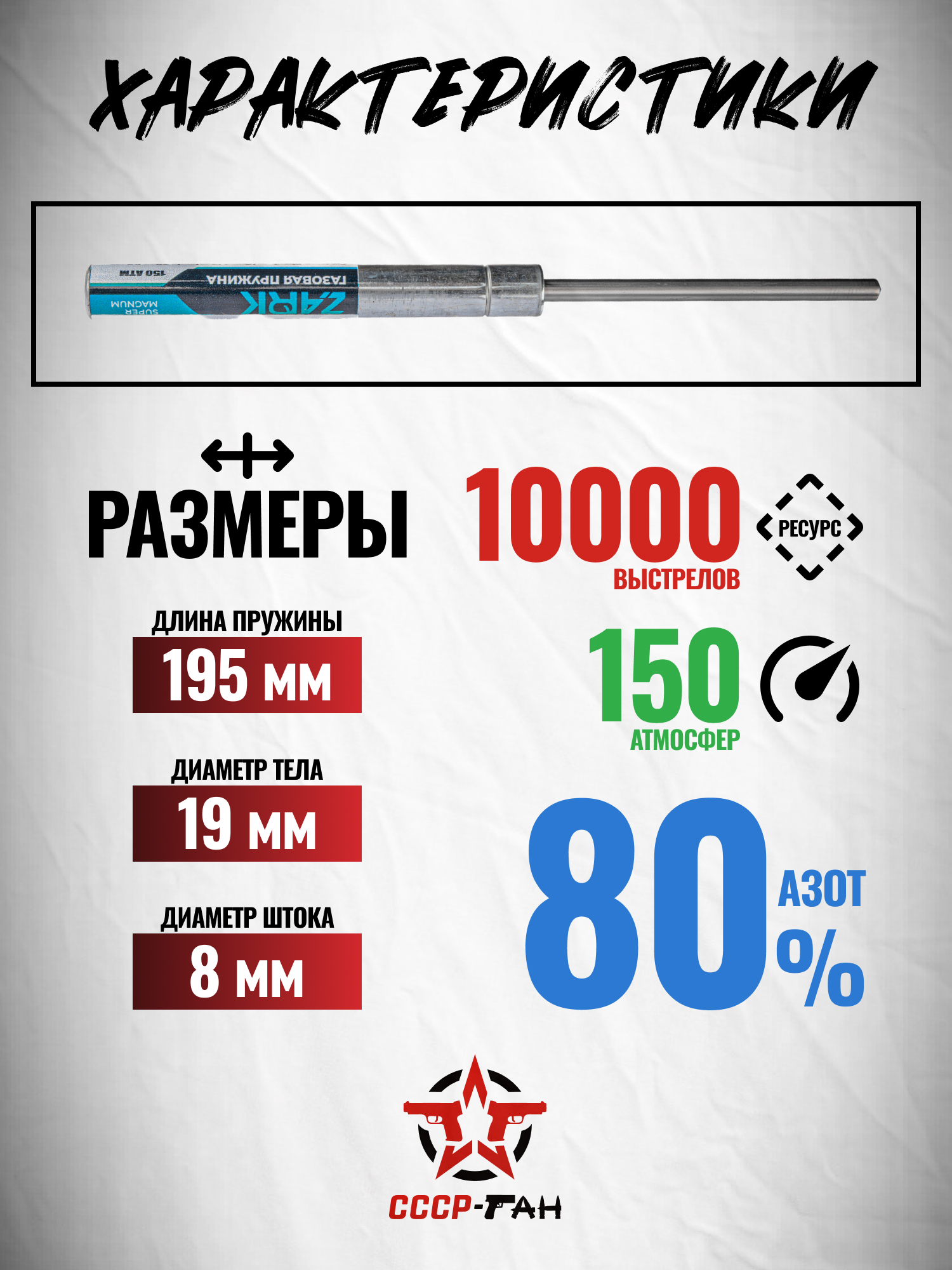 Ширина указанной детали 8 мм, когда тело пружины имеет диаметр 19 мм - изделия Zark встают в указанные винтовки без необходимости в доработках. Материалом для газовой пружины служит металл.