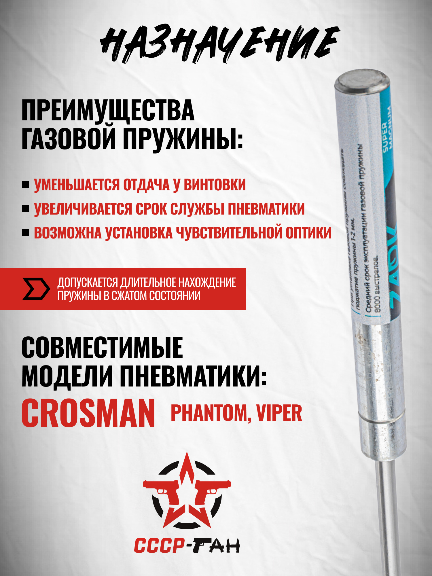 Представленная газовая пружина на винтовку ППП рассчитана под модели Фантом и Viper от заводов Кросман и Гамо. Изделие отнесли к супермагнум классу ввиду увеличенного до 150 Атмосфер усилия пружины - последнее позволит раскрыть весь потенциал, заложенный в конструктив этих винтовок. Пружина наполнена азотом - принцип действия заключается в том, что после срыва поршня газ расширяется быстро и равномерно двигая поршень вперед.