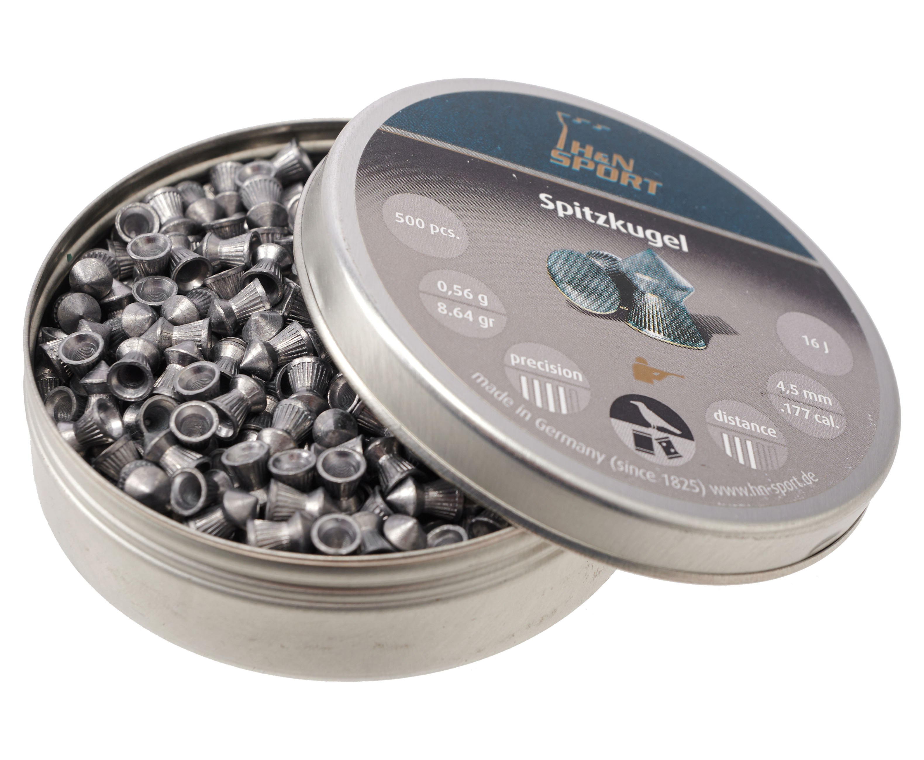Немецкая компания Haendler & Natermann уже давно выпускает свинцовые пули для пневматического оружия. Продукция бренда отличается четкой геометрией и точной массой изделий. Модель Neue Spitz-Kugel входит в категорию спортивных и предназначена для стрельбы на средние расстояния, где важны пробивная сила и устойчивость траектории.