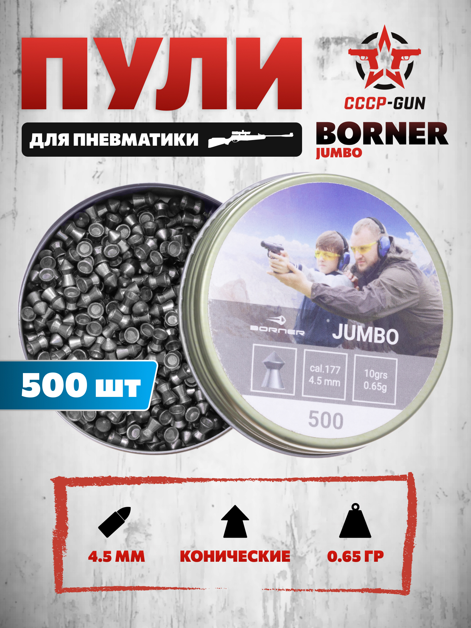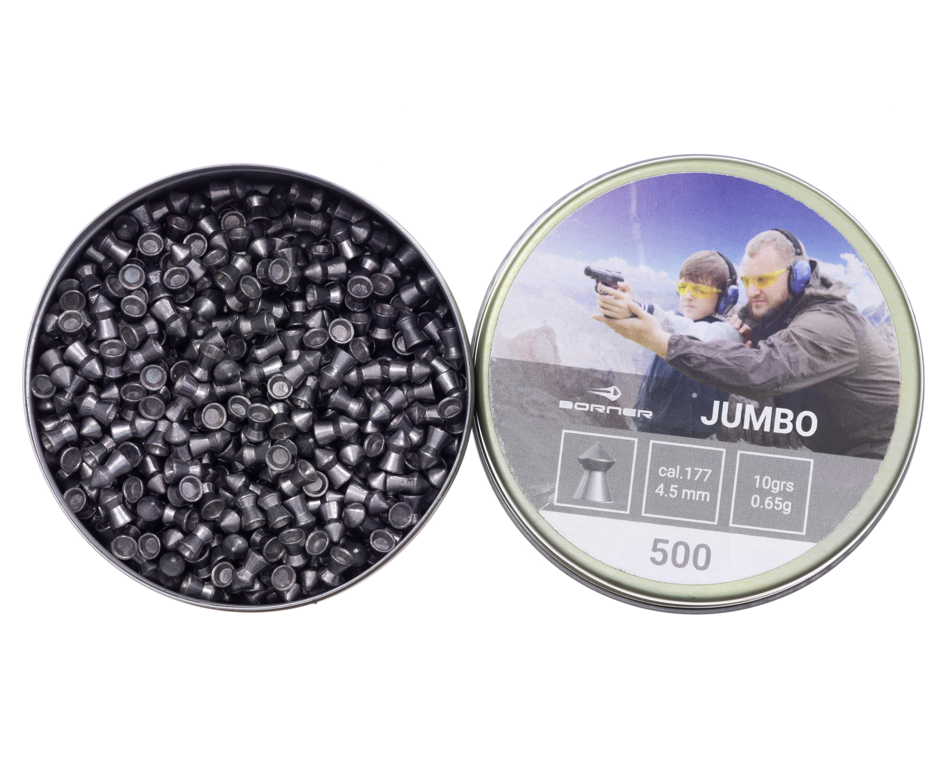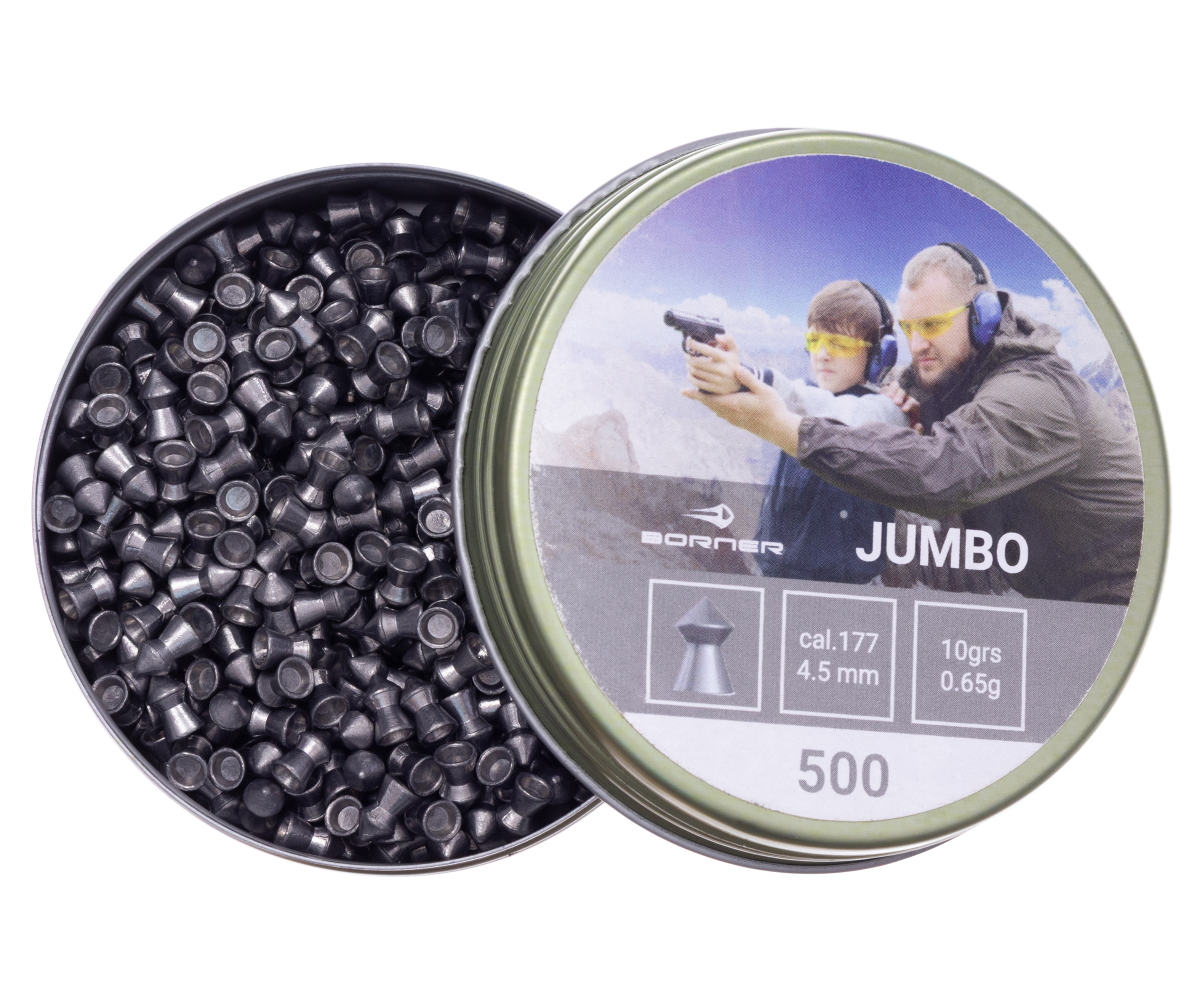Примером продукции от Борнер выступает серия Jumbo - каждый заряд изготавливается с использованием свинца на высокоточном станочном оборудовании. Масса отдельного элемента в партии составляет 0.65 грамма, а диаметр соответствует калибру 4.5 миллиметра, что позволяет применять их в большинстве пневматических устройств. Коническая конфигурация переднего сегмента гарантирует улучшенные проникающие свойства, а также уменьшение сопротивляемости воздуху в момент выстрела.