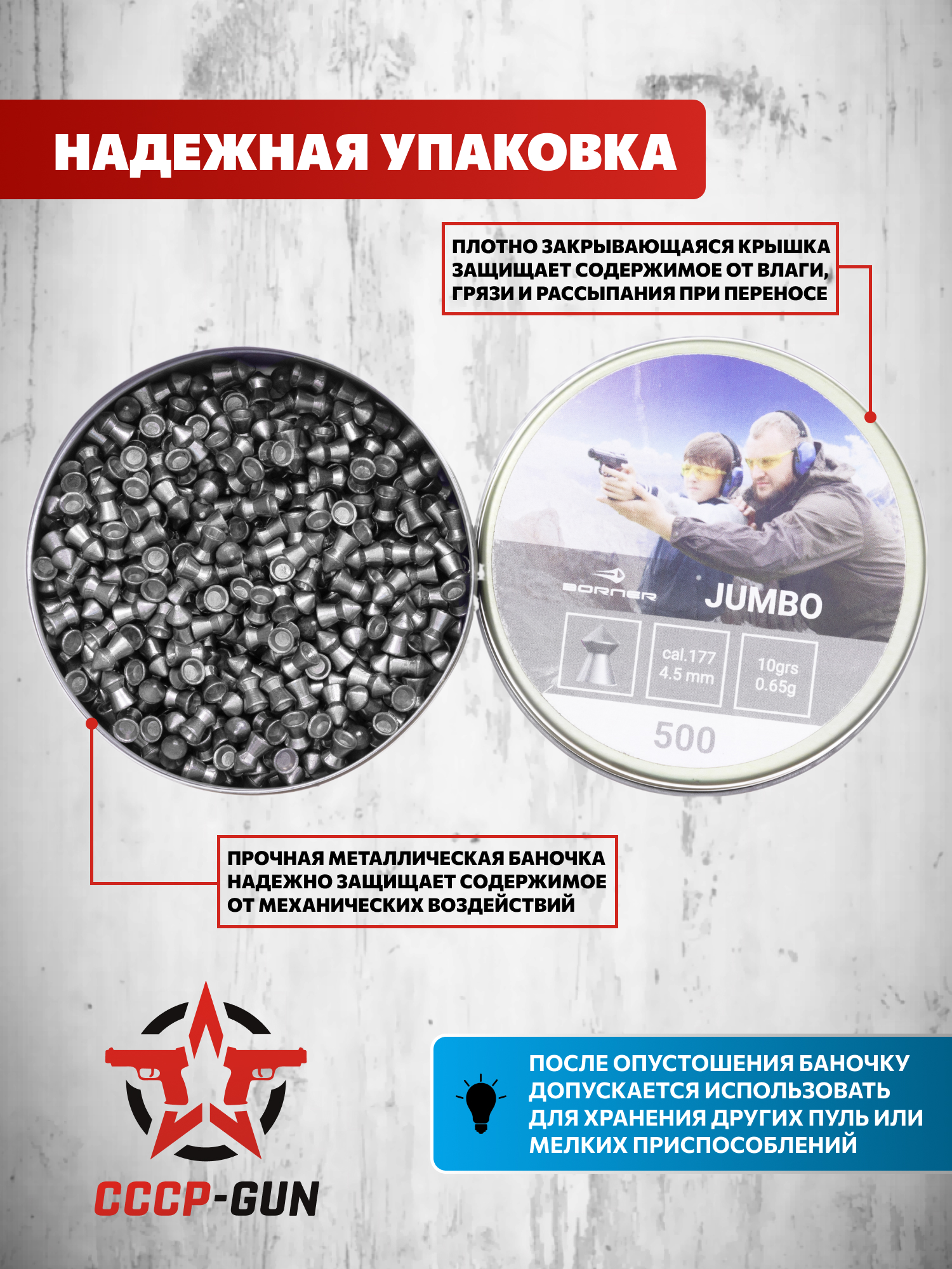 Конкретные пули для воздушки 4.5 мм поставляются в защитной таре, каждая из которых включает 500 единиц боеприпасов - такого количества достаточно для регулярных тренировок. Указанный контейнер предусматривает отъемную крышку - она требуется, чтобы переносимые снаряды не выпадали при переносе, а также для защиты от воды или грязи.