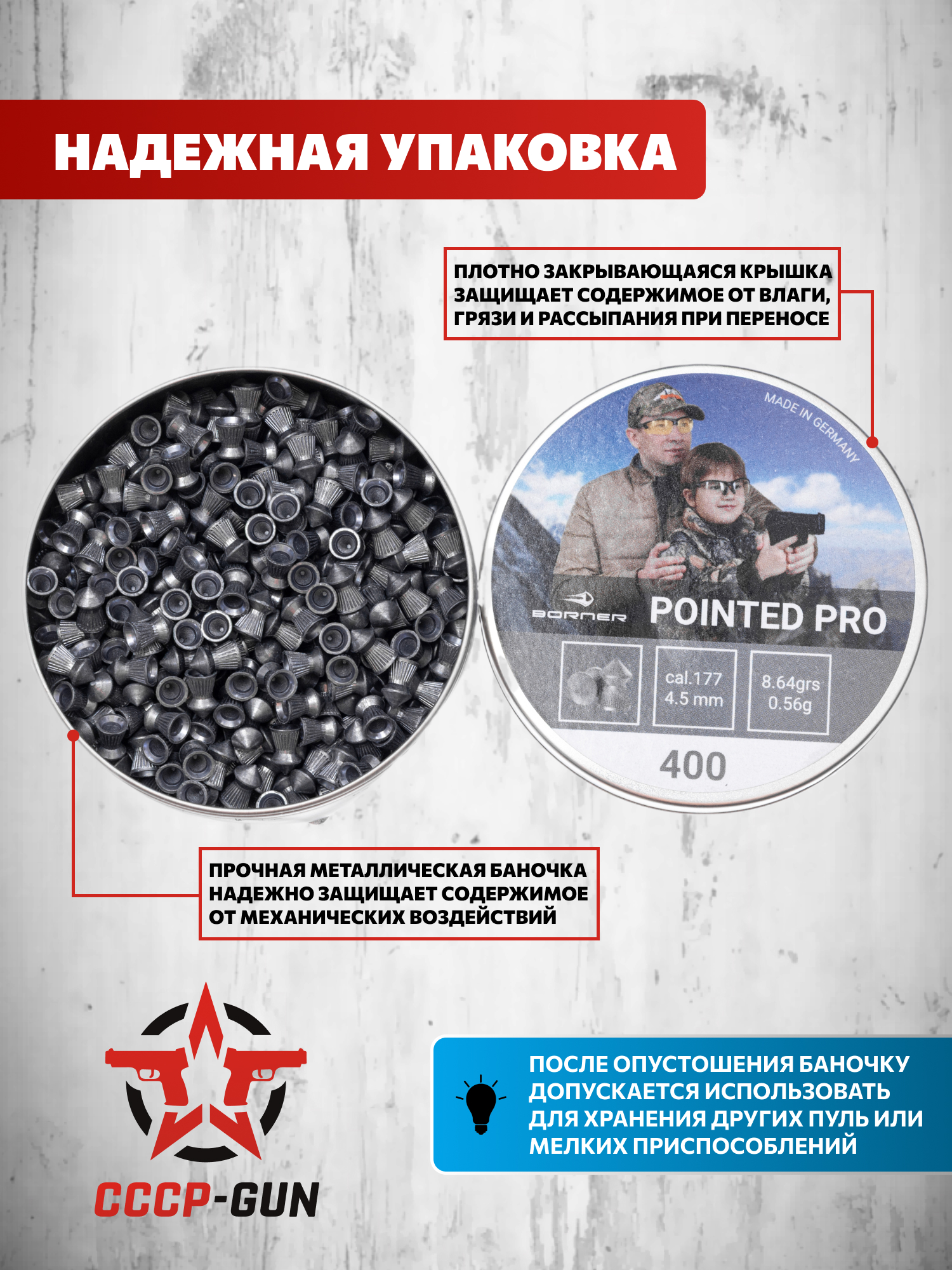 В упаковке - 400 пуль. Металлическая банка защищает содержимое от пыли и механических повреждений, а также комфортно открывается и надежно закрывается.