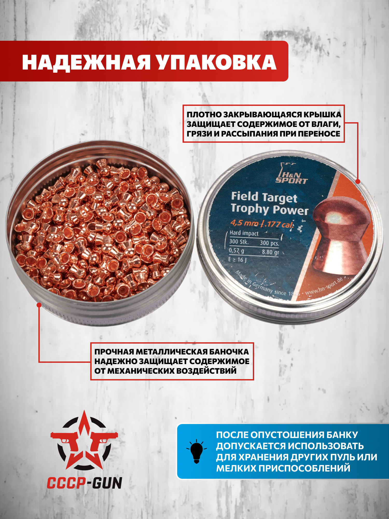 Логистическое решение соответствует стандартным нормам - пули H&N Field Target Trophy Power уложены в классическую округлую баночку в количестве 300 единиц. Защитная крышка предотвращает проникновение влаги и абразивных частиц, позволяя сохранять эксплуатационные параметры содержимого даже при продолжительном хранении. Компактные габариты упаковки допускают перенос в кармане стрелкового жилета или сумке для снаряжения.
