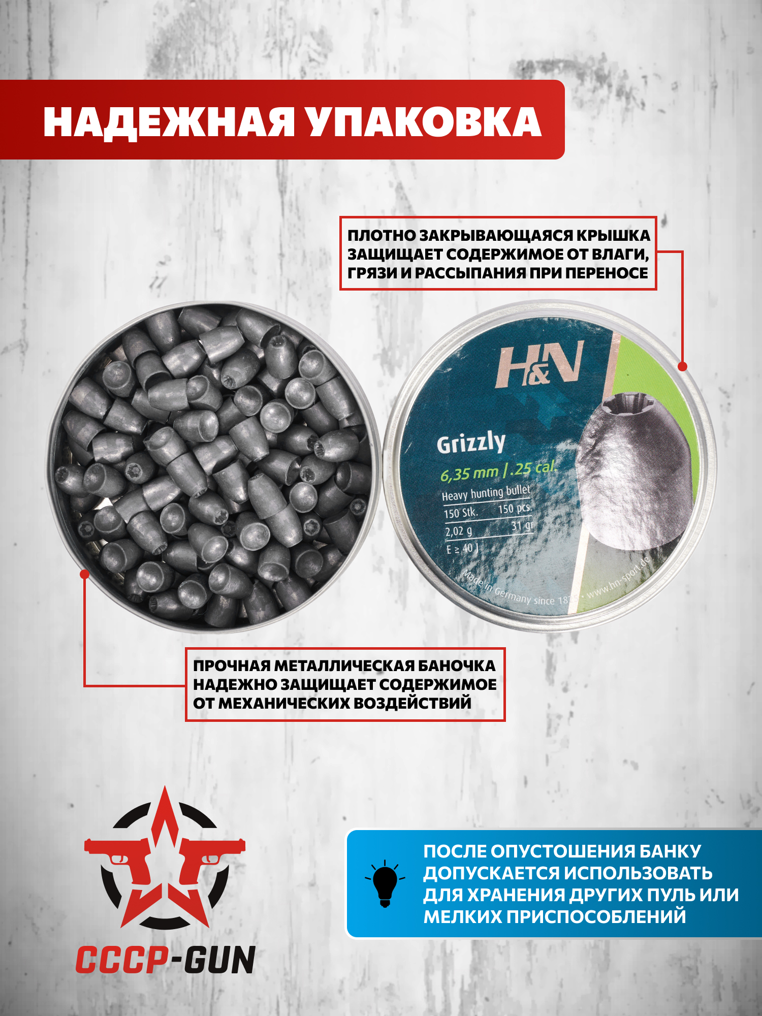 Продукция поставляется в металлической таре, оснащенной крышкой для защиты содержимого от проникновения грязи, пыли или влаги. Банка в конкретном варианте изготовления рассчитана на 150 единиц боеприпасов.