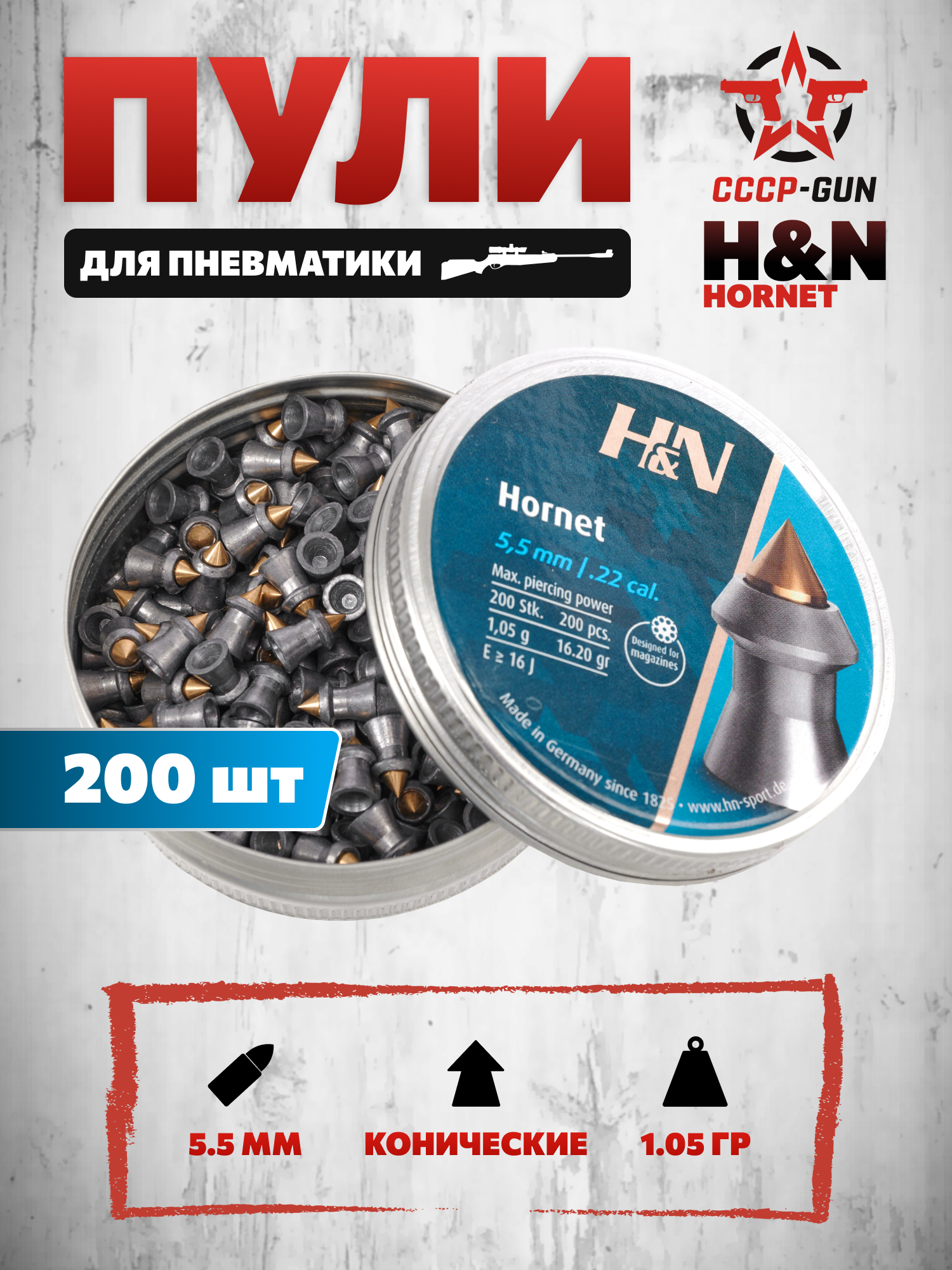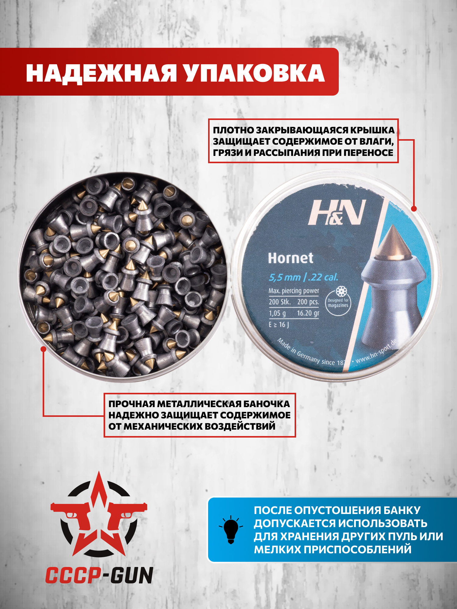 Представленные пули калибра 5.5 от ХиН демонстрируют оптимальную эффективность при стрельбе - масса одной штуки в партии составляет 1.05 грамма. Продукция поставляется в металлической компактной баночке, которая в конкретном исполнении содержит 200 экземпляров. Указанный контейнер предотвращает повреждение содержимого при перевозке или хранении, сохраняя первоначальные характеристики каждого элемента - крышка тары не даст рассыпаться содержимому, а также исключит проникновение влаги или грязи.