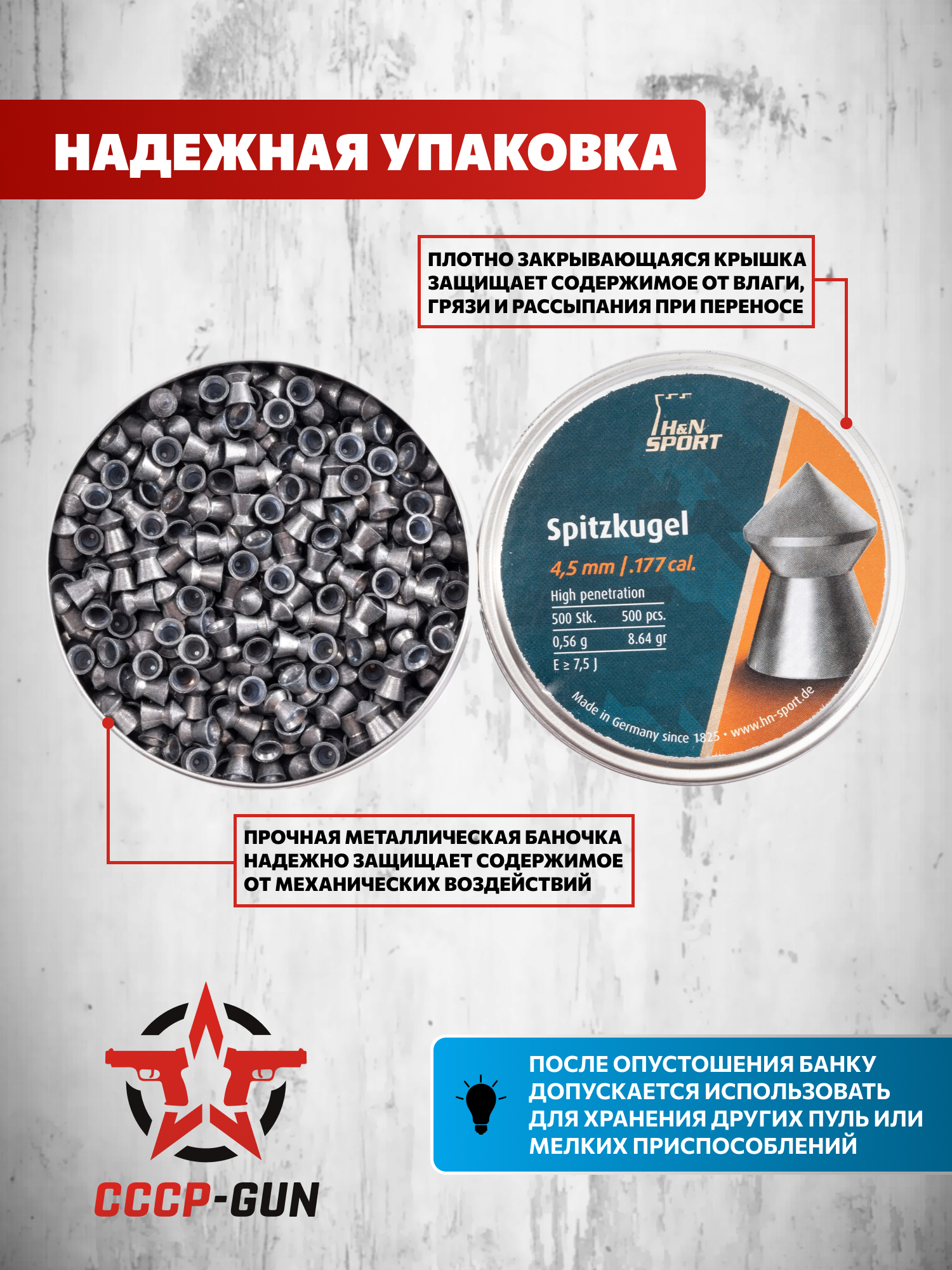 Образцы поставляются в упаковках, вмещающих 500 снарядов. Каждая банка предусматривает плотную крышку, которая защищает пули от влаги и грязи при транспортировке и хранении, гарантируя сохранность боеприпасов на протяжении продолжительного времени.