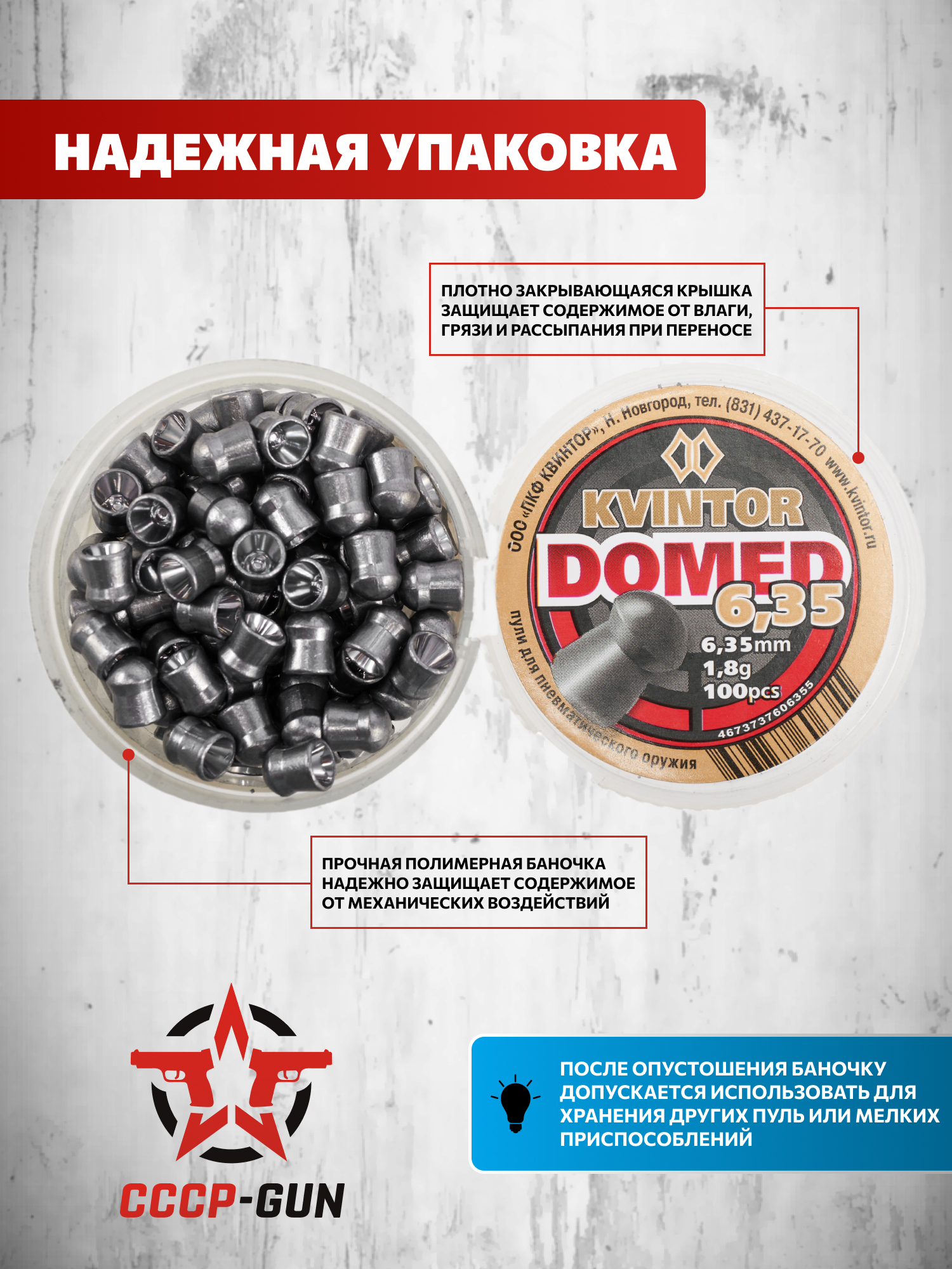 Рассматриваемые заряды серии Domed с полусферической головкой предназначаются для пневматических винтовок и пистолетов с нарезным стволом под калибр 6.35 миллиметра. Весовой параметр каждого экземпляра линейки фиксируется на отметке 1.8 грамма. Подобная масса способствует удержанию кинетической энергии вдоль траектории без критического падения скорости.