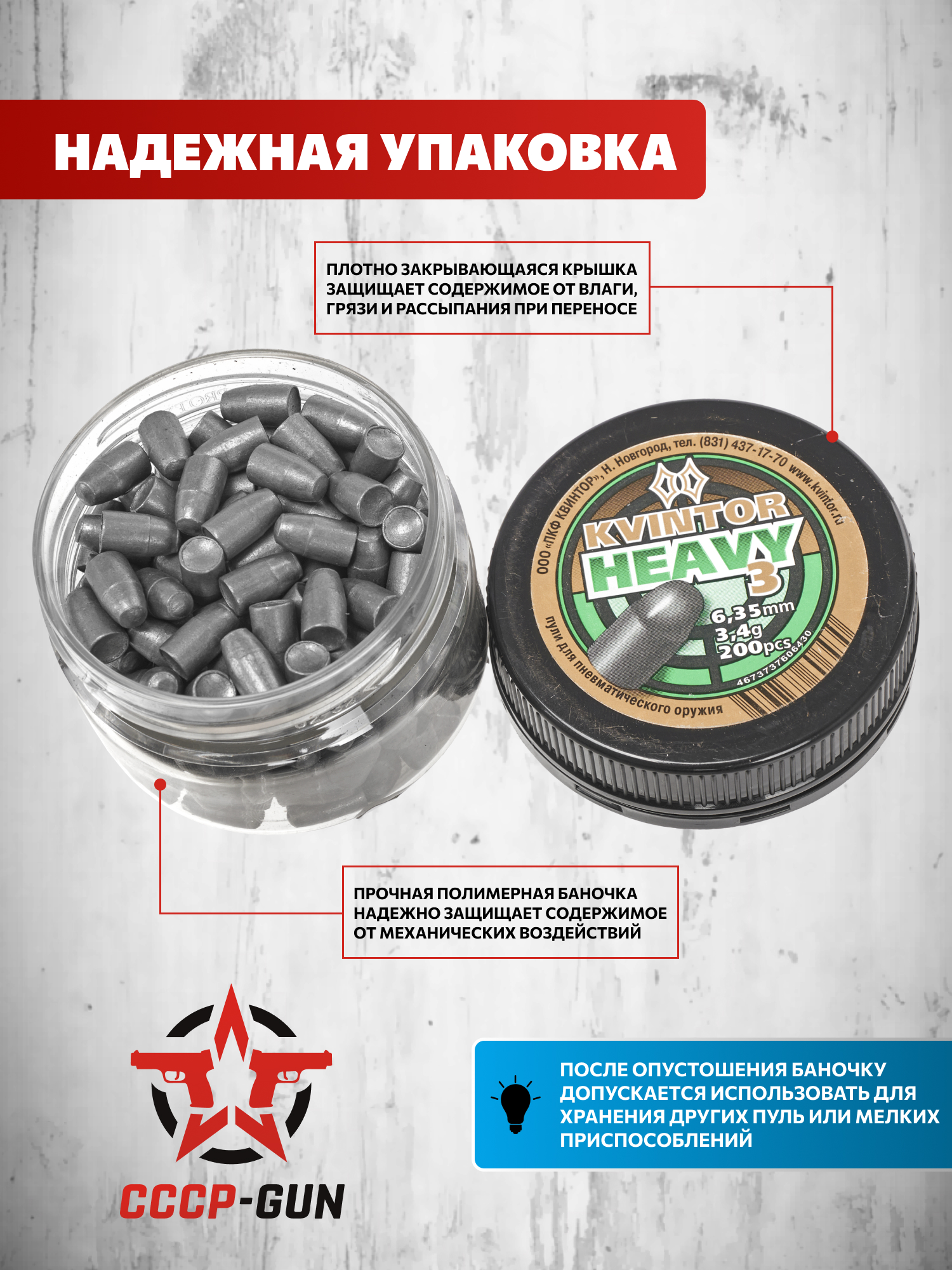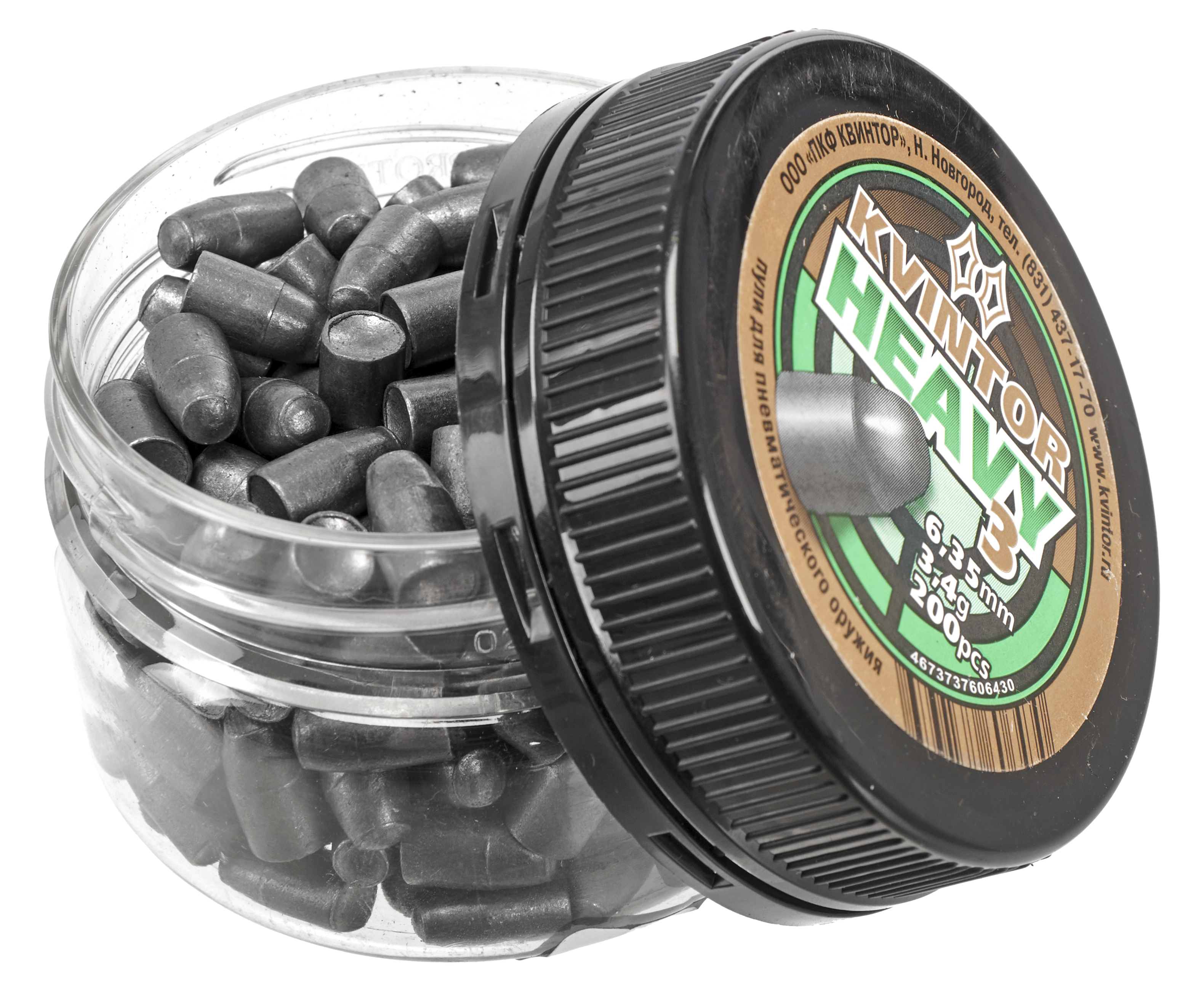 Технологический процесс поддерживается применением высокоточного оборудования, гарантирующего соблюдение геометрических параметров и веса - полусферическая форма головки способствует минимизации воздушного сопротивления, улучшая стабильность траектории полета. В представленном случае снаряды Kvintor Heavy предполагают совместную эксплуатацию с пневматикой калибра 6.35 миллиметра.