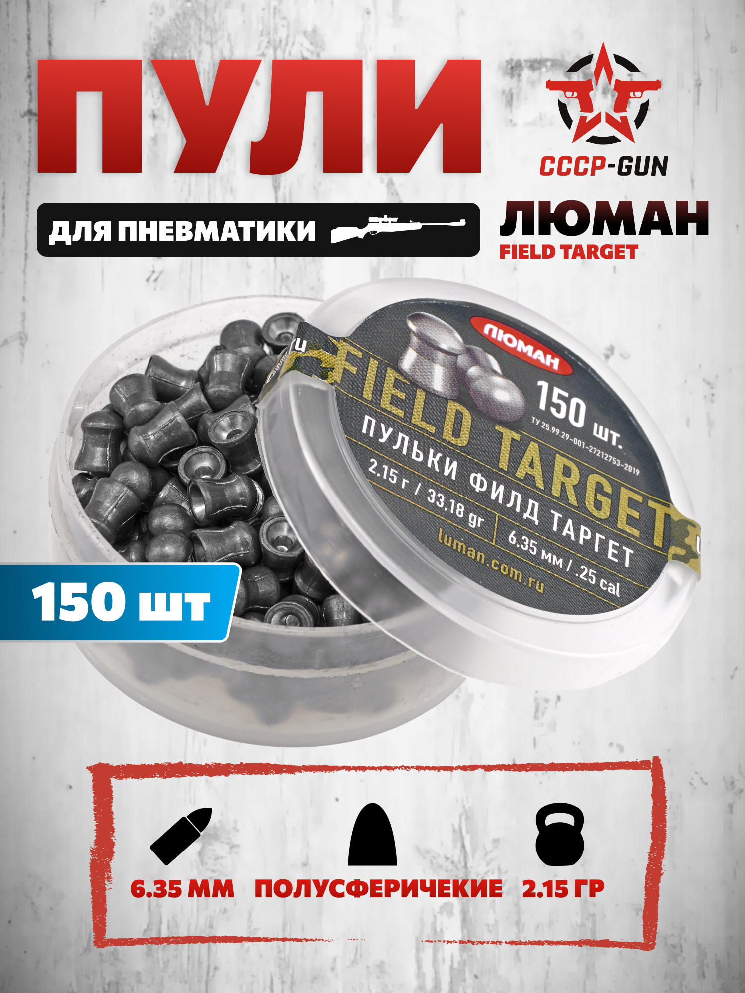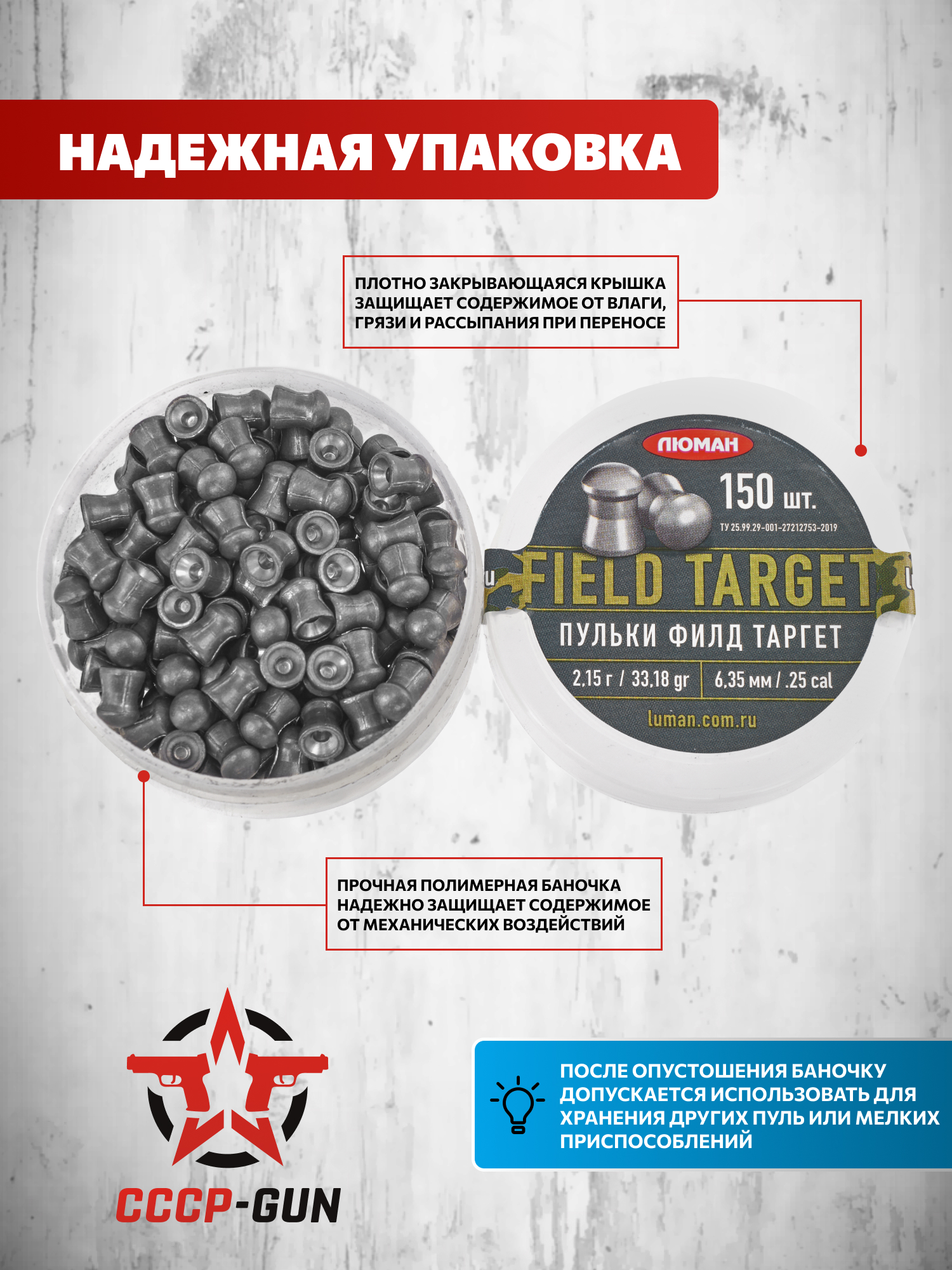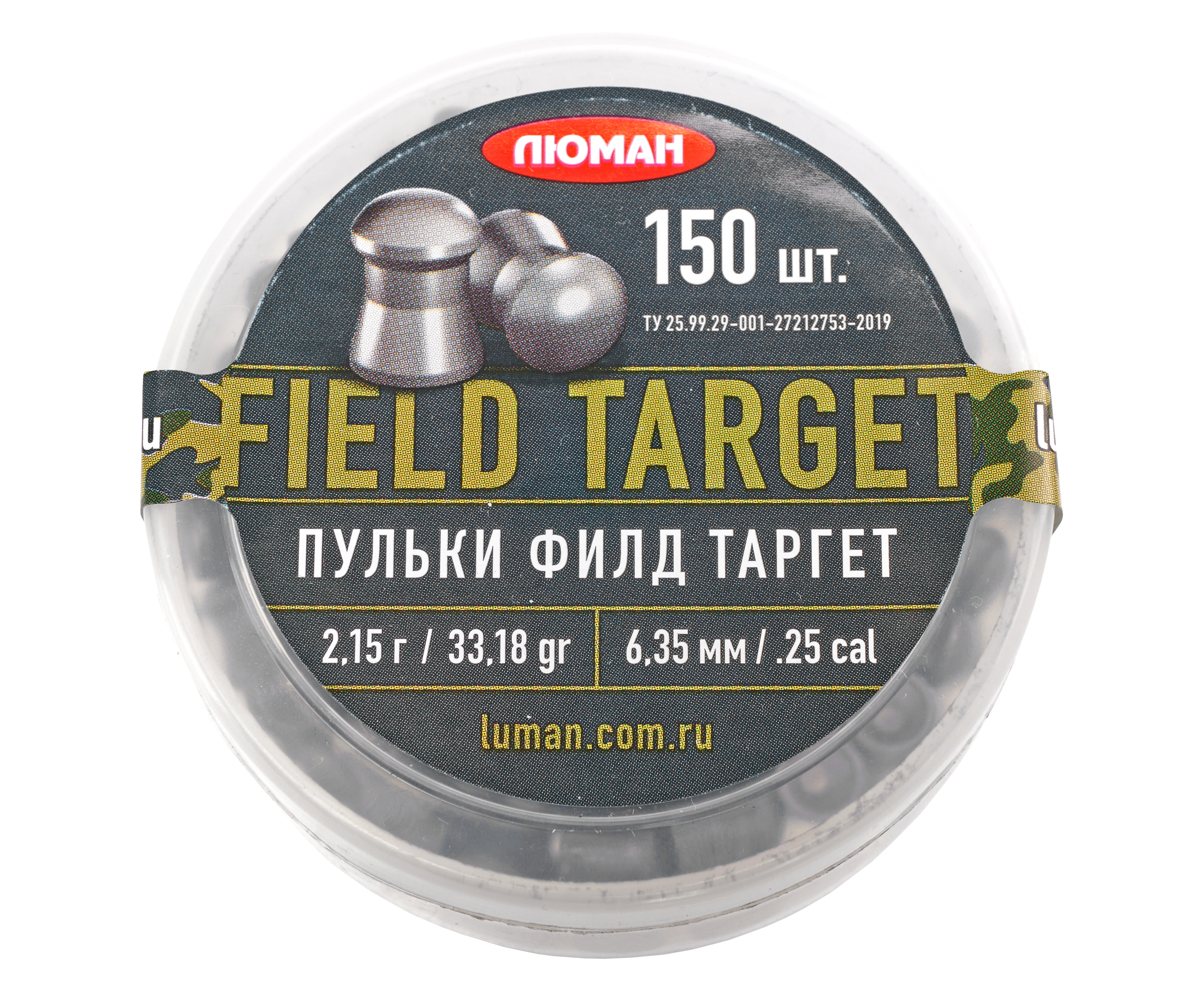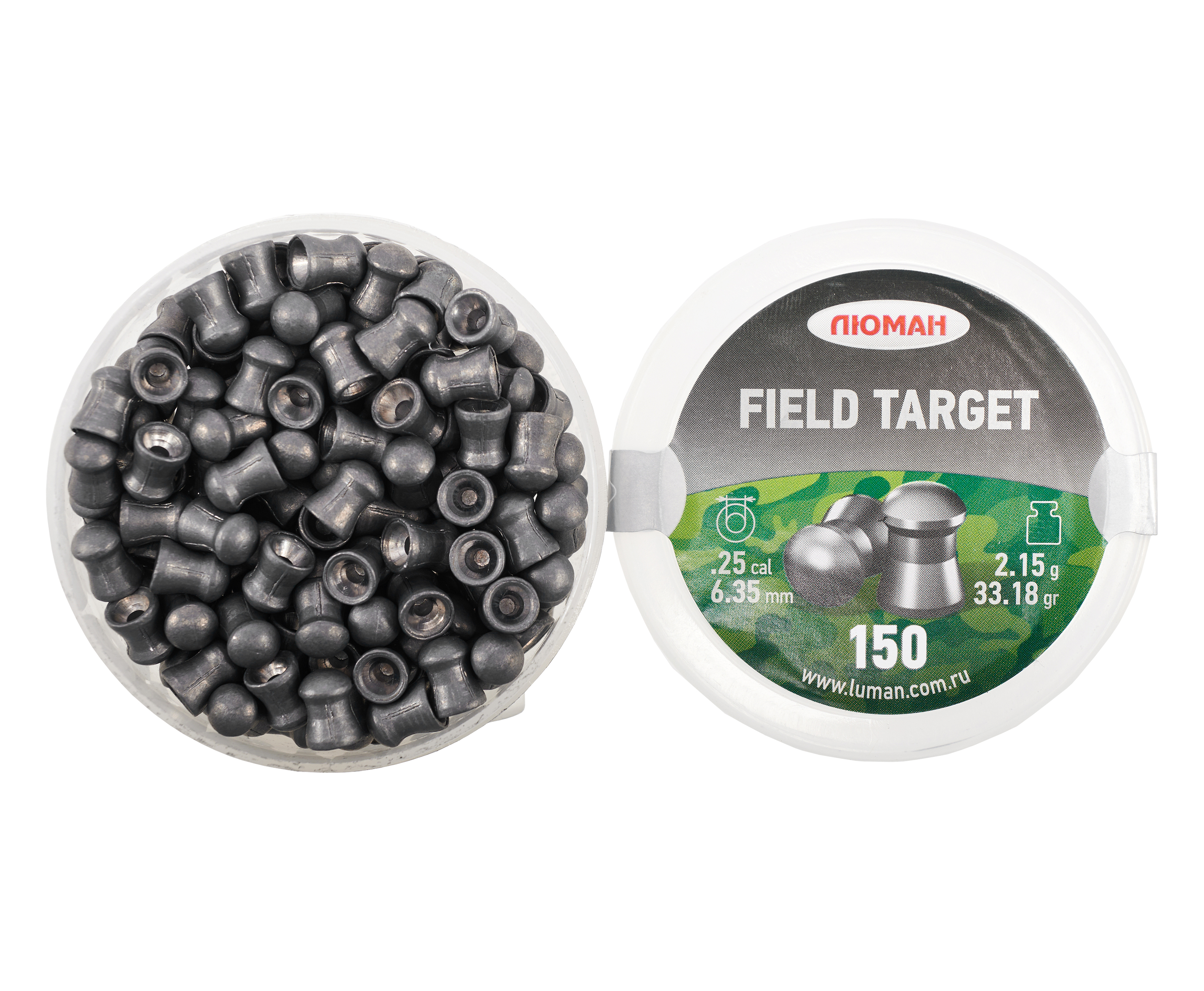 Пневматические пули Люман Field Target продаются в металлических банках с резьбовой крышкой, которые включают 150 единиц представленных боеприпасов.