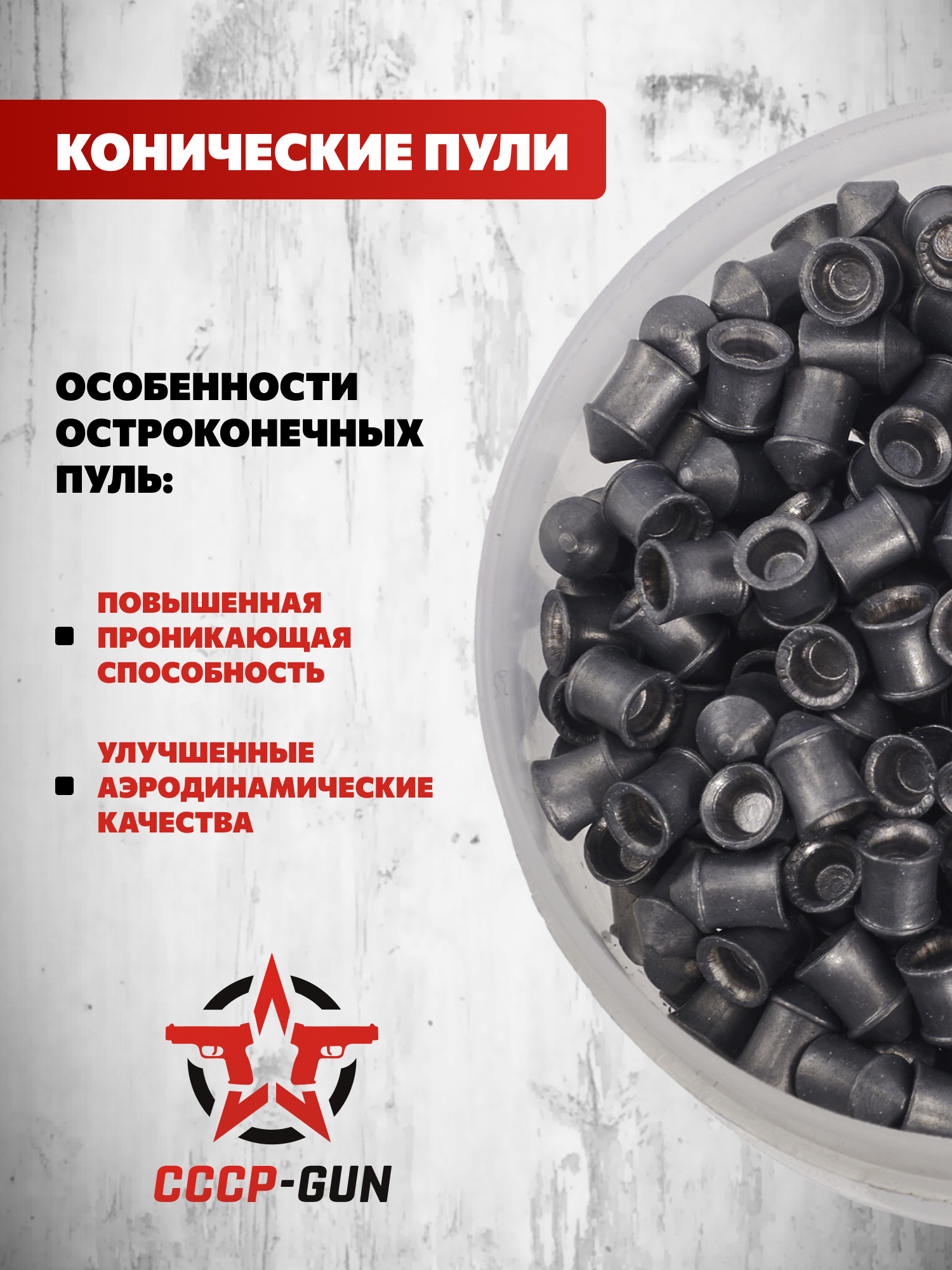 Коническая форма головного участка способствует минимизации лобового сопротивления, увеличивая эффективную дальность поражения целей. Кроме того, такой формат передней секции способствует улучшению пробивной способности. Внешний диаметр боеприпасов предполагает использование с пневматикой калибра .177.