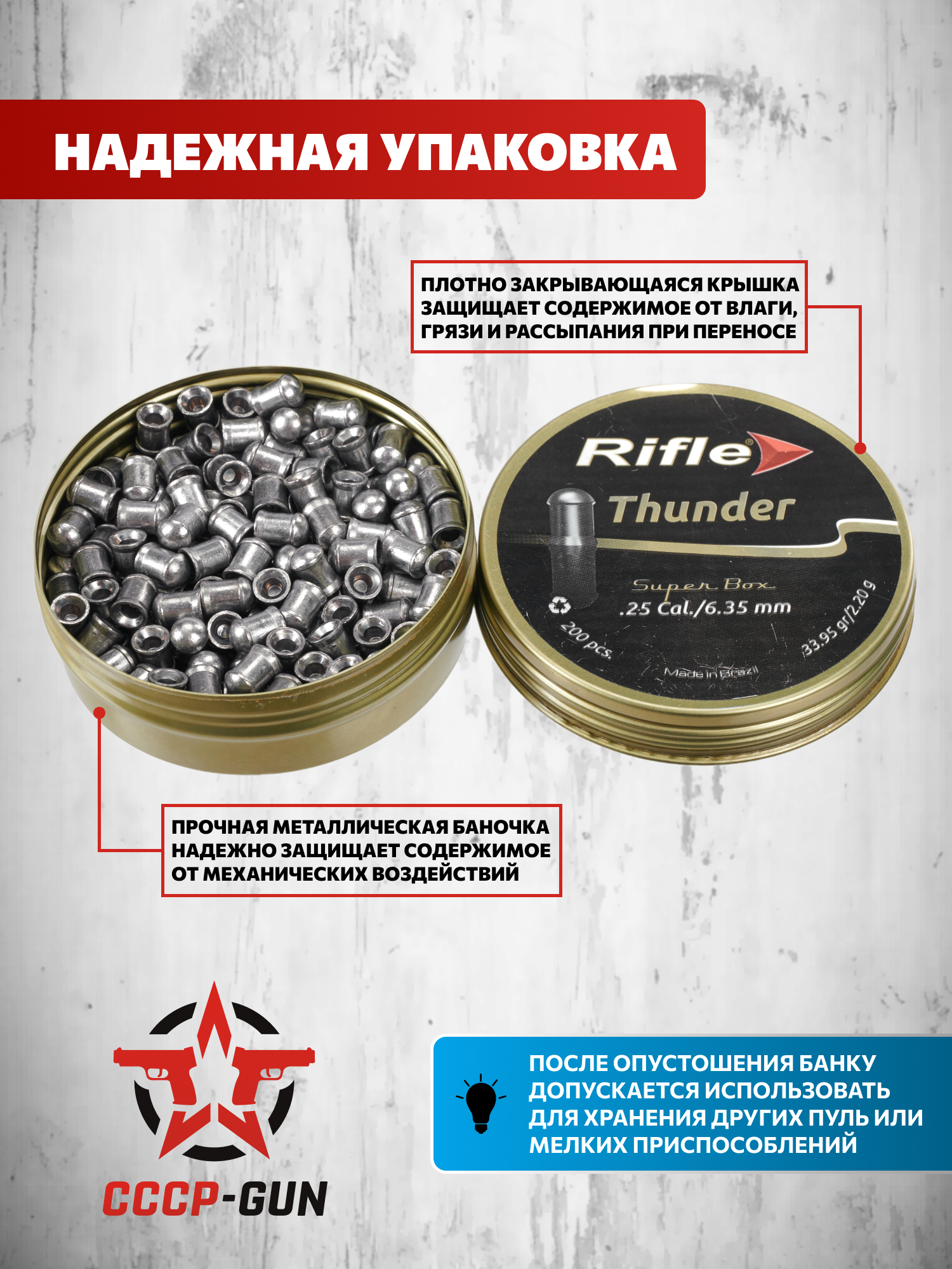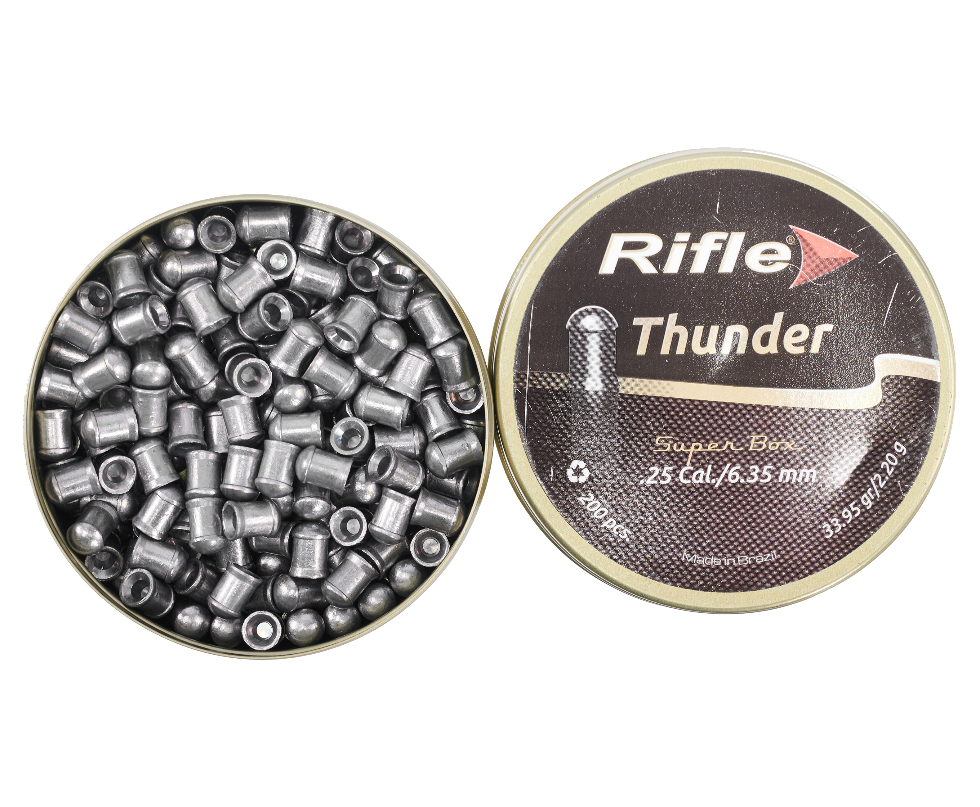 Бразильская компания Rifle специализируется на выпуске свинцовых пуль для пневматики разных типов. Среди ее продуктов выделяется серия Field Series, разработанная для стрельбы из сильных PCP-винтовок. Модель Thunder 6.35 мм относится к этой линейке и представляет собой тяжелые полусферические снаряды, ориентированные на стабильную баллистику и уверенную пробиваемость - эти боеприпасы применимы как для охотничьих, так и для технических задач.