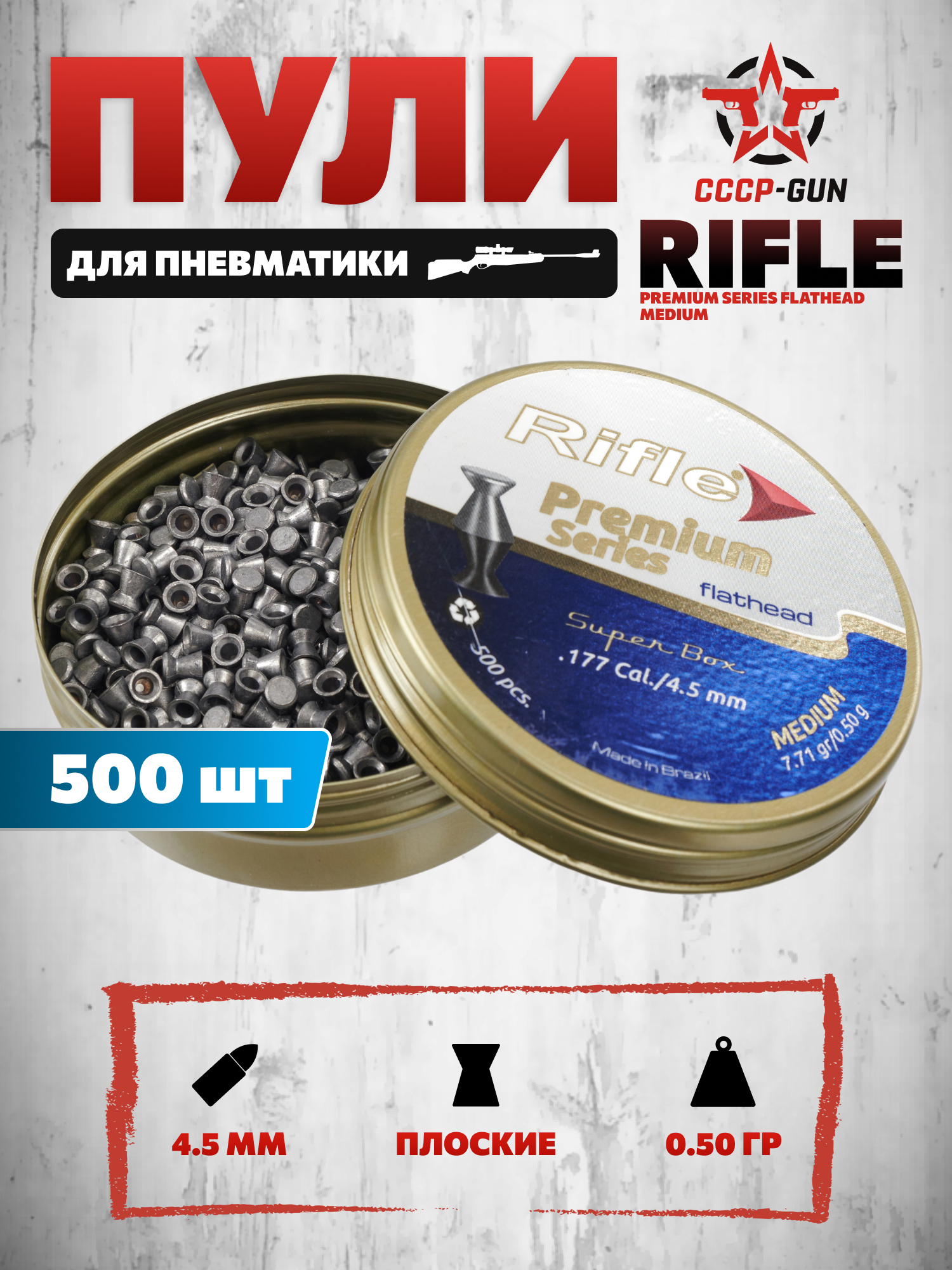 Бразильская компания Rifle занимает прочную позицию на рынке выпуска боеприпасов для пневматики. Под брендом выходит линейка товаров, созданных с учетом разных потребностей пользователей - от развлекательной стрельбы до соревнований. Серия Premium включает тщательно откалиброванные пули, рассчитанные на точность, неизменную траекторию и минимальные отклонения.