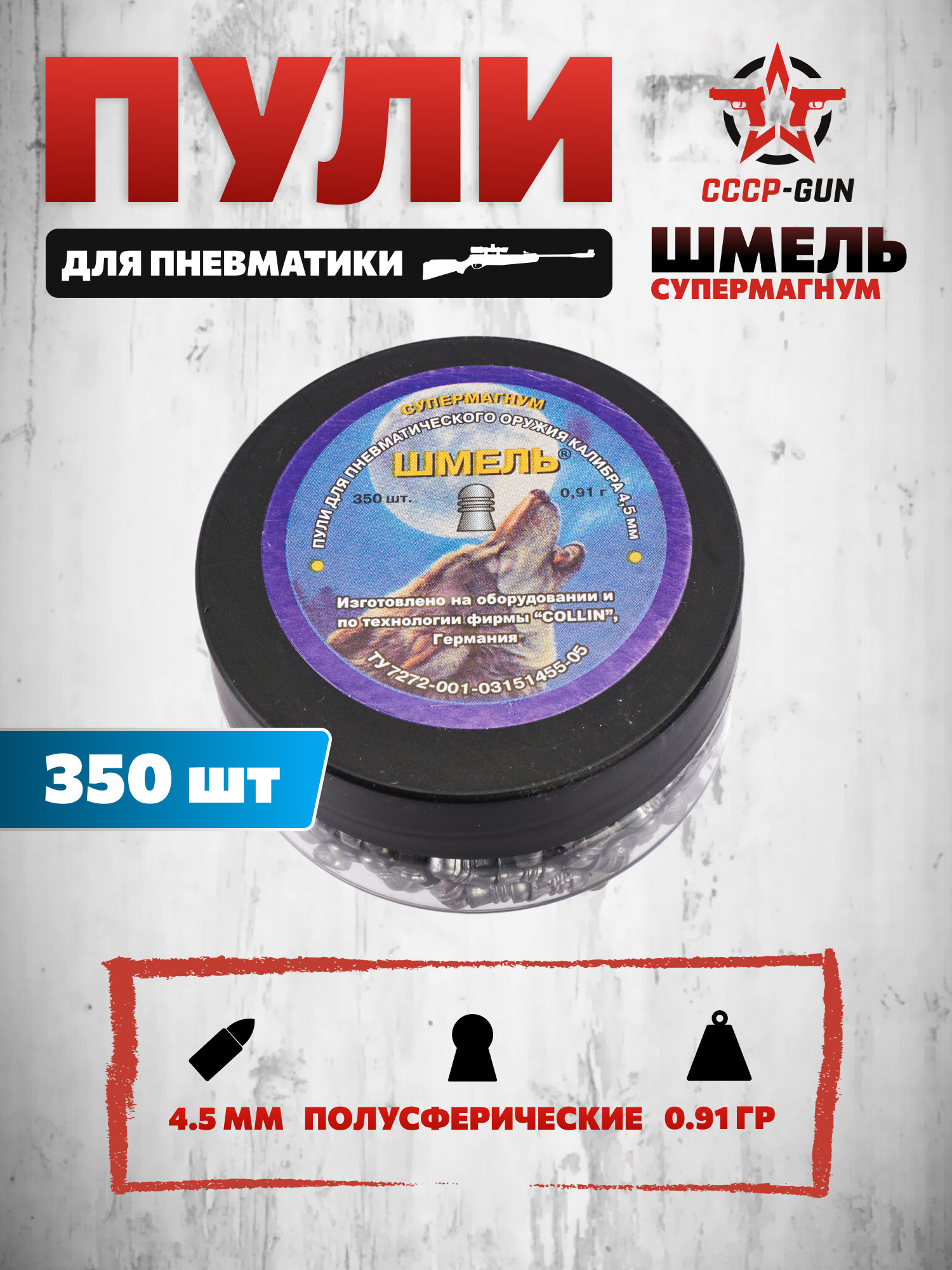 Обозреваемые пули Шмель 4.5 мм отличаются передней частью в форме полусферы, что положительно влияет на аэродинамические показатели. Производитель указывает, что вес одного заряда в партии составляет 0.91 грамма - отмеченный параметр важно учесть перед покупкой относительно мощности используемой пневматики.