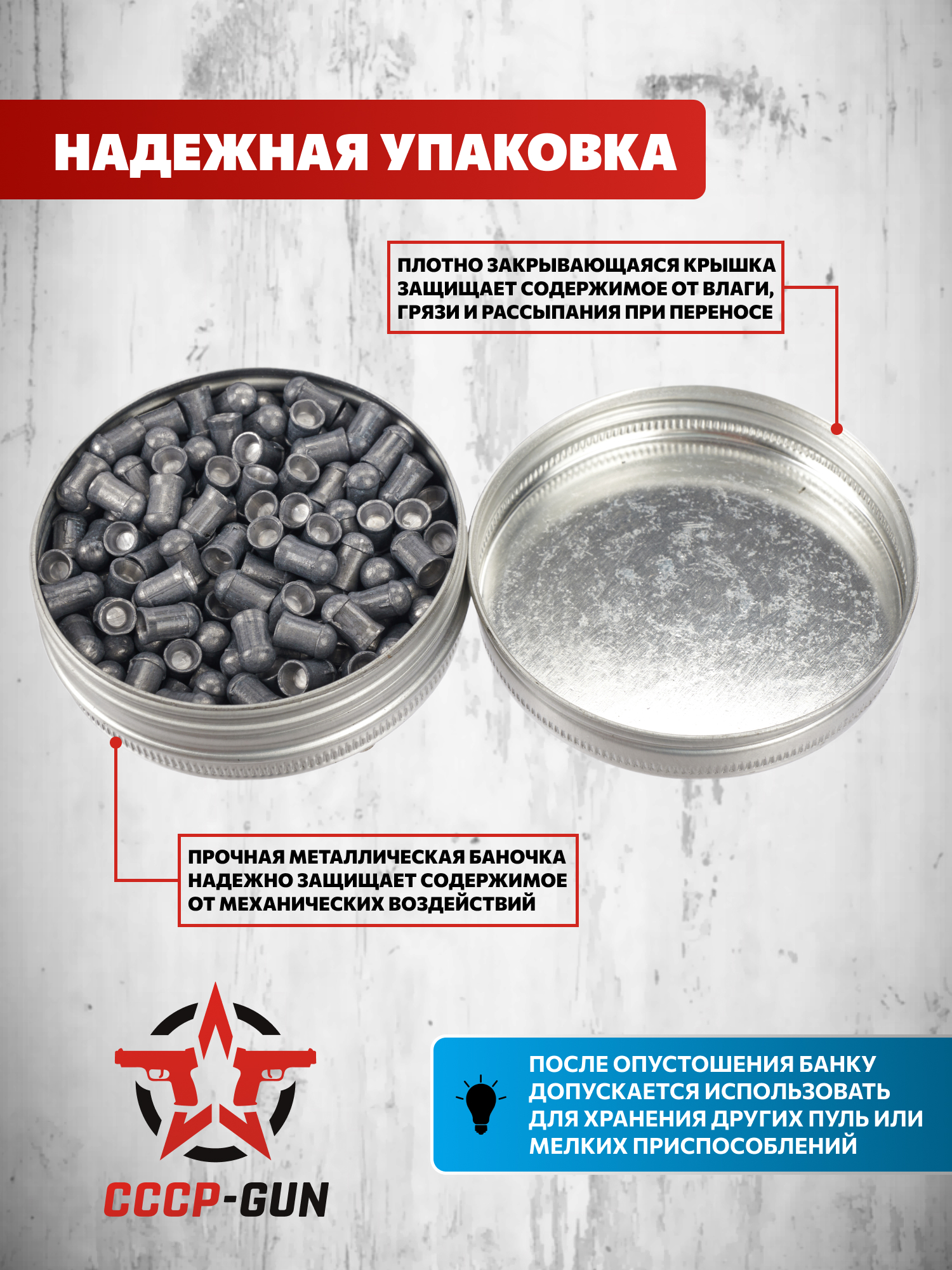 В комплект входит 200 снарядов, расфасованных в металлическую банку с плотной крышкой. Такая упаковка защищает пули тяжелые для пневматики 5.5 мм от влаги, механических повреждений и практична при переноске. Количества "воланчиков" хватит для работы в тире и стрельбы в полевых условиях.