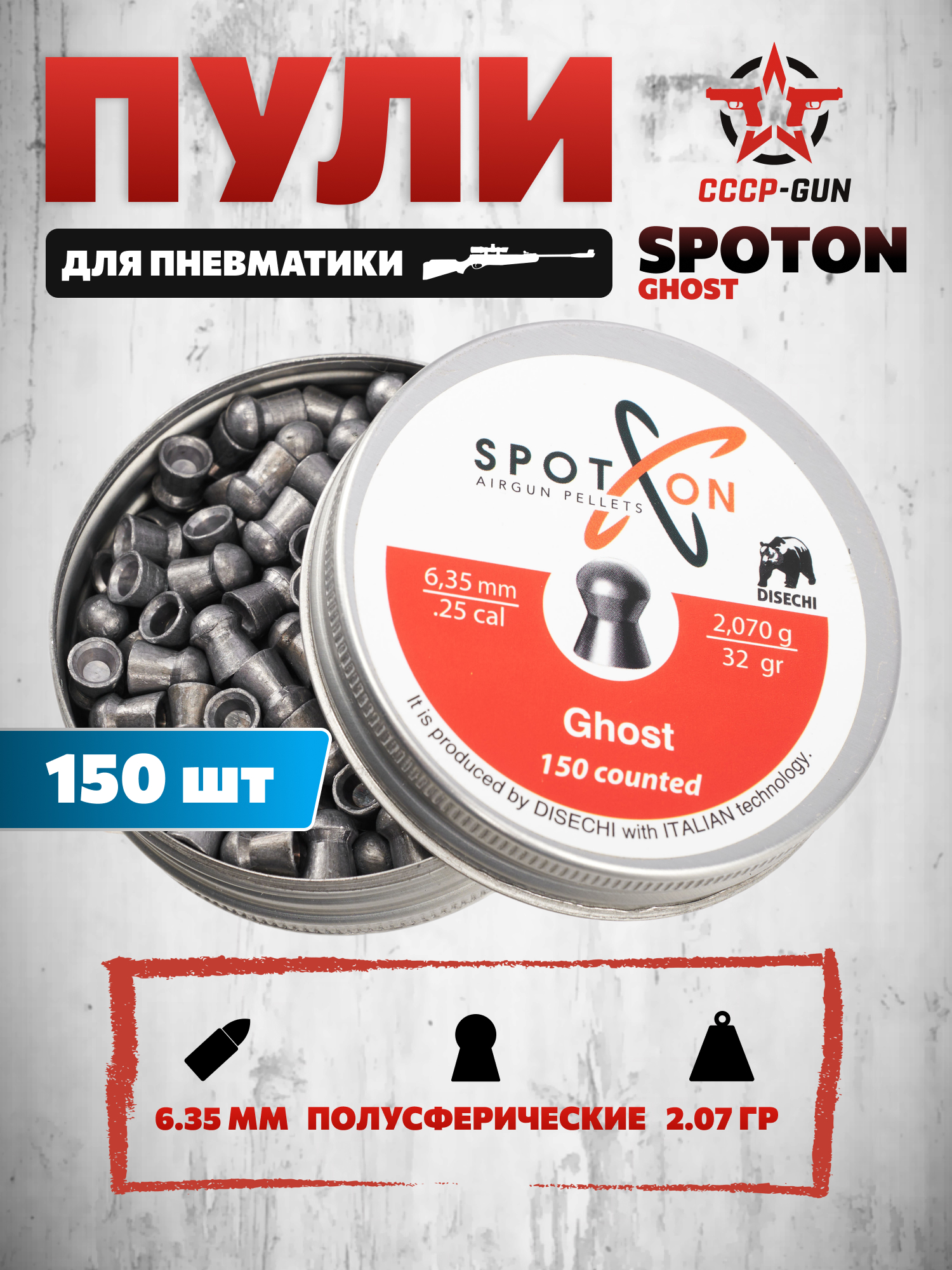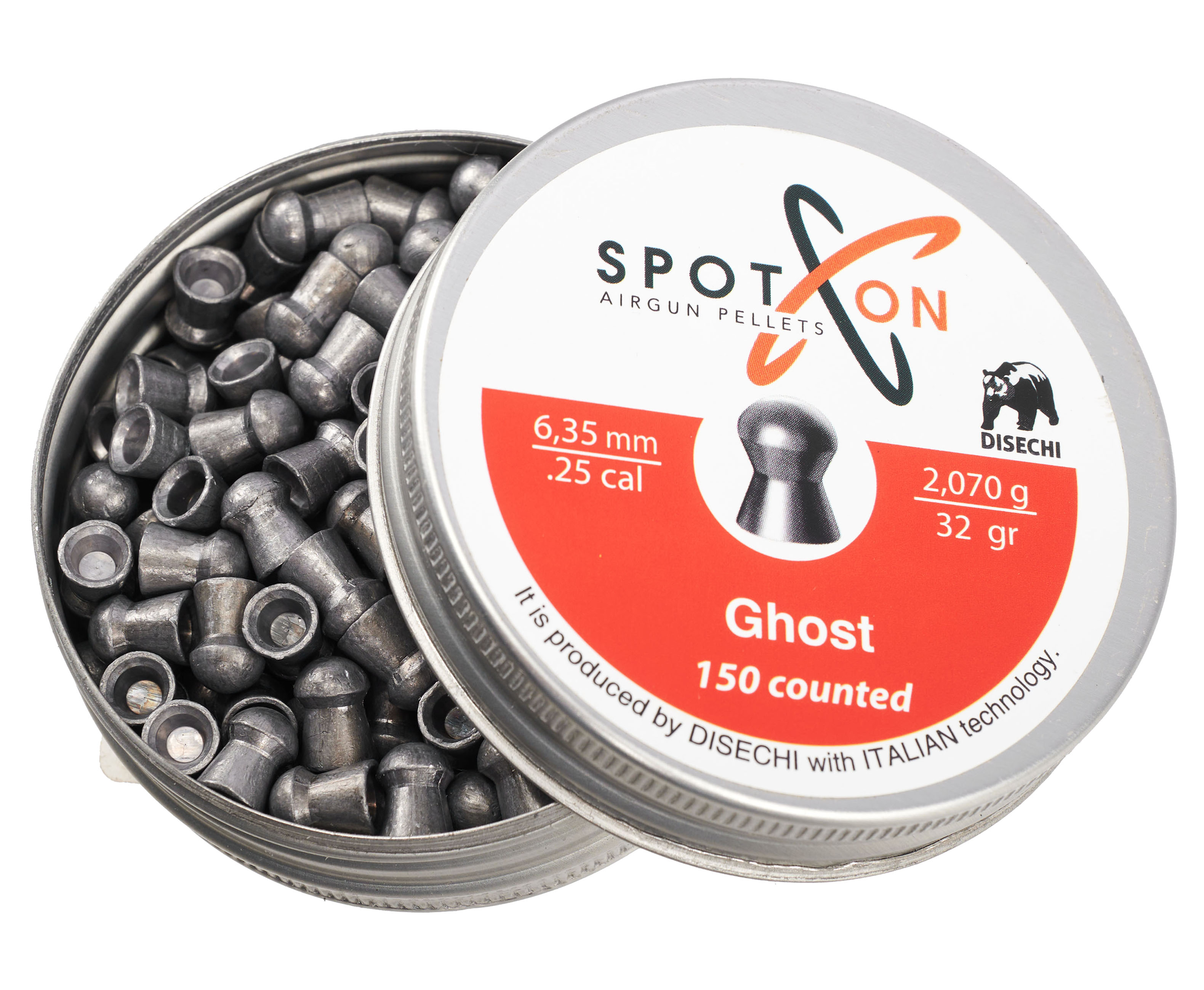 Пули Spoton изготавливаются с применением итальянских технологий литья. Продукция ориентирована на стрелков, использующих пневматическое оружие с предварительной накачкой воздуха, и включает линейку боеприпасов с высокой однородностью. Серия Ghost предназначена для работы на результат.
