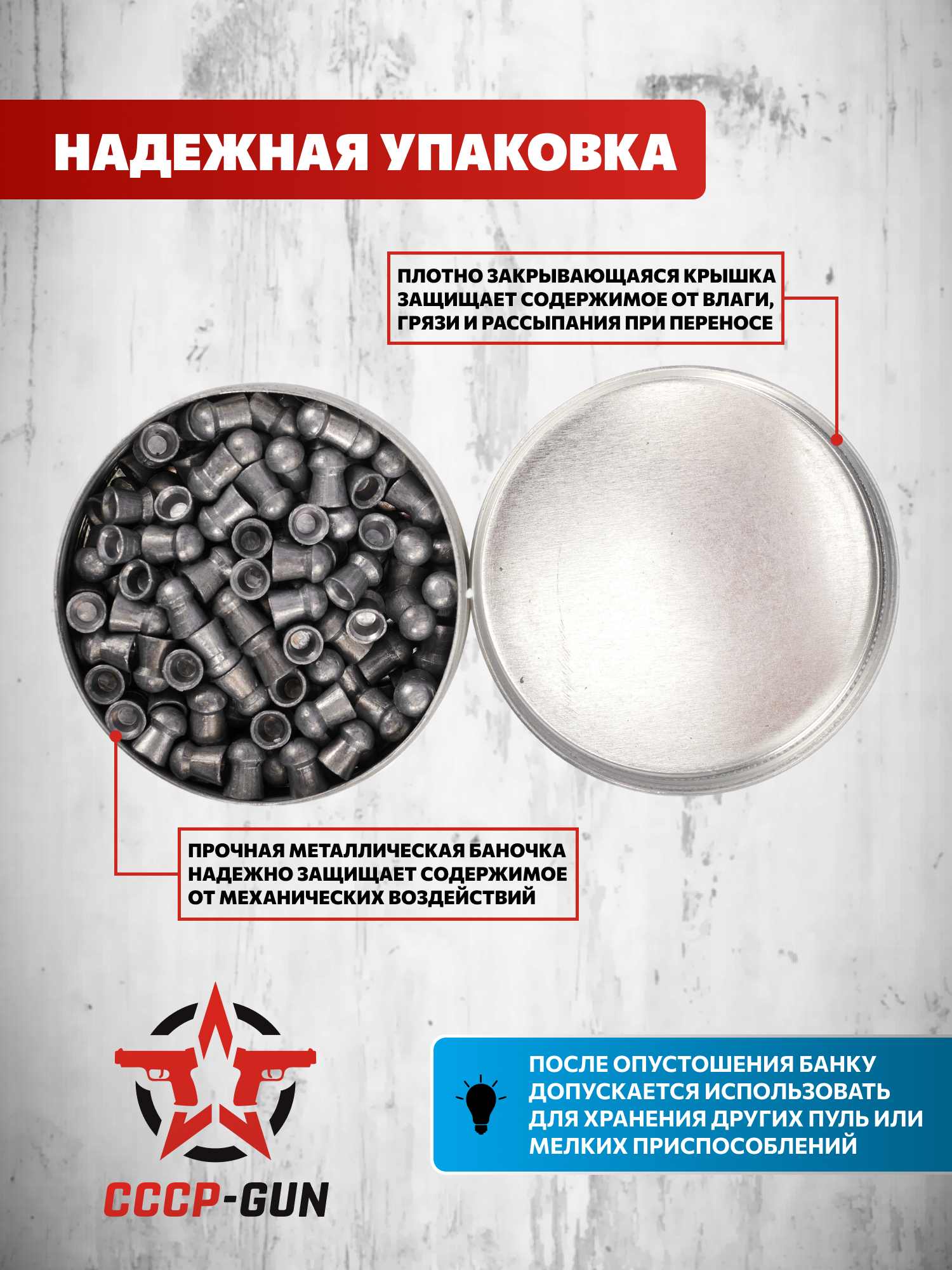 В комплекте - 150 штук. Поставляются боеприпасы в металлической банке с крышкой, предохраняющей содержимое от влаги и механических повреждений. Упаковка легко открывается и подходит для многократного использования в полевых условиях.