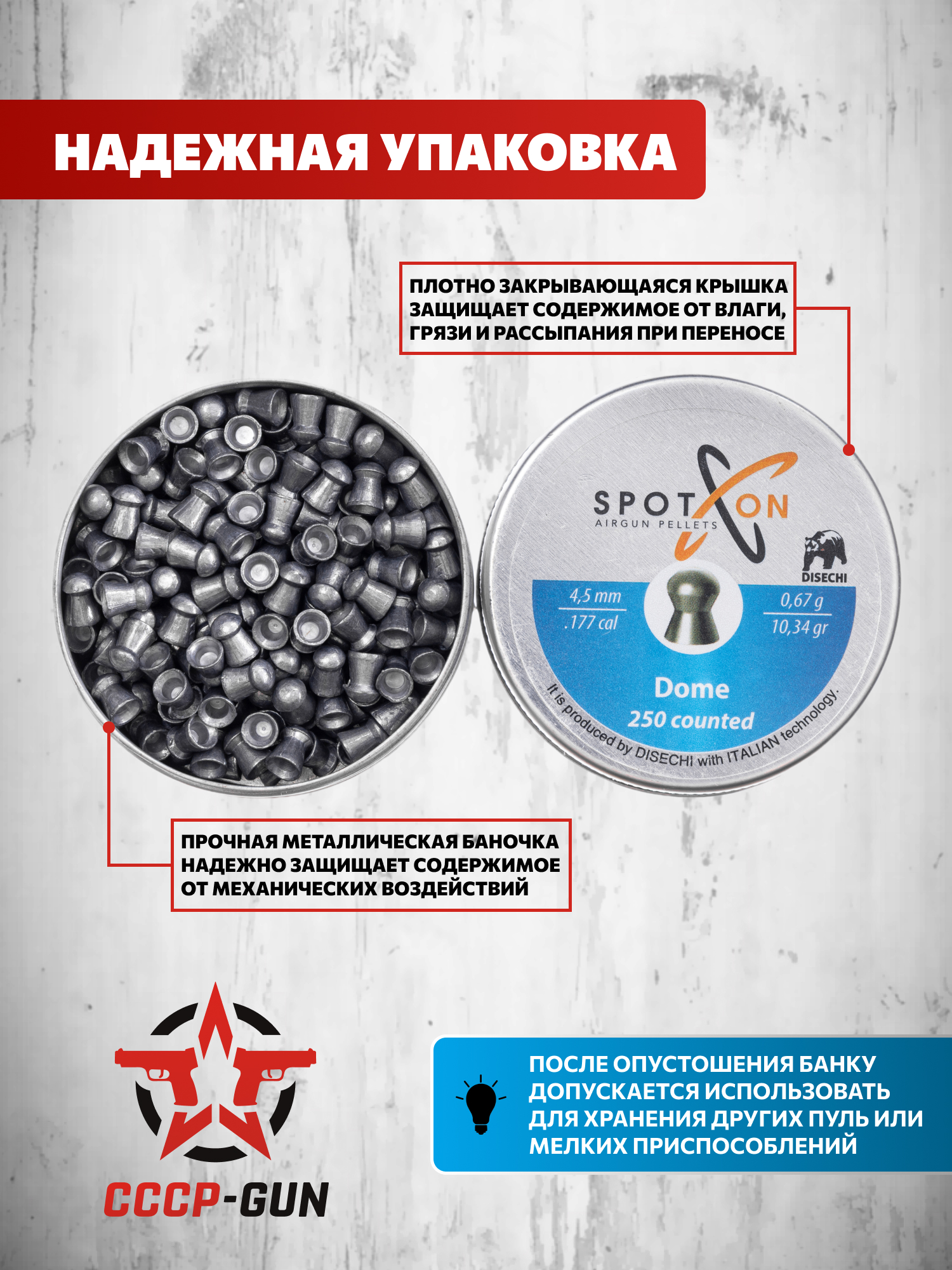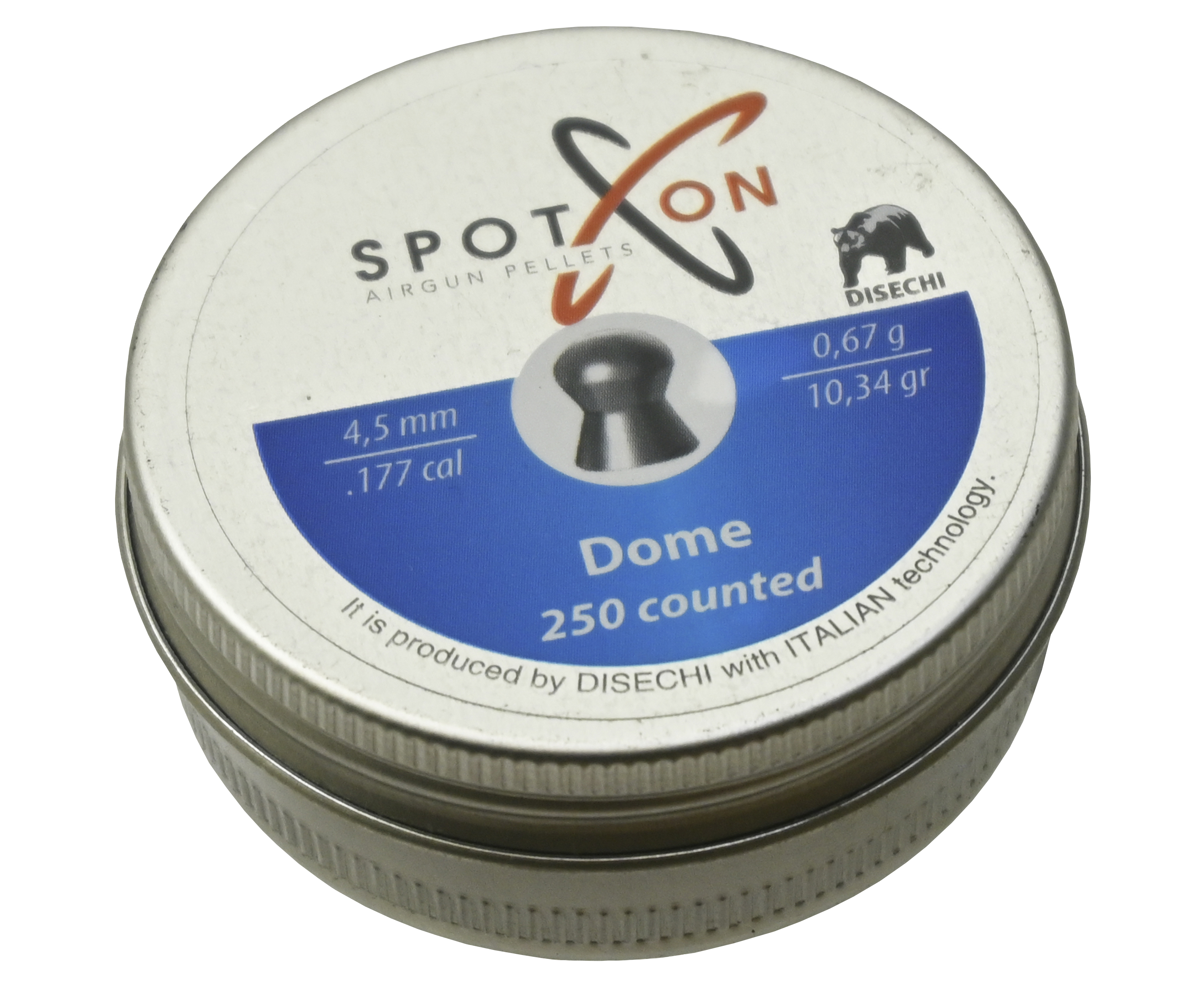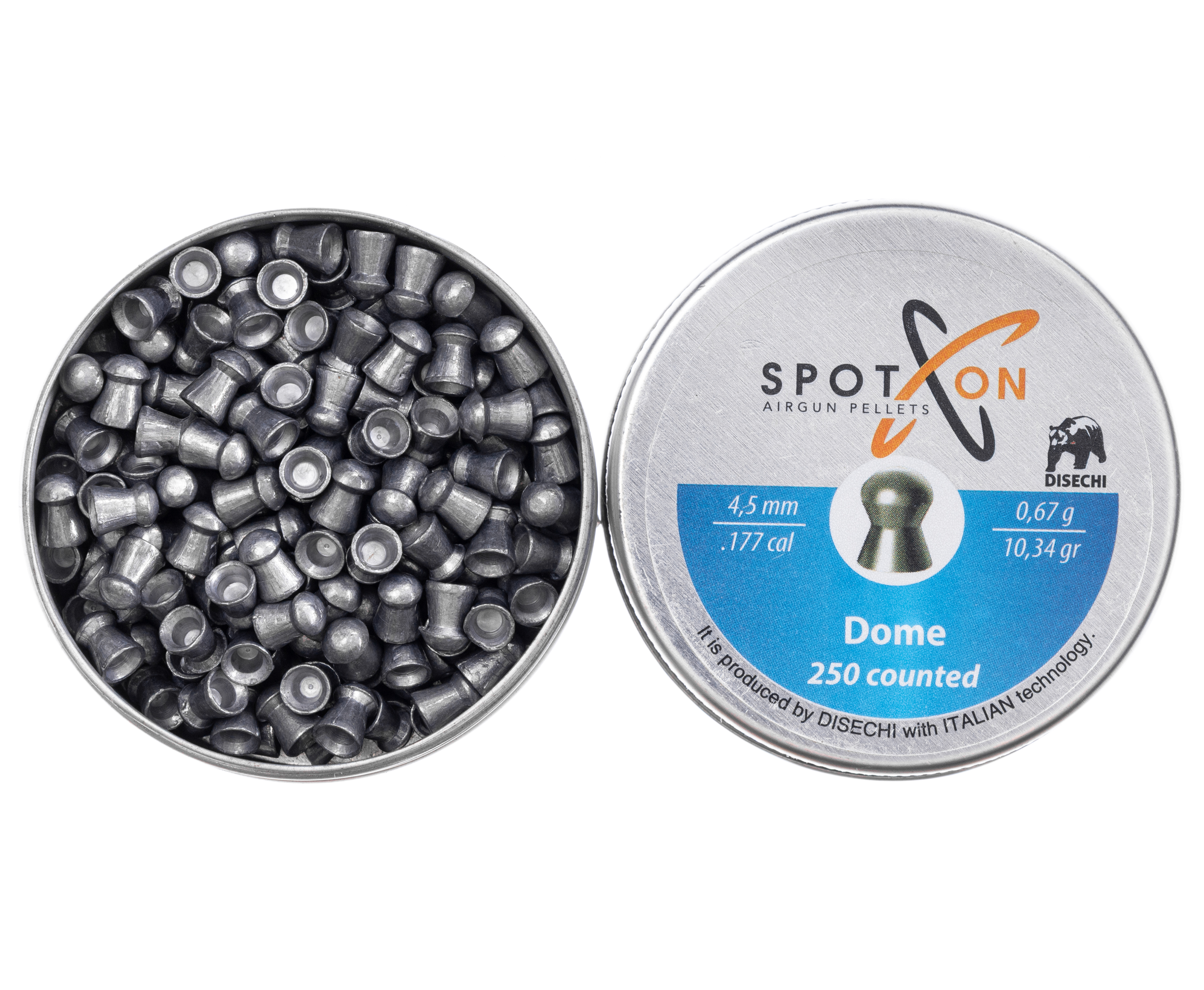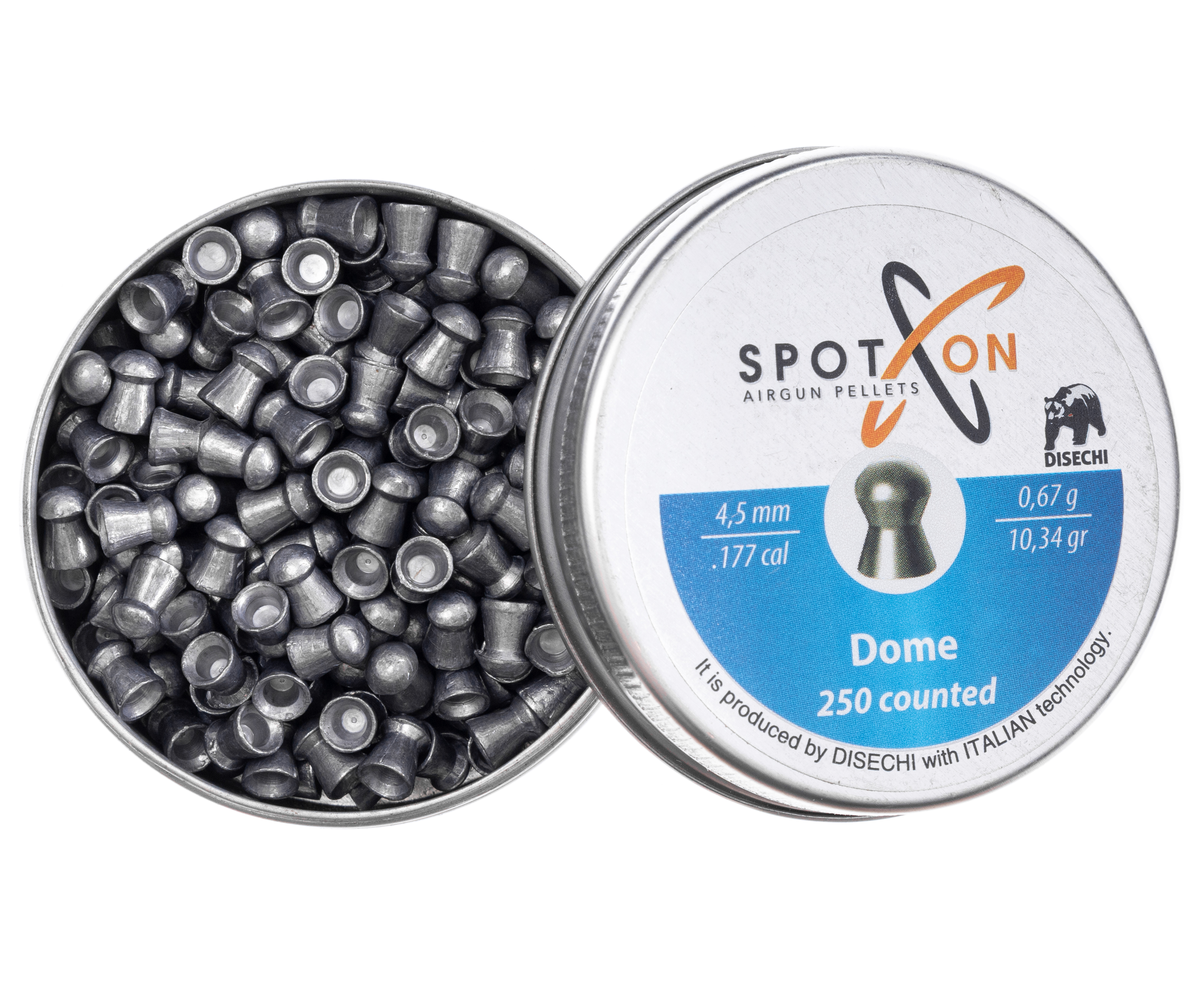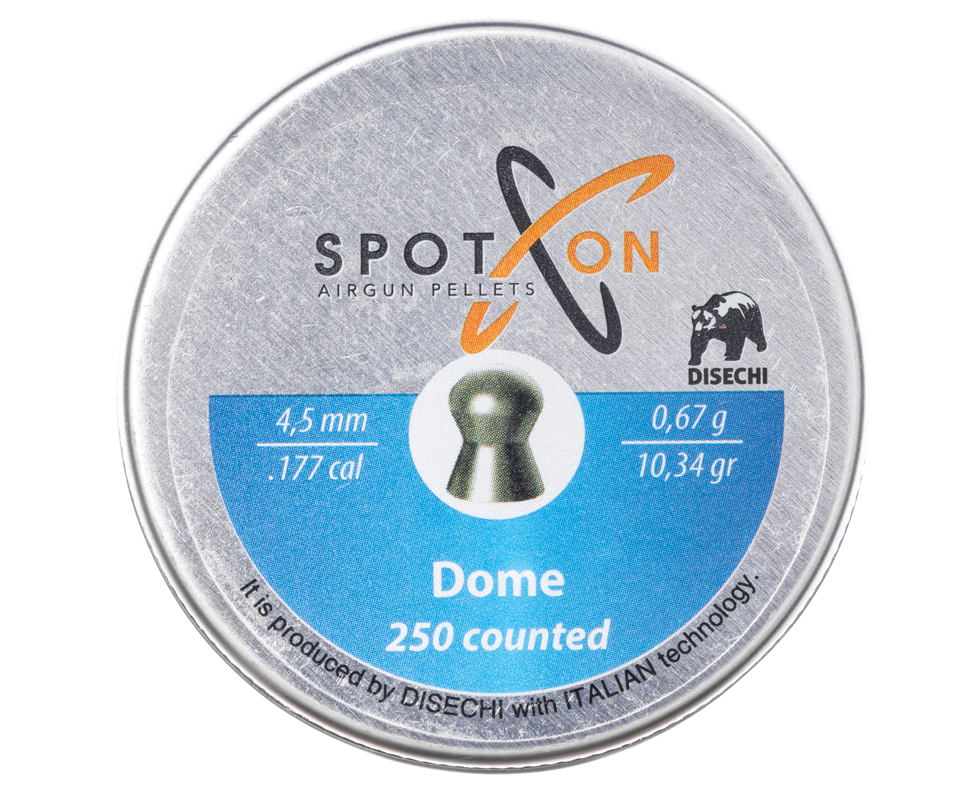В конкретном случае линейка Dome от производителя Спотон предназначается для эксплуатации с пневматическим оружием традиционного калибра 4.5 миллиметра. Сырьем для производства служит очищенный свинец, изготовление при помощи автоматического станочного оборудования гарантирует формирование идентичных экземпляров в партии. Отклонения геометрических показателей и массы сведены к минимуму при номинальном значении последней 0.67 грамма.