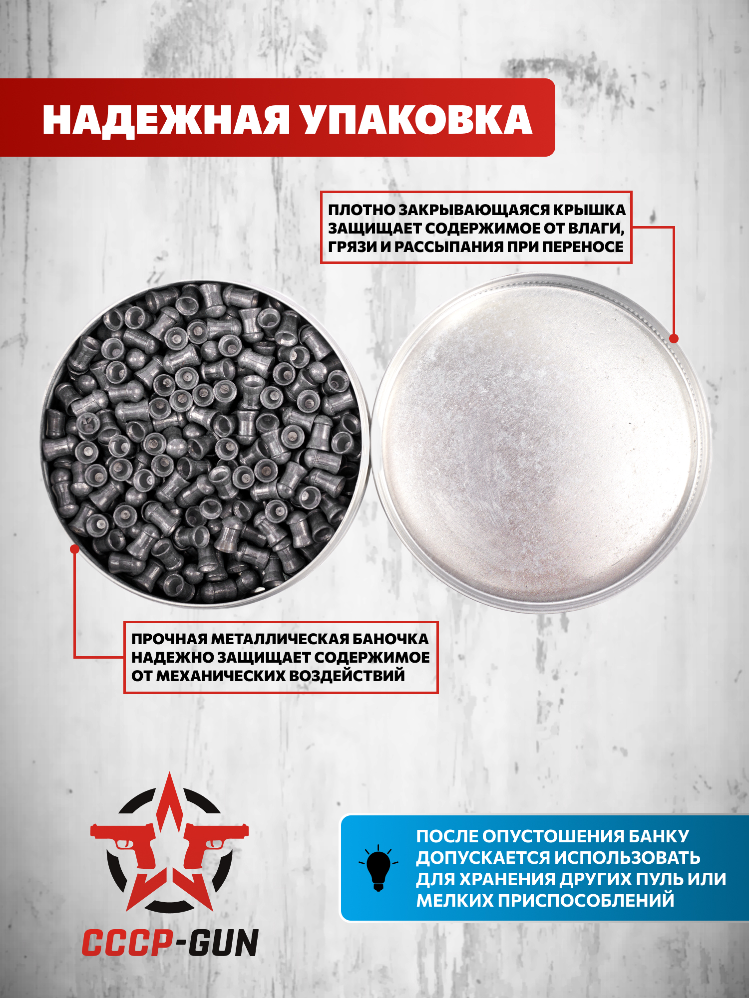 Пули Спотон фасуются по 400 единиц - для хранения используется прочная металлическая тара, чьи компактные размеры допускают ее размещение в небольших карманах экипировки. Крышка контейнера исключает риск загрязнения содержимого и блокирует рассыпание в момент переноса.