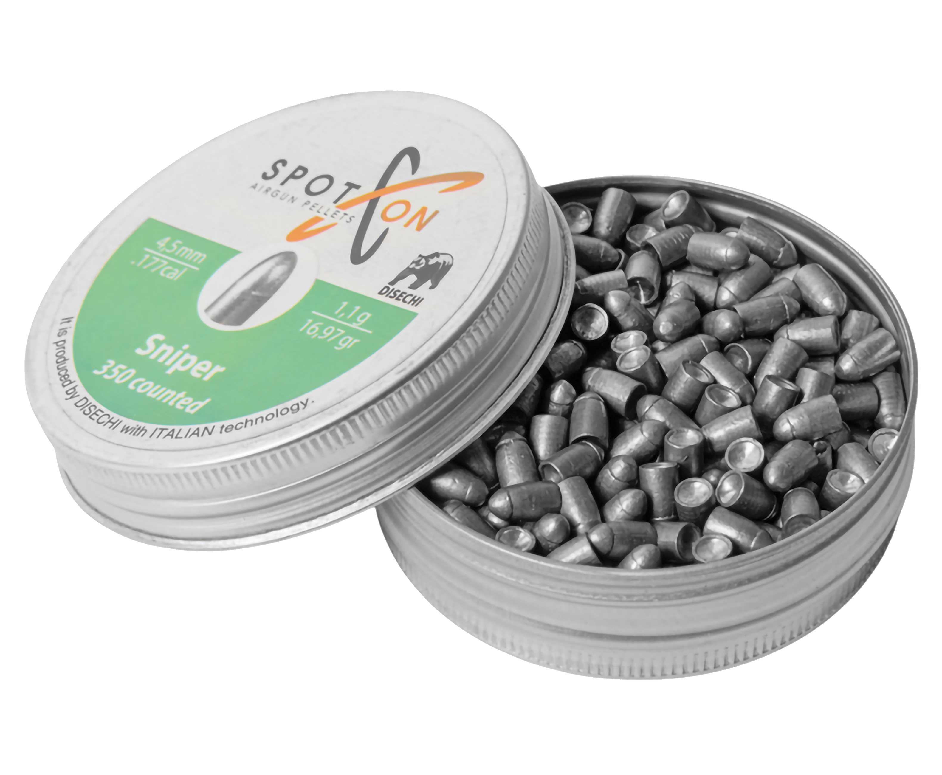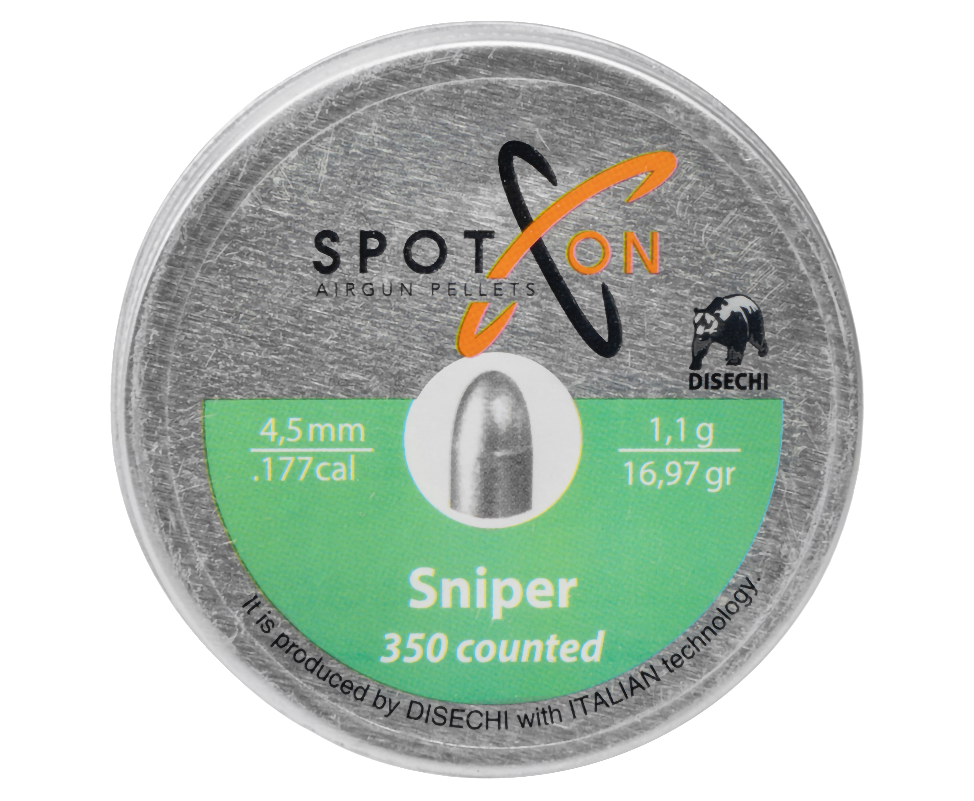 Пули модели Снайпер выполнили в калибре 4.5 миллиметра - типоразмер, получивший наибольшую популярность в практике создания пневматики. Заряды Спотон выполнили в полнотелой форме - геометрия подобного заряда предполагает предельное заполнение формы снаряда, что помогает увеличить вес - таким способом достигают повышения стабильности в полете вместе с повышением дульной энергии. В этом случае вес равен 1.1 грамма.